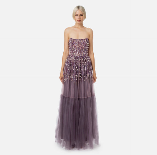 Pleated red carpet dress in lurex jersey with embroidery