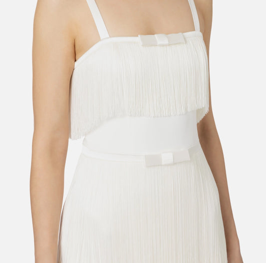 Mini-dress in crêpe fabric with fringes and bow
