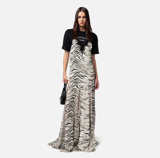 Long dress in viscose georgette fabric with animal print