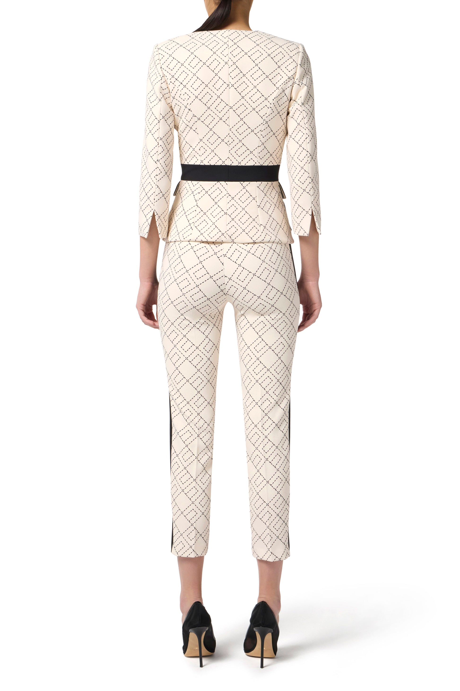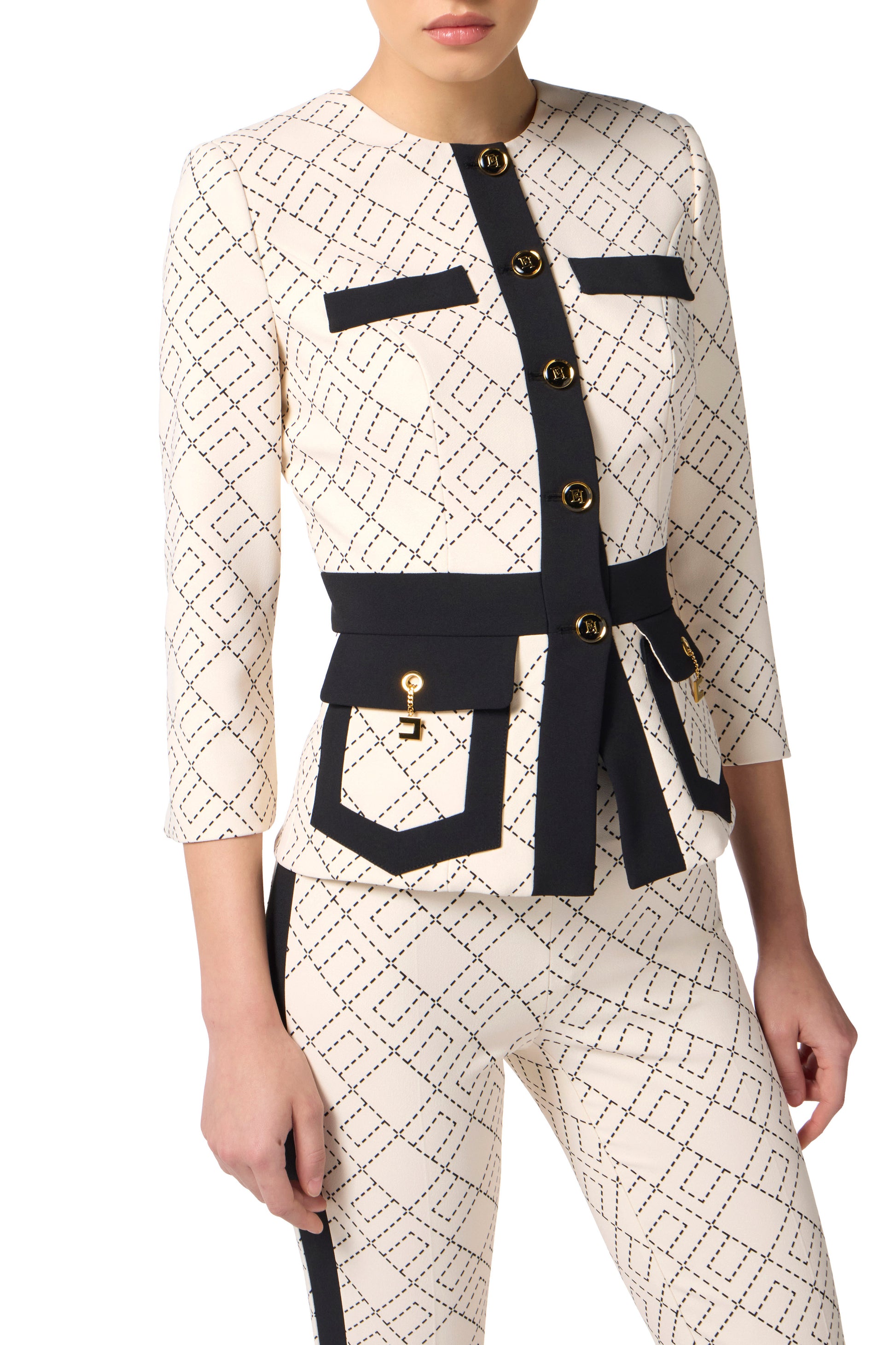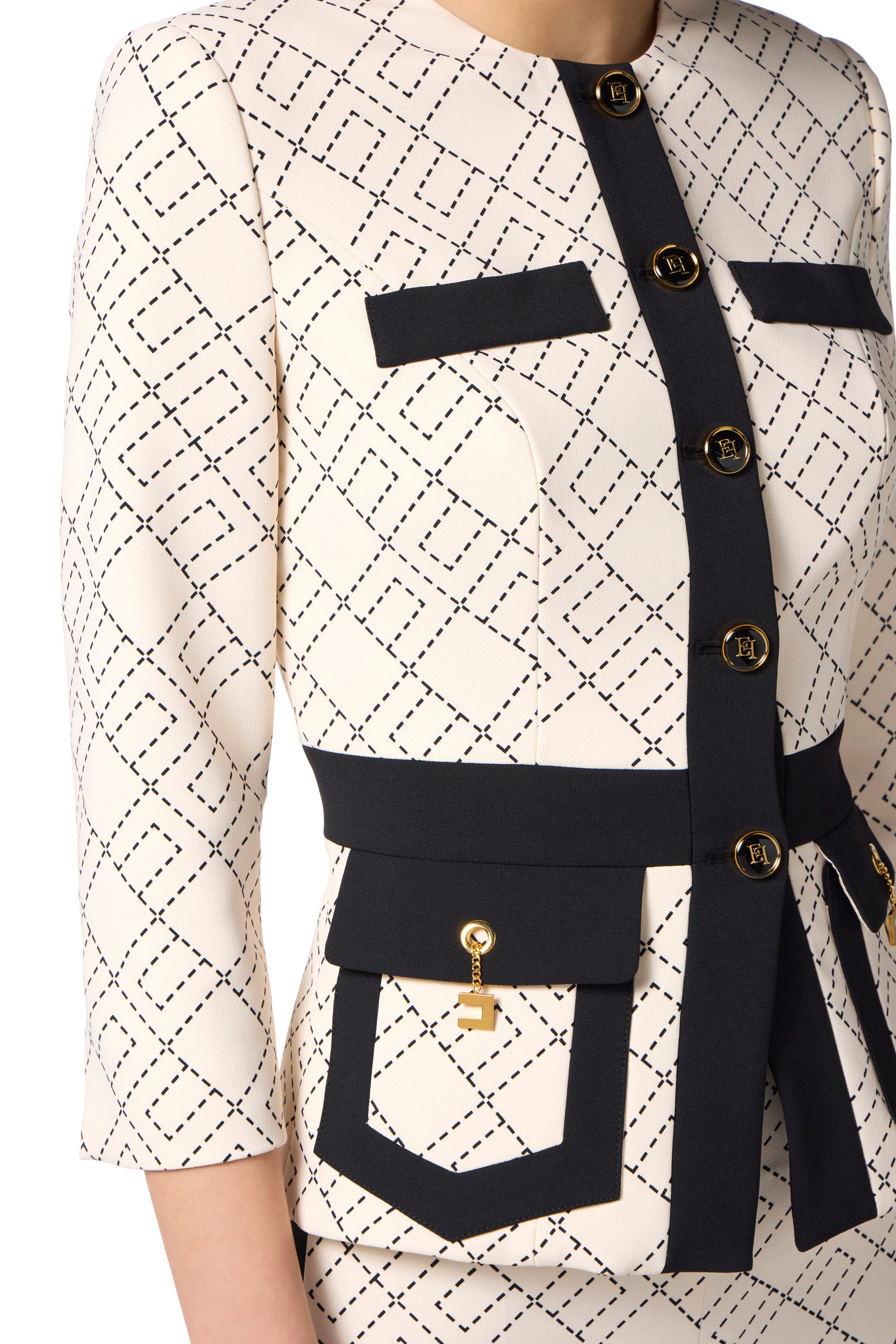 Double crepe jacket with a fitted fit with structured shoulders and 3/4 sleeves. It stands out for the bi-color play created by the all-over logo pattern and contrasting color details. Dangling chain cufflinks and enameled logo buttons add movement and light.