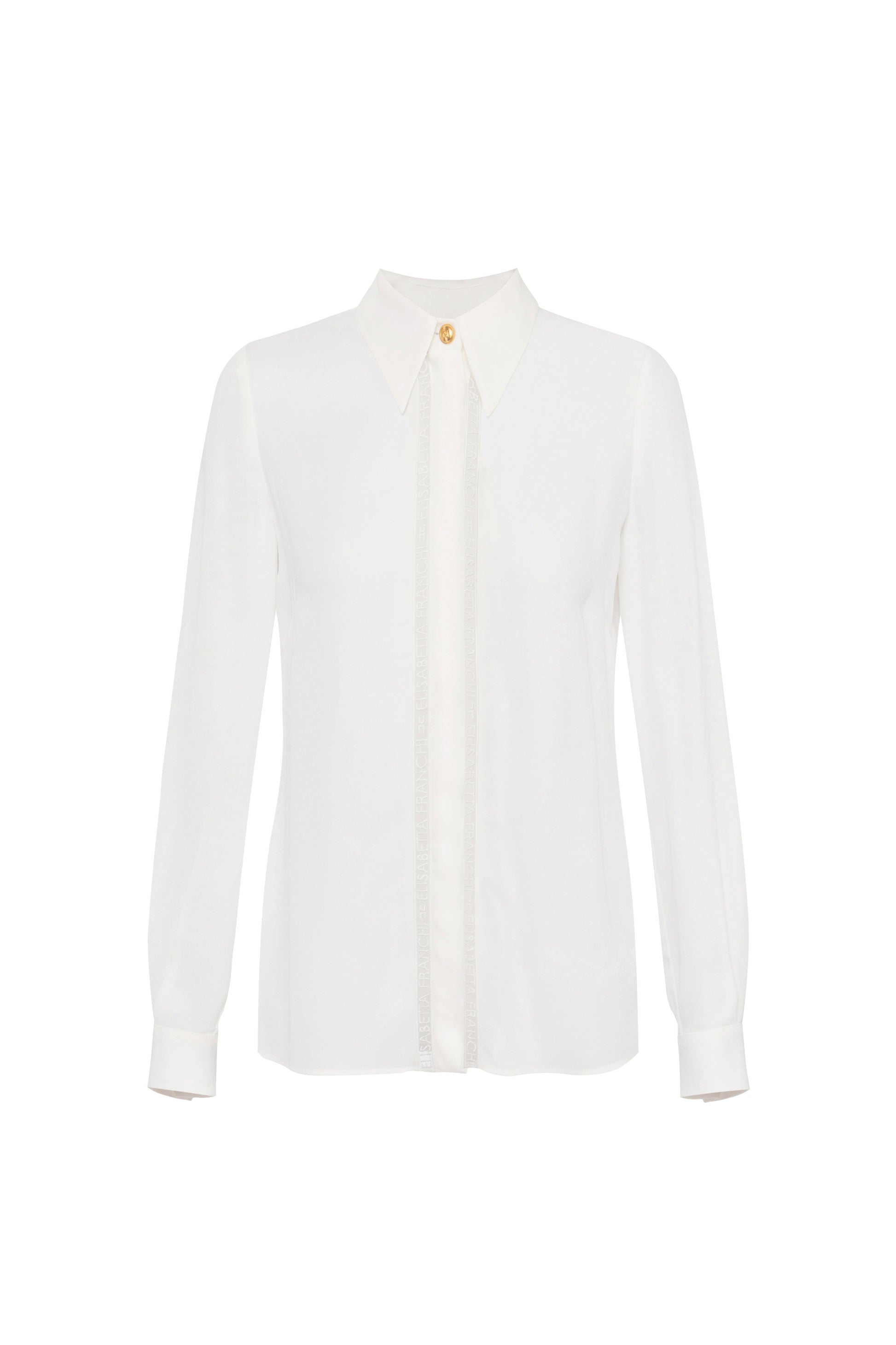 Regular blouse in viscose georgette fabric with a clean line. The garment features long sleeves and a small button placket decorated with organza bands embroidered with logo lettering. The first visible button and those on the cuffs in golden tones provide a touch of light.