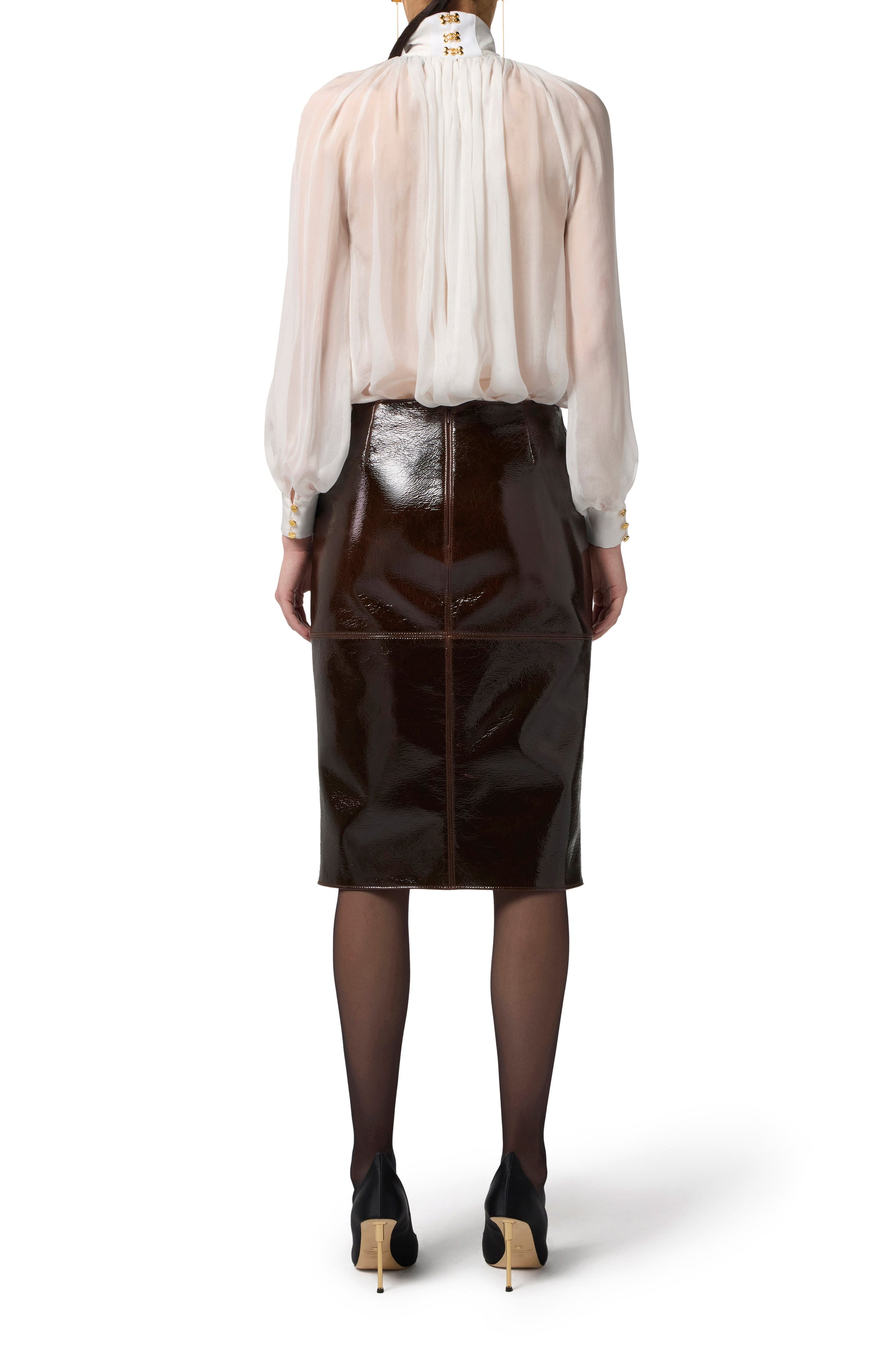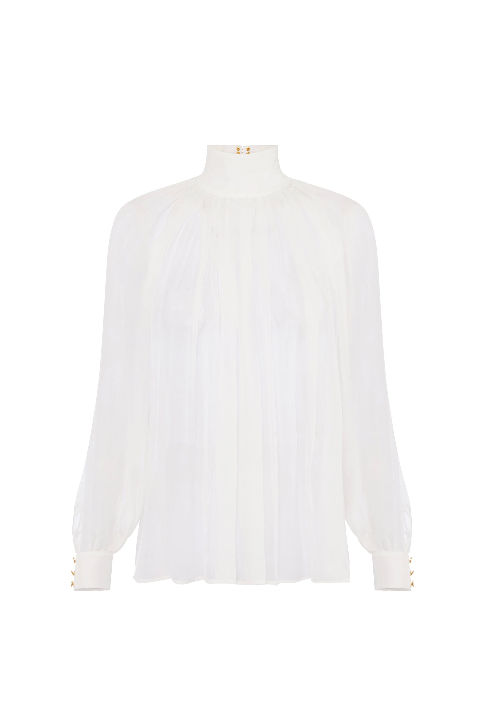 Blouse in voile fabric with slim fit. It has a high collar with golden metal clasps at the back and long sleeves with cuffs at the bottom. The pleating gives refined movement to the garment.