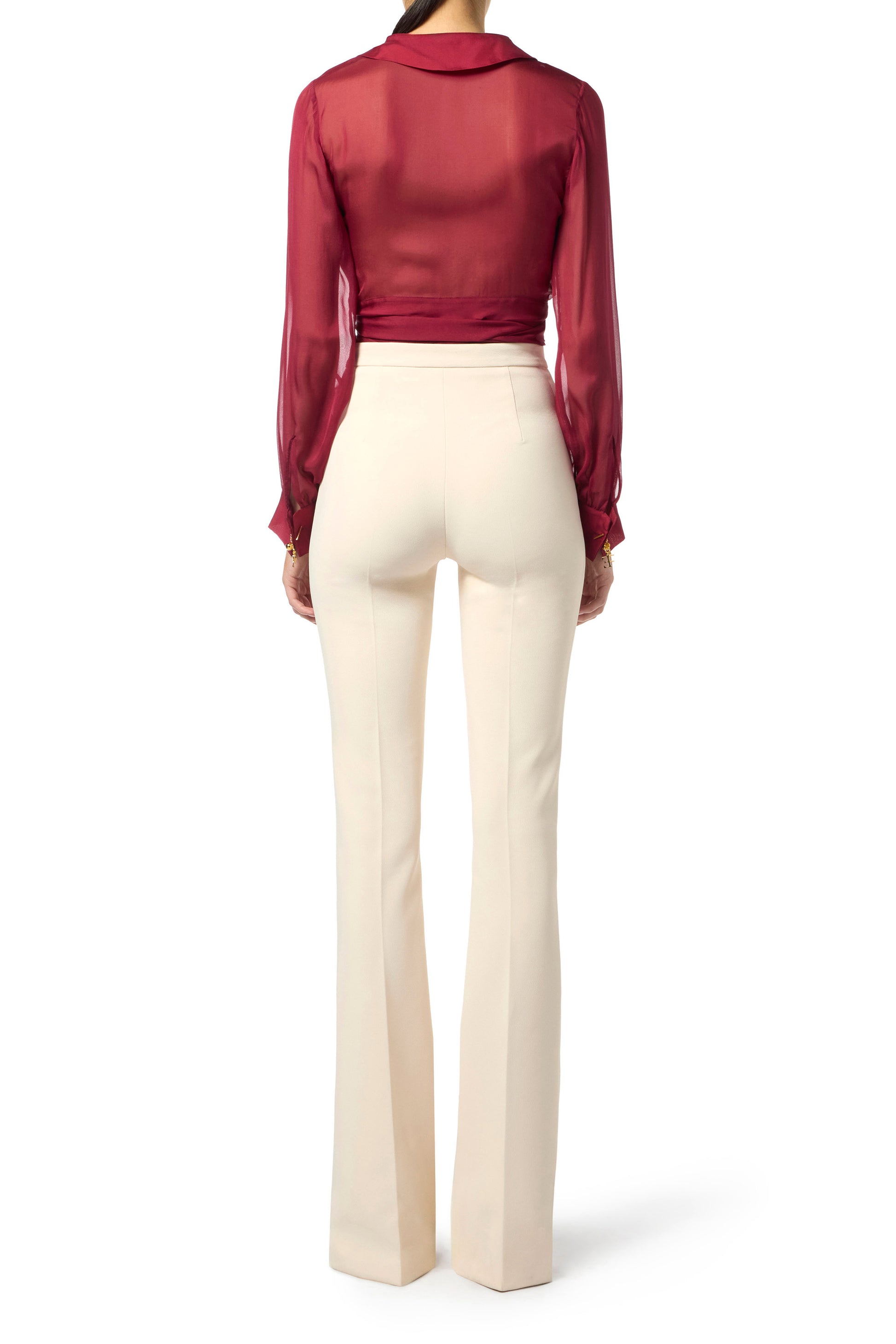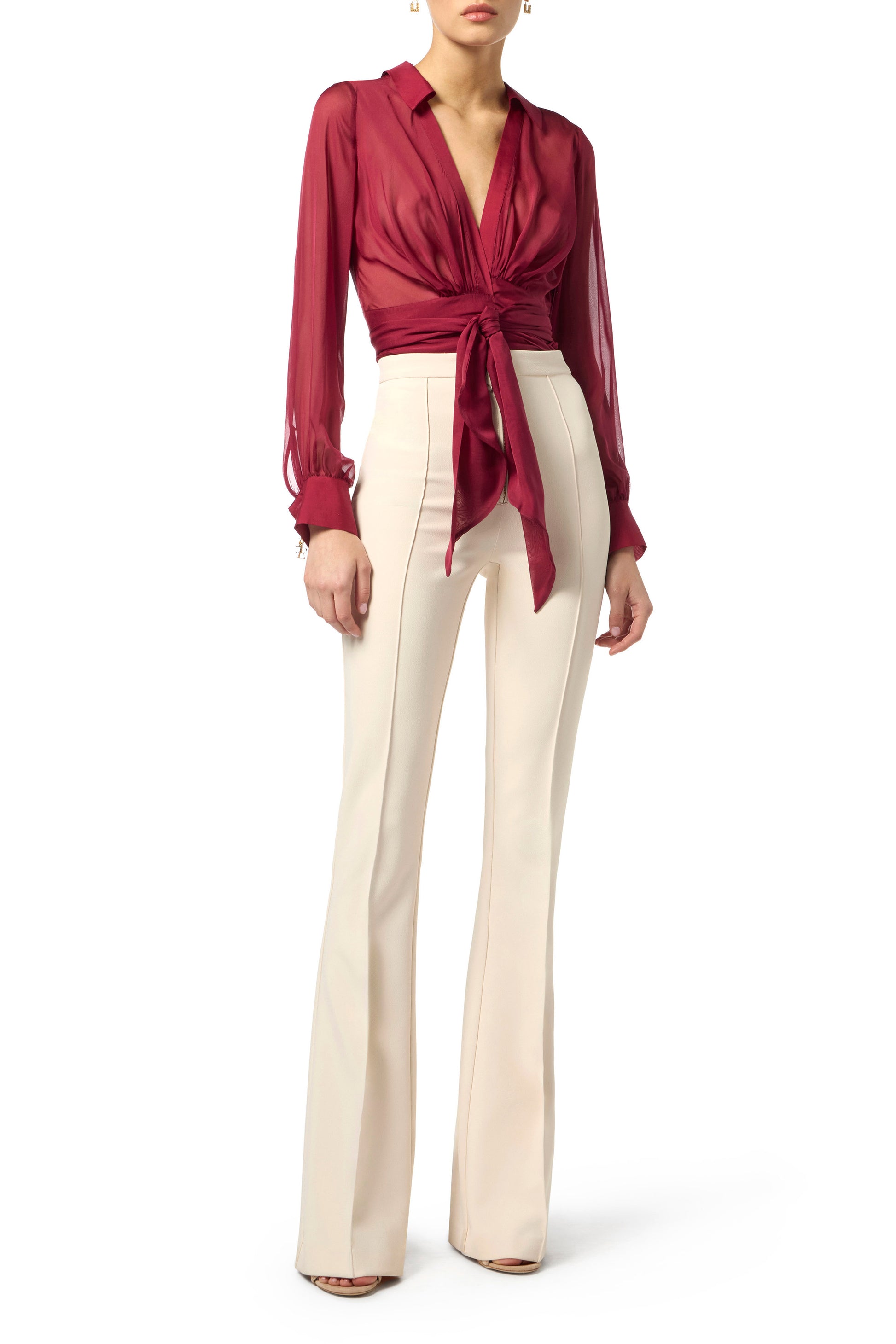 Blouse in voile fabric with slim fit. With collar and crossover v-neck, it has long sleeves with cuffs embellished with jewel cufflinks with charms. The focus is on the sash belt to be crossed and tied at the waist for a final stylish detail.
