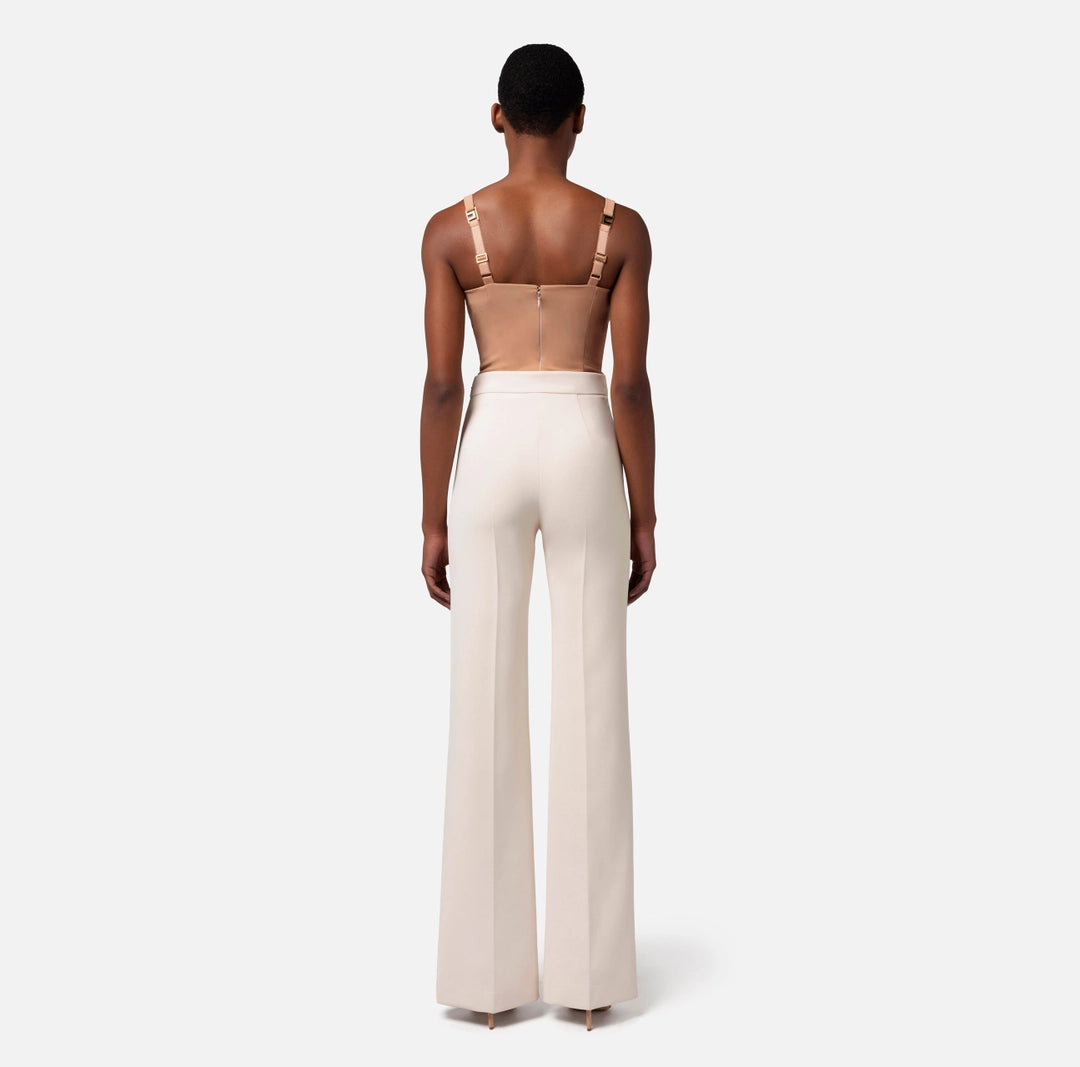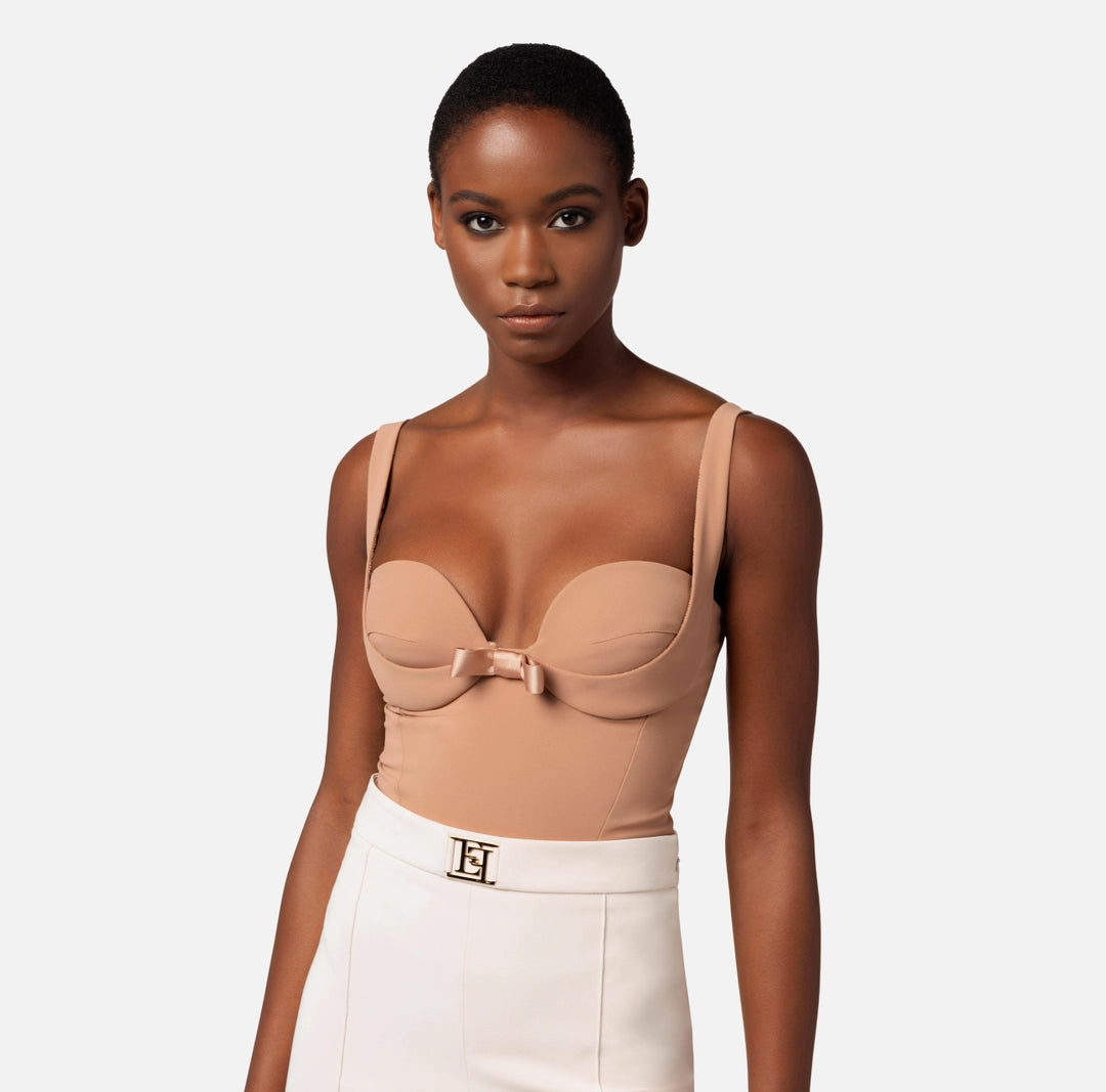 Bodysuit in stretch lightweight crêpe fabric with corset motif cuts that outline the silhouette. It features a bustier top with matching flat shiny satin bow on the neckline.