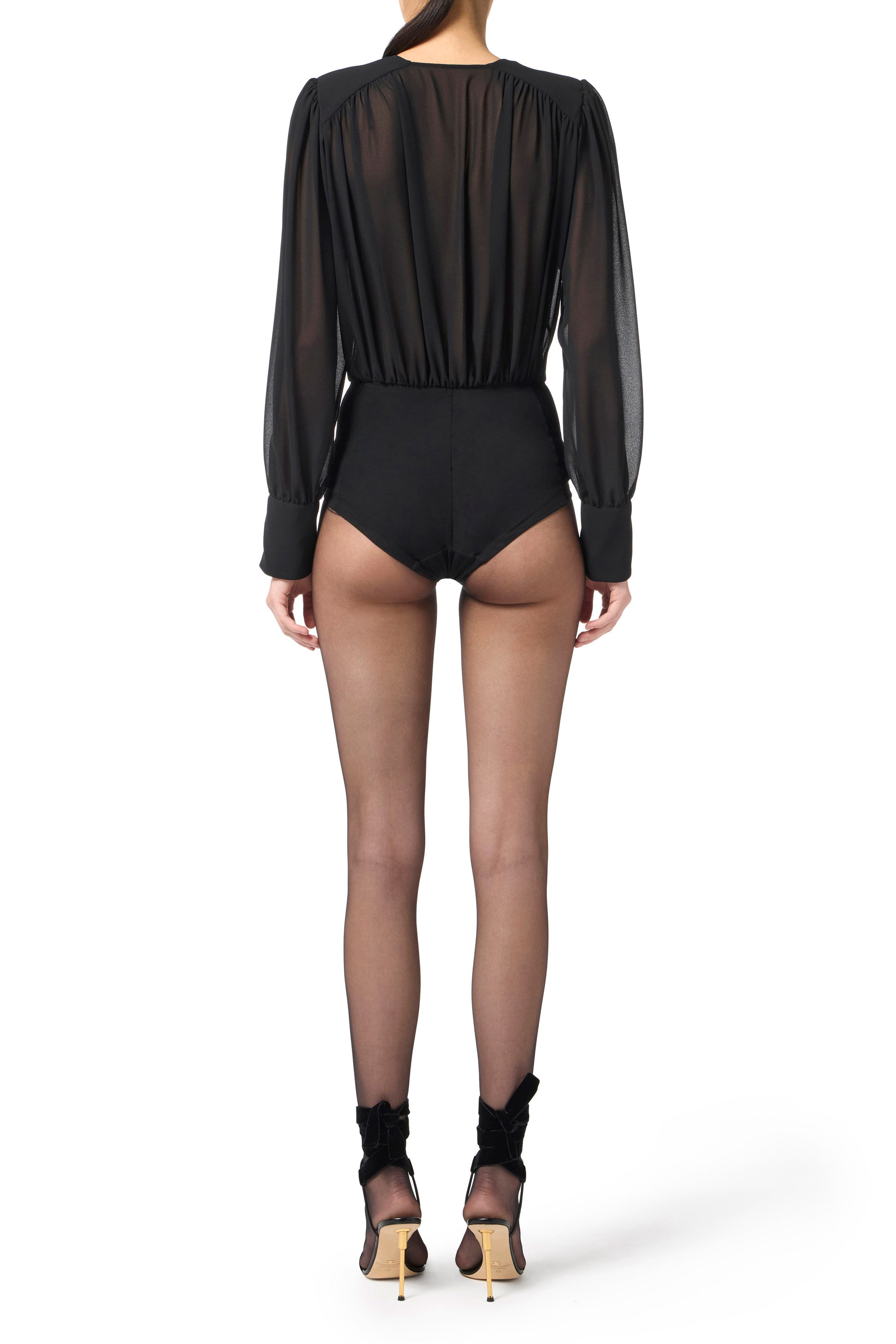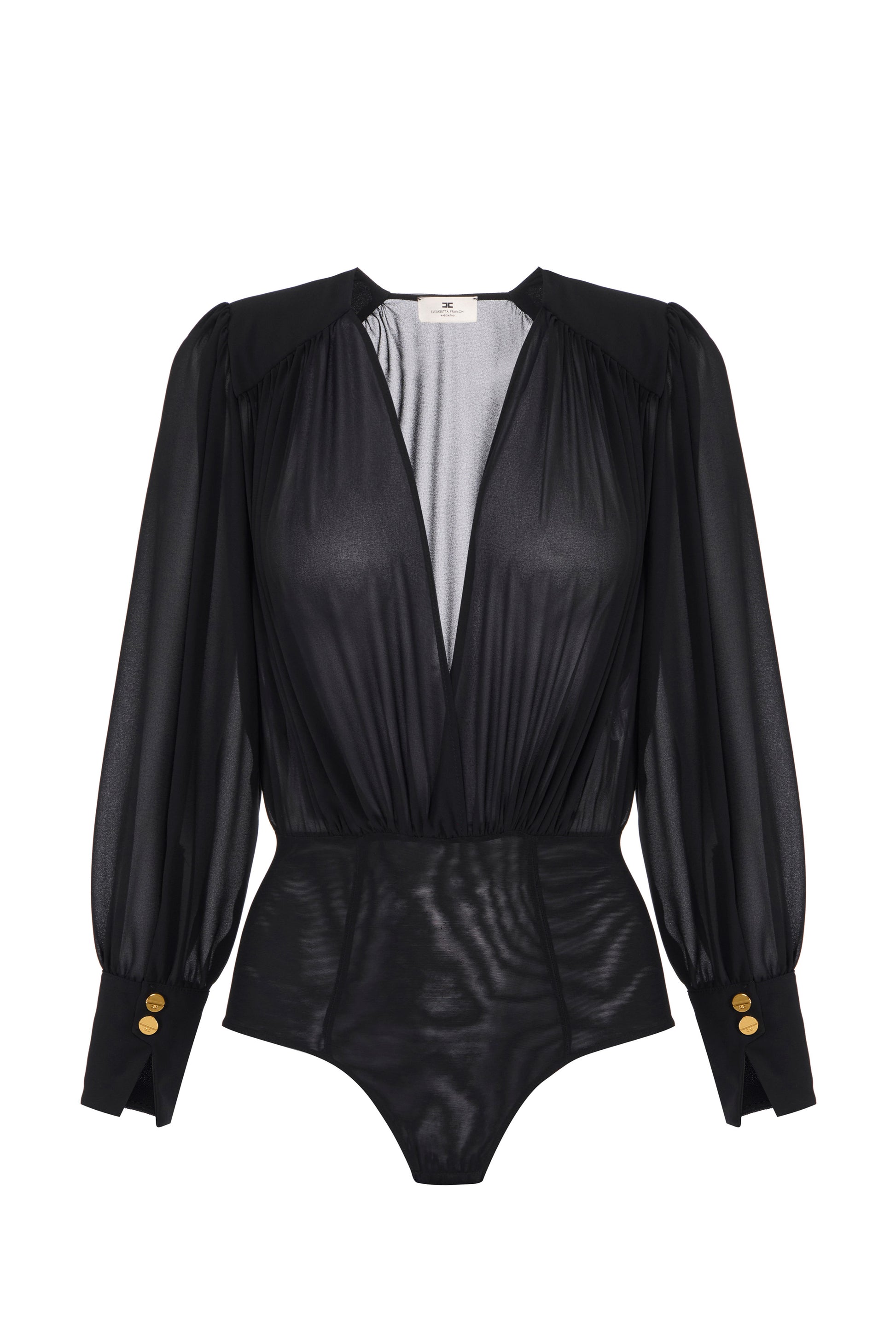 Bodysuit in georgette fabric with slim fit. It has structured shoulders, a v-neck softened by fine draping and long sleeves with wide cuffs and slits embellished with golden metal logo buttons.