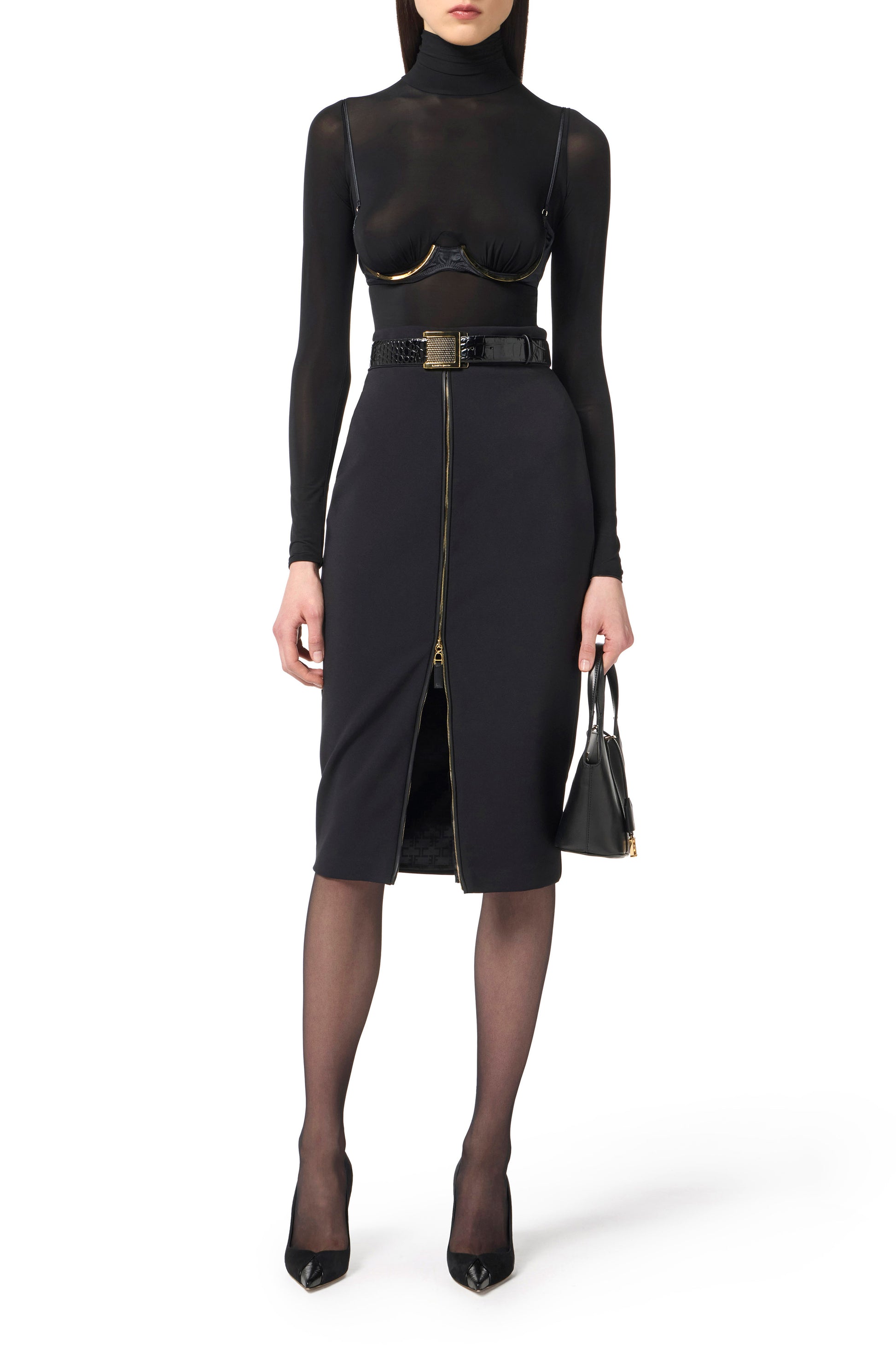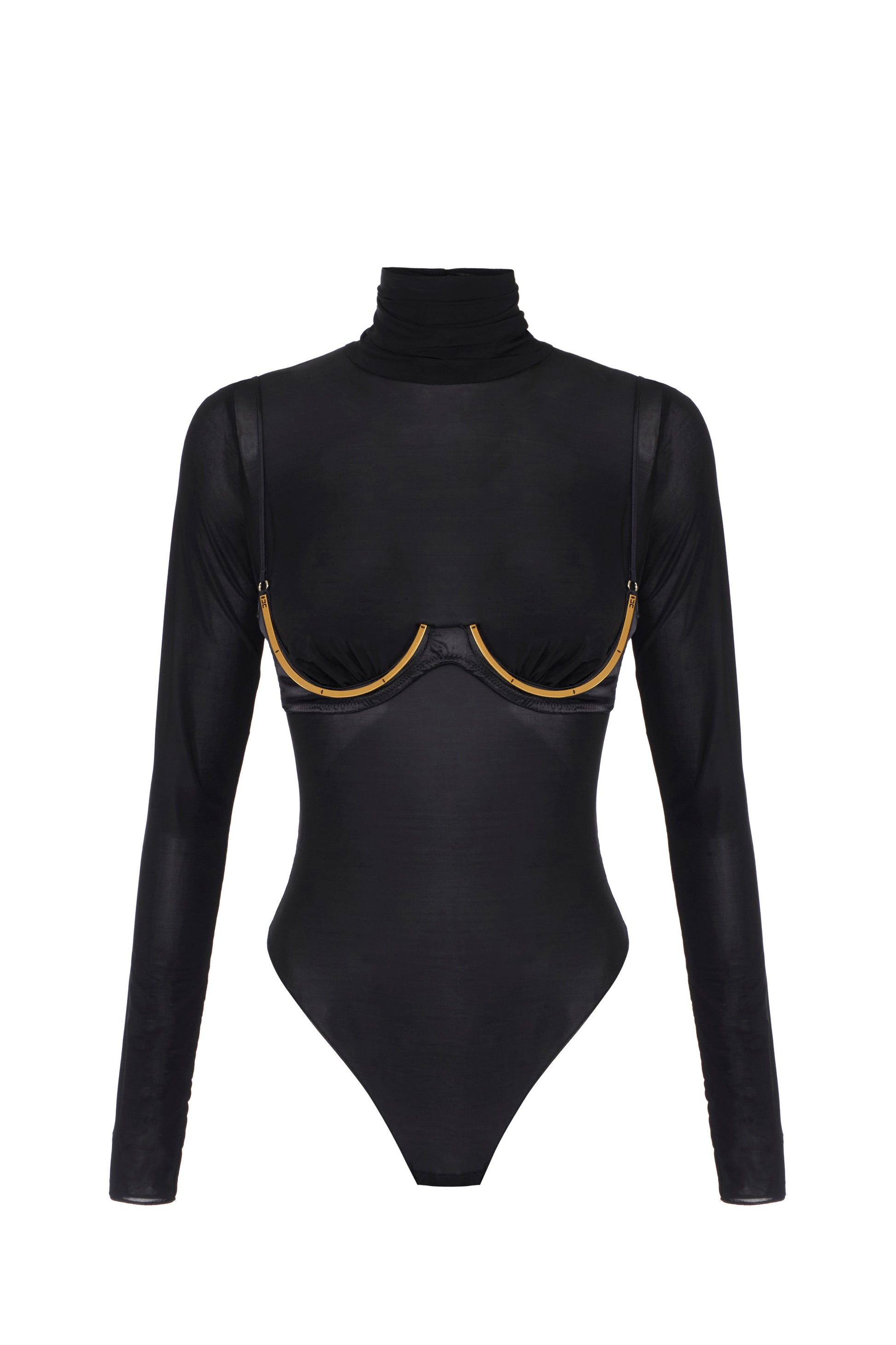 Jersey bodysuit with a slim fit. It features a high collar and long sleeves. It is characterised by an external satin bra without cups and embellished with golden metal underwires that add structure and light.