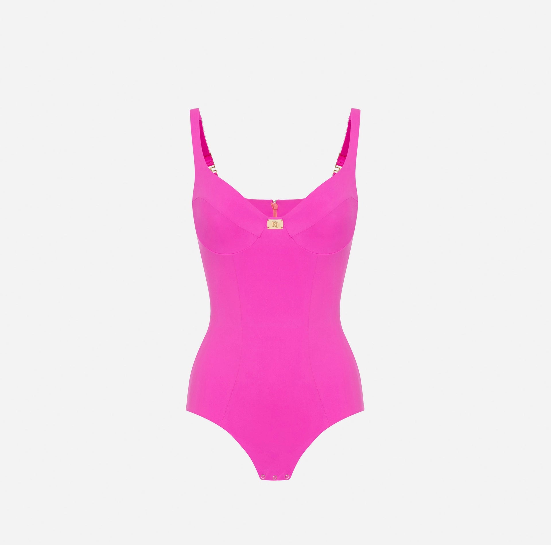 Bodysuit in microfibre jersey fabric with bustier cups and shoulder straps. Application of a golden metal logo plaque at the neckline