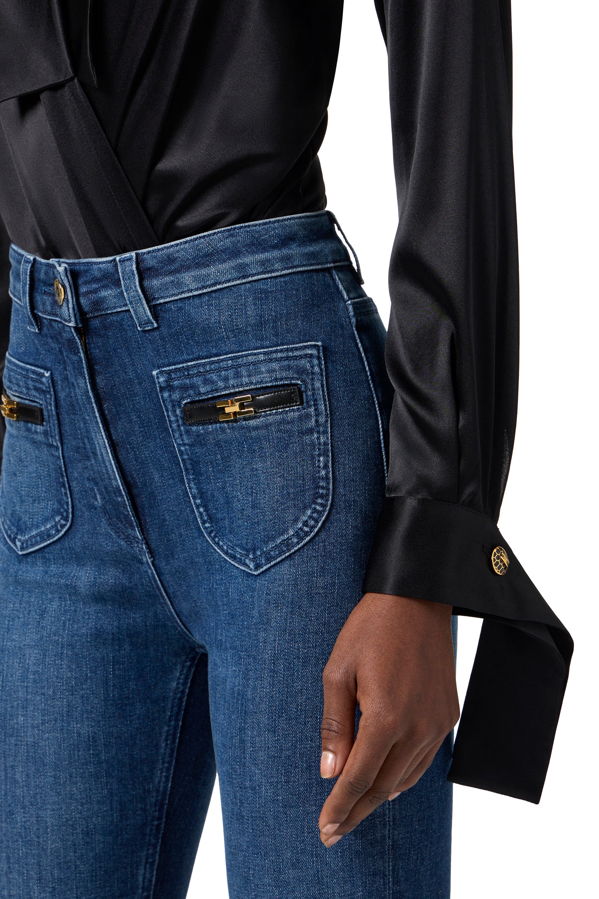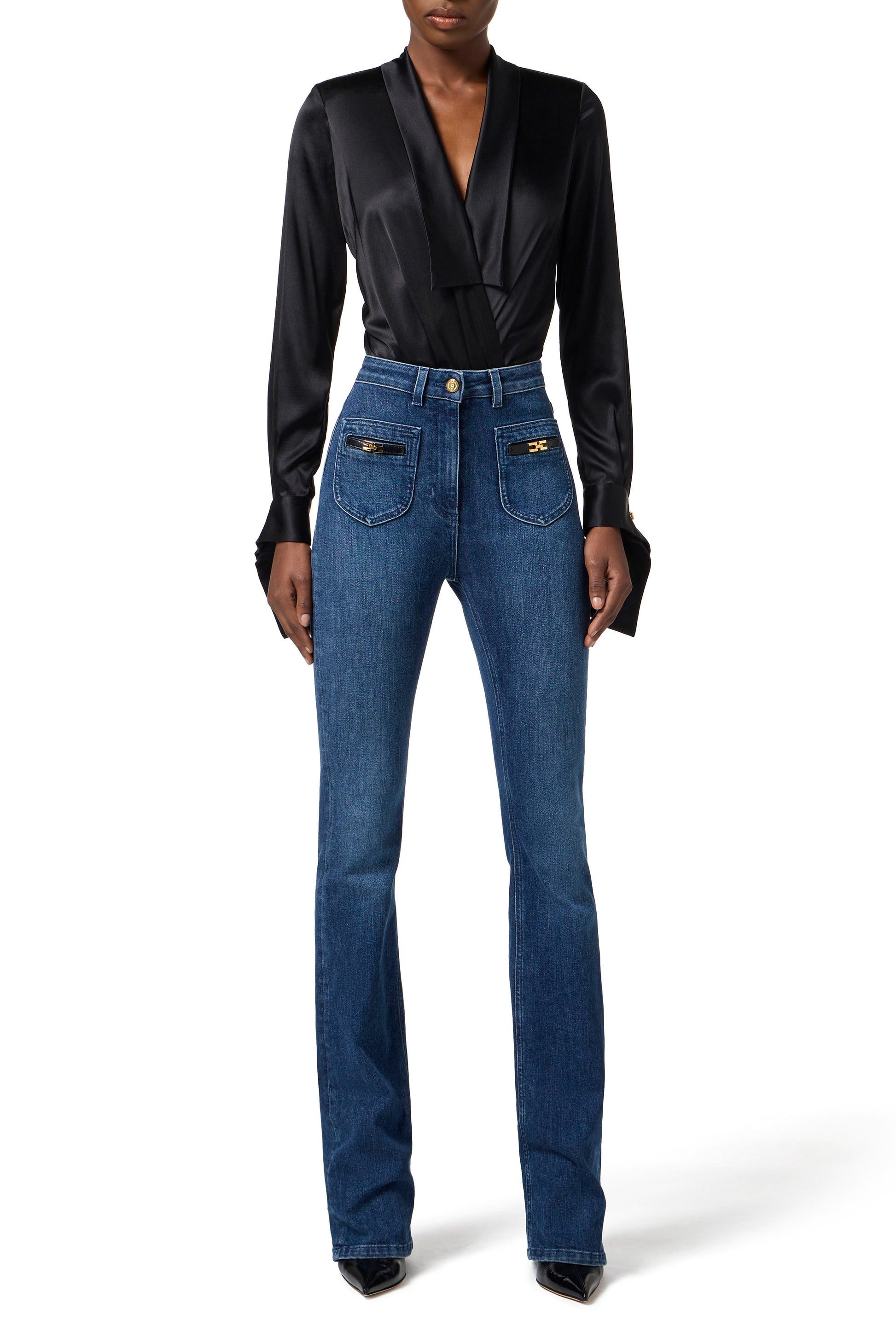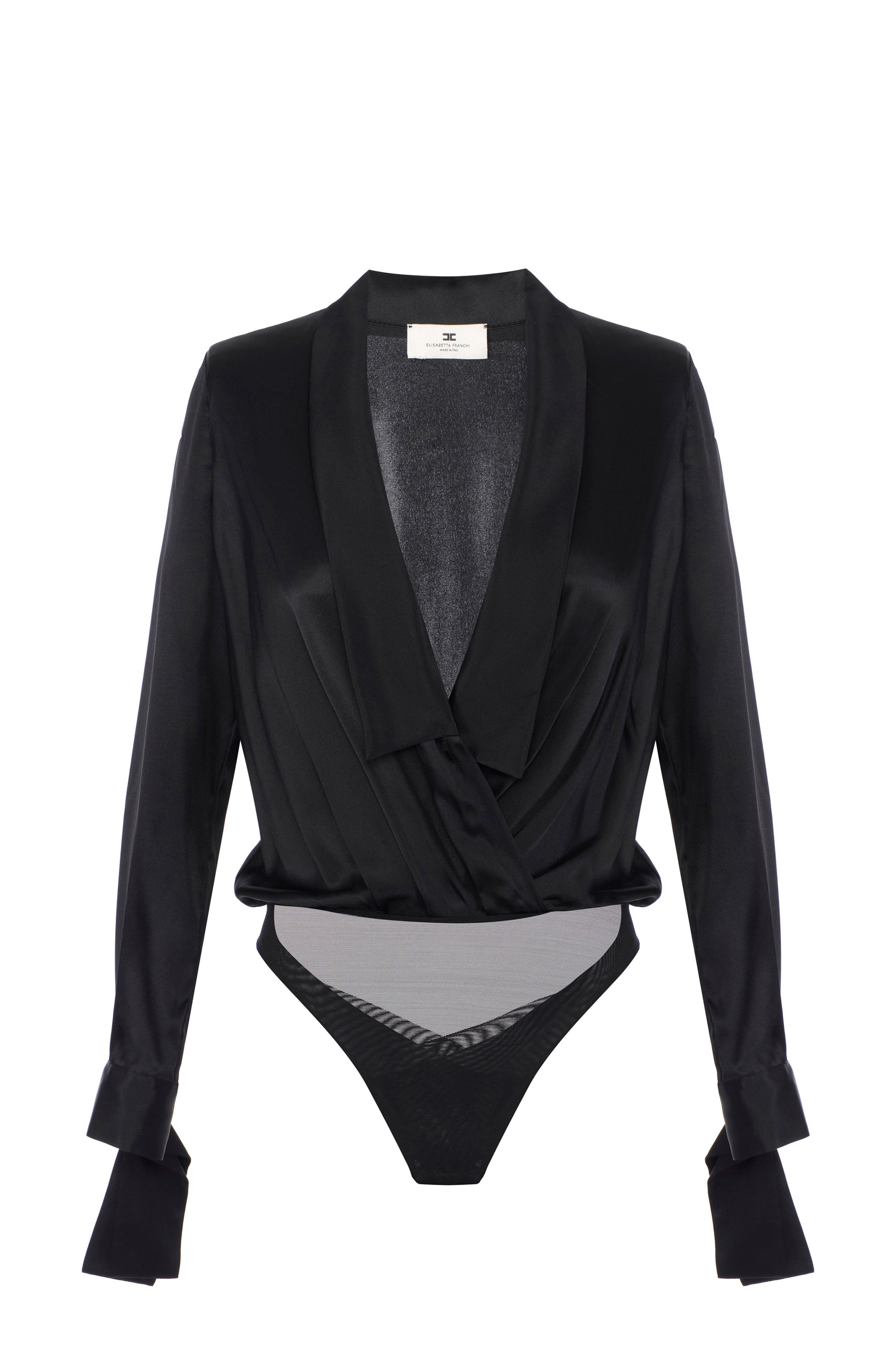 Bodysuit in satin fabric with slim fit. It has structured shoulders and a shawl lapel collar. It stands out for crossover volumes at the front. The tie cuffs give lightness. Enamel buttons with snake-inspired patterns embellish the garment.