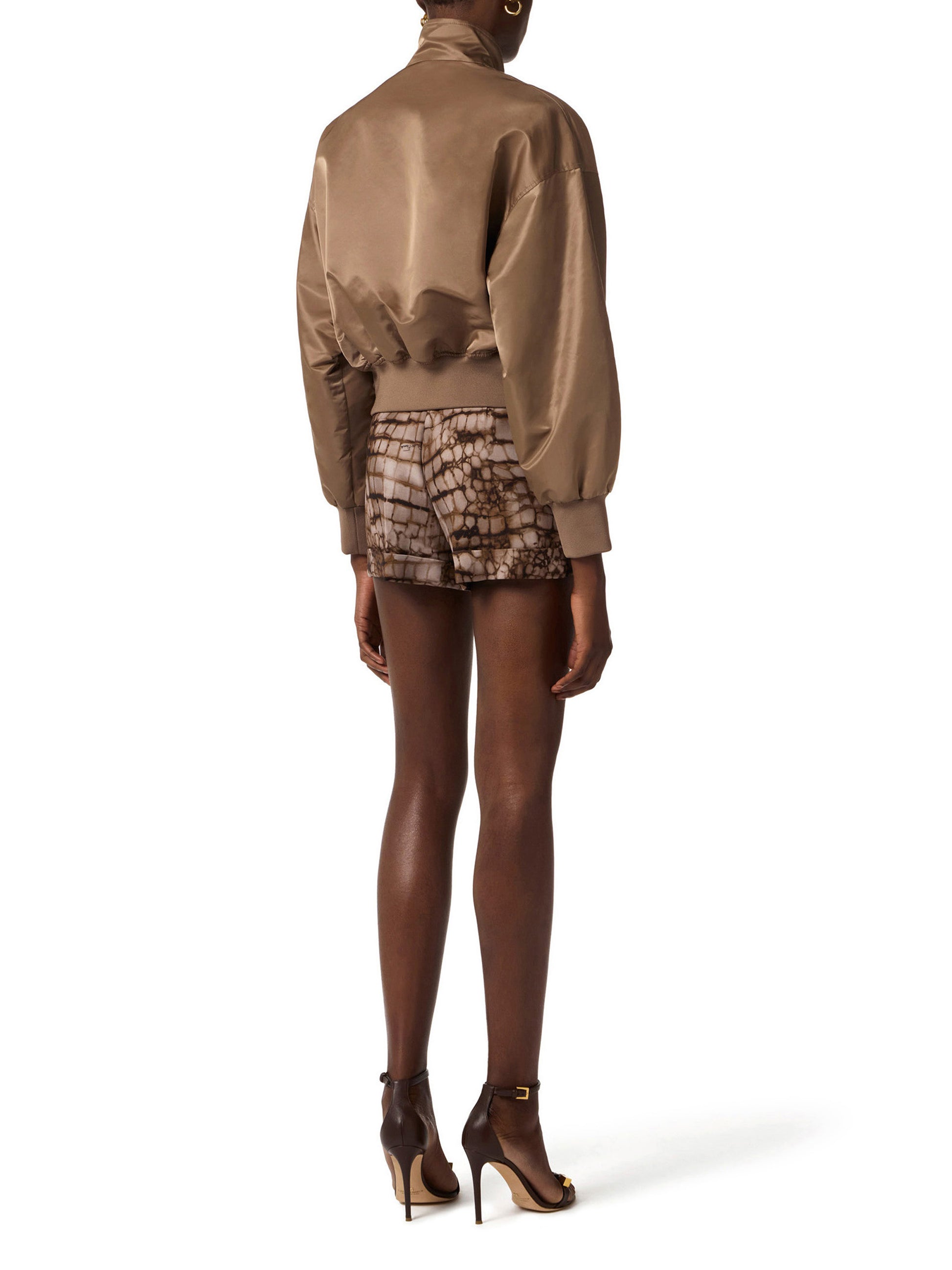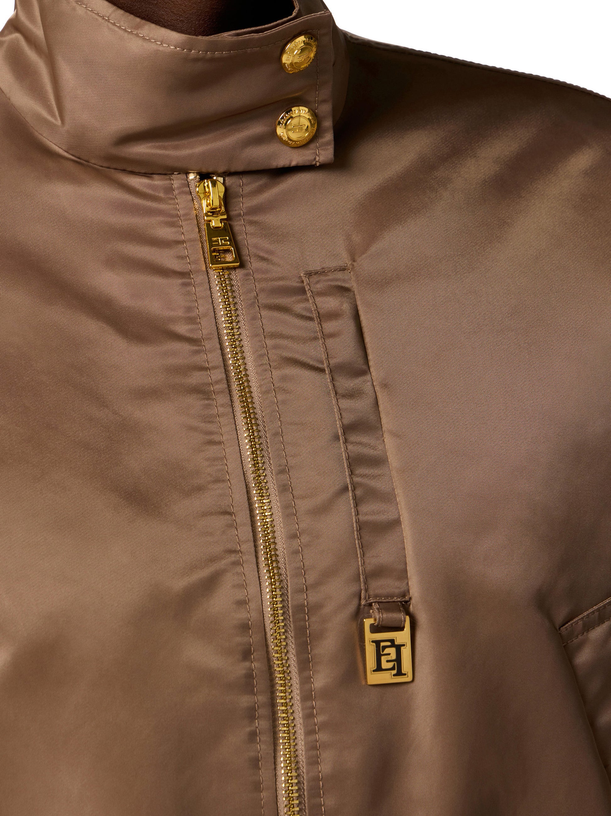 Nylon bomber jacket with oversized fit. The jacket has a high fabric collar and wide sleeves. The golden metal buttons add bright accents, and the pocket is decorated with a logo plaque. Finished with knitted cuffs and waistband.