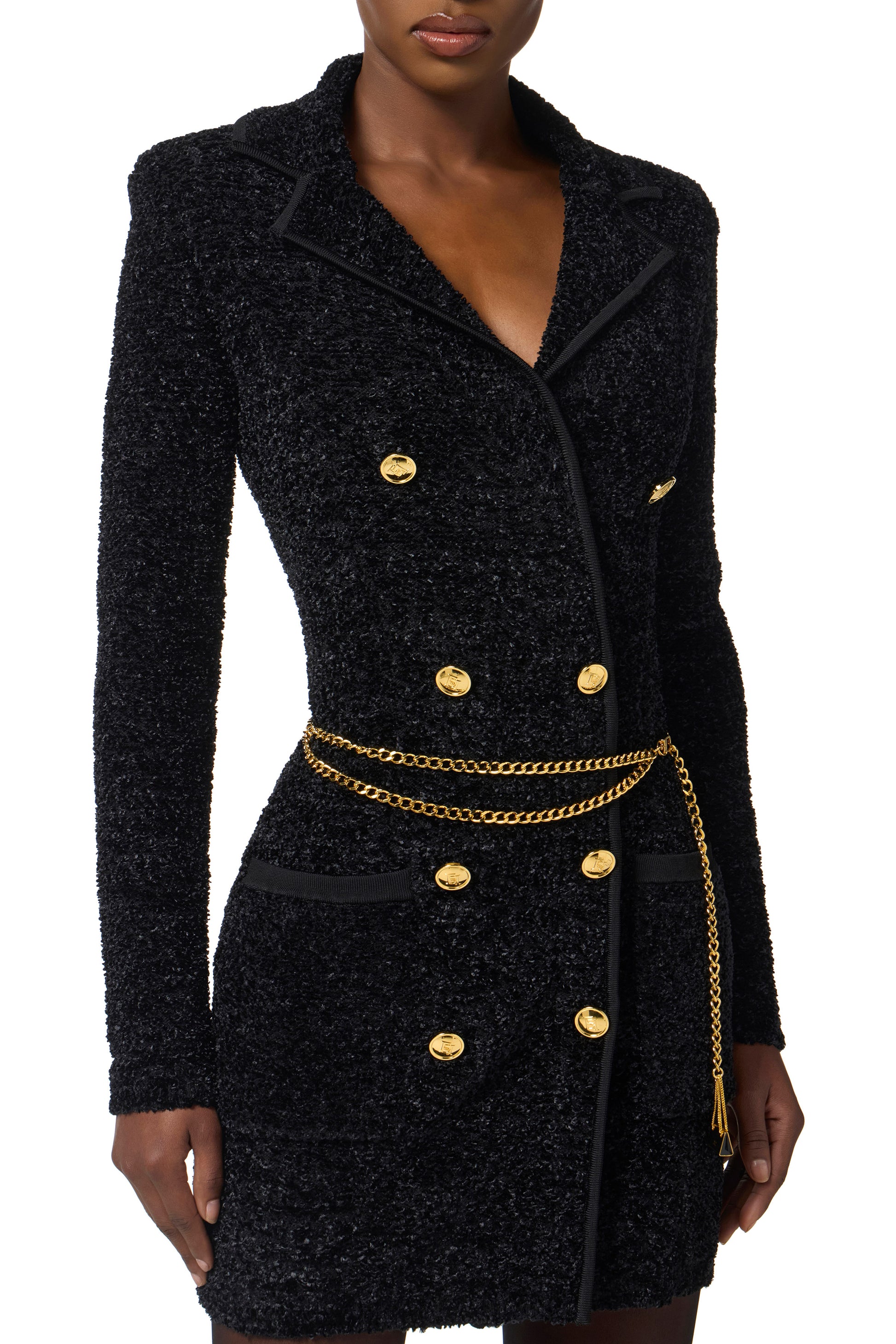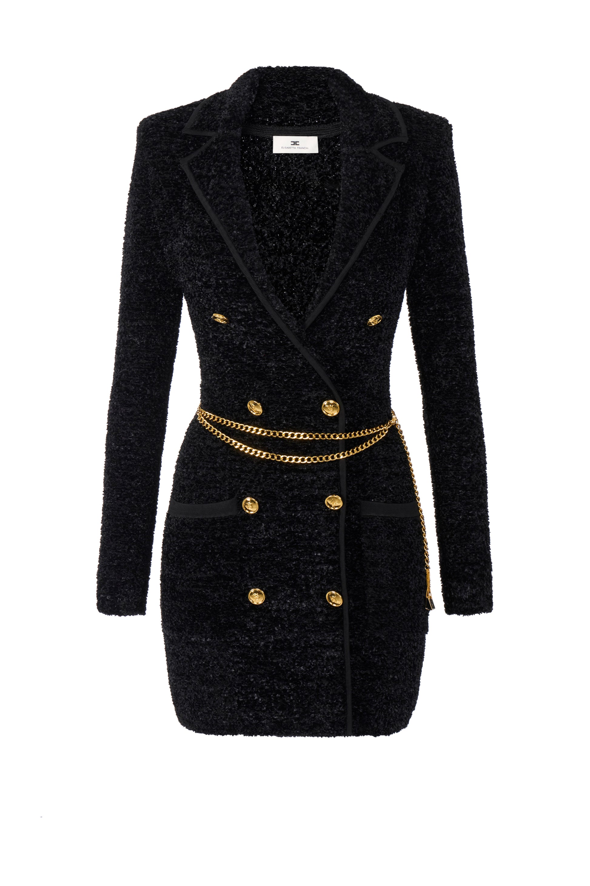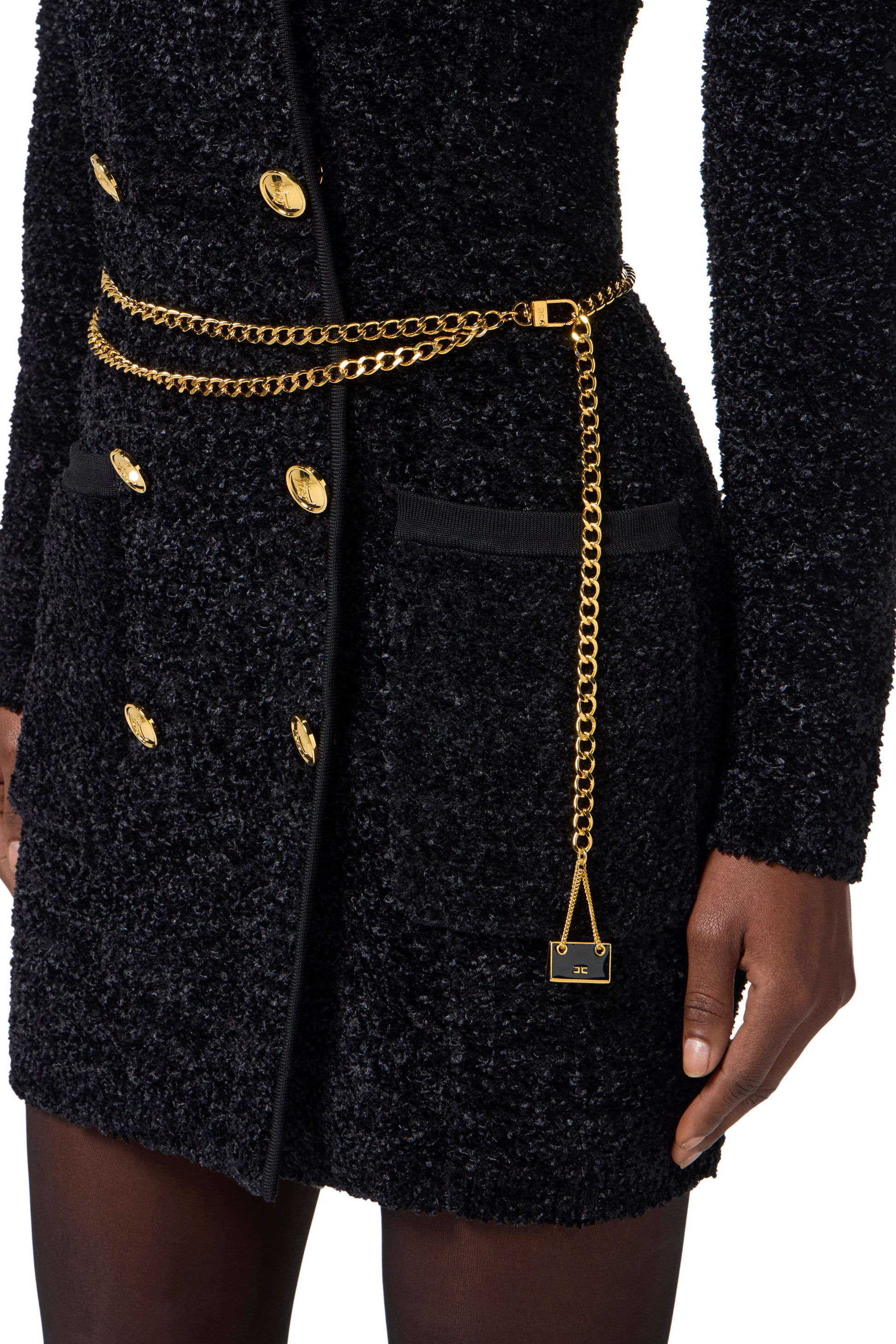 Bouclé chenille coat dress with a slim fit. The dress has structured shoulders and stands out for the double-breasted collar with lapels. Patch pockets at the bottom. The stylish details are the golden metal logo buttons and belt with mini-bag charm that decorate the waist.