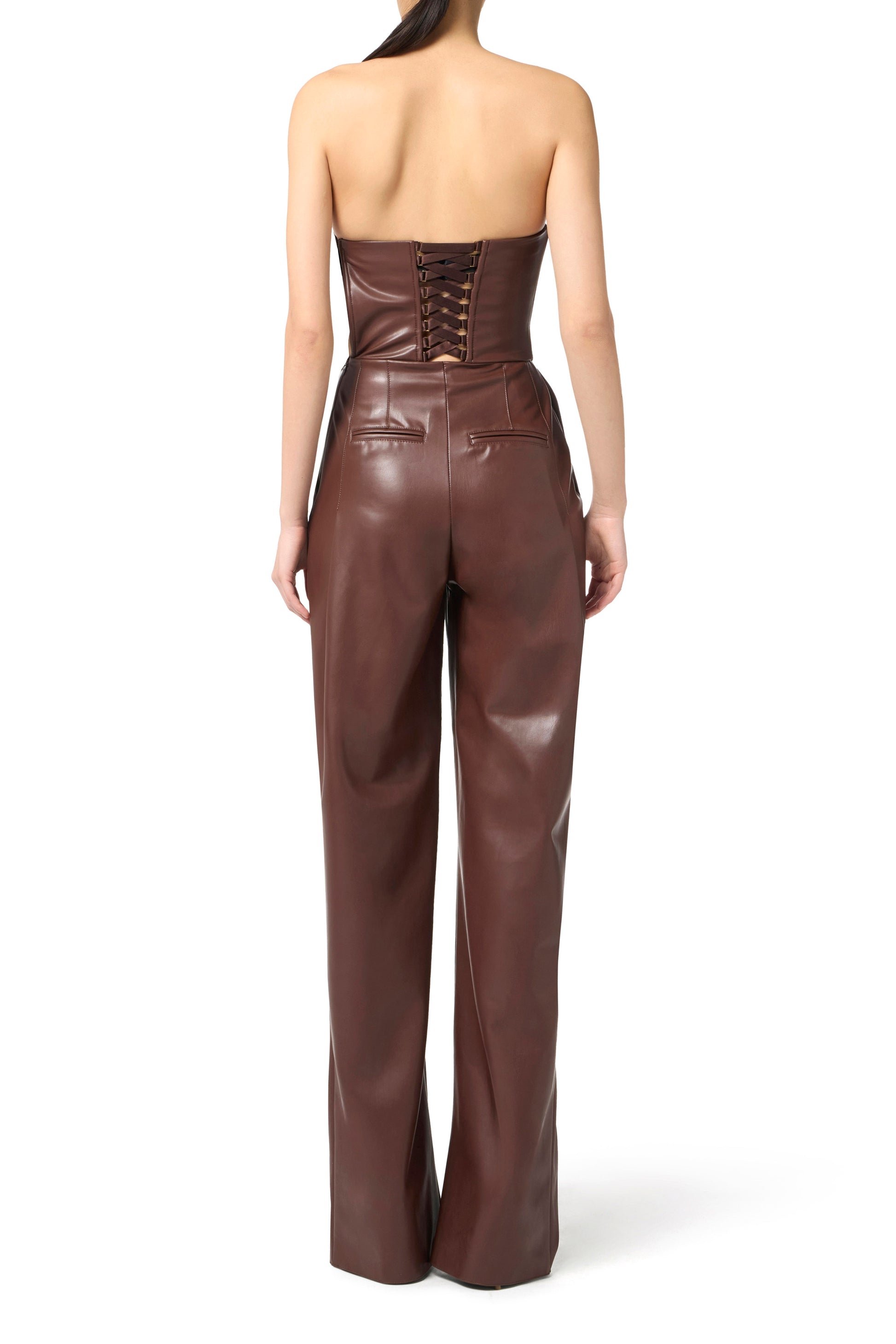 Jumpsuit made in leather-effect synthetic material with nappa texture. The top has bustier construction and is finished with genuine leather piping details on the front and a criss-cross lace pattern on the back. The trousers with double darts provide ample and defined volume. Regular fit.