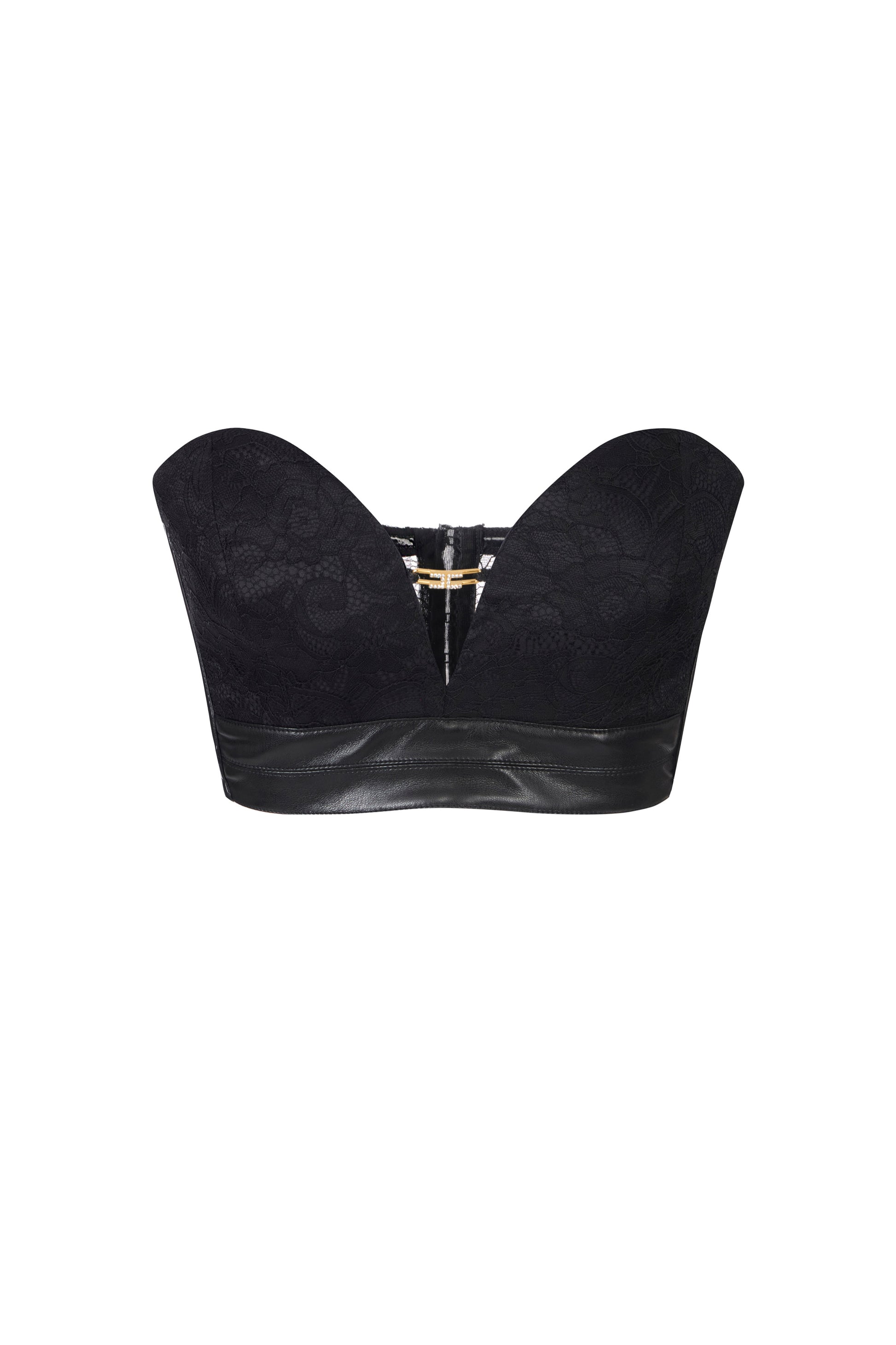 Slim fit top in floral lace fabric. With a sweetheart neckline held in place by a precious rhinestone logo detail, it has a bustier construction with internal bones and underwiring that gives structure to the cup. Finished with leather-effect synthetic inserts for an interesting play on texture.
