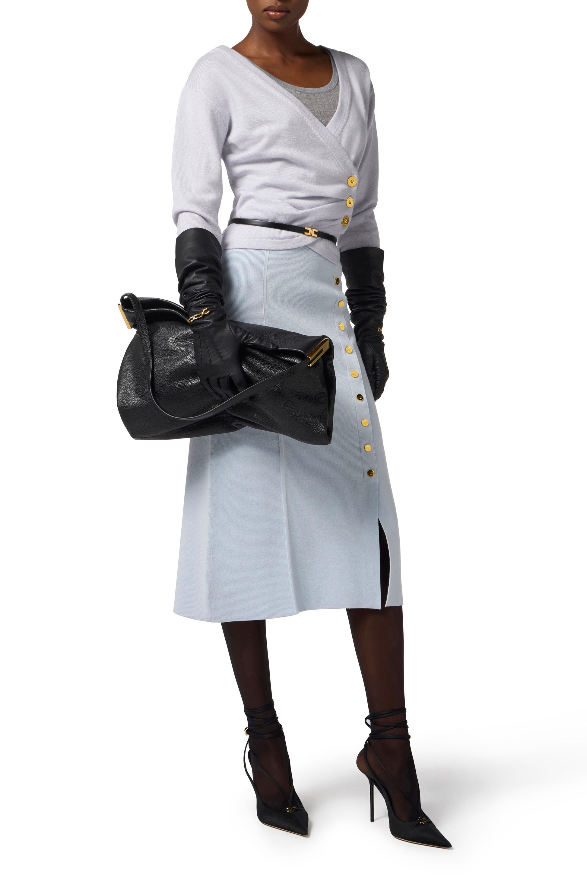 Cashmere blend jumper with regular fit. It has a crossover v-neck and long sleeves and a soft texture that caresses the skin. It features golden metal buttons placed on one side, enhancing the central drape.