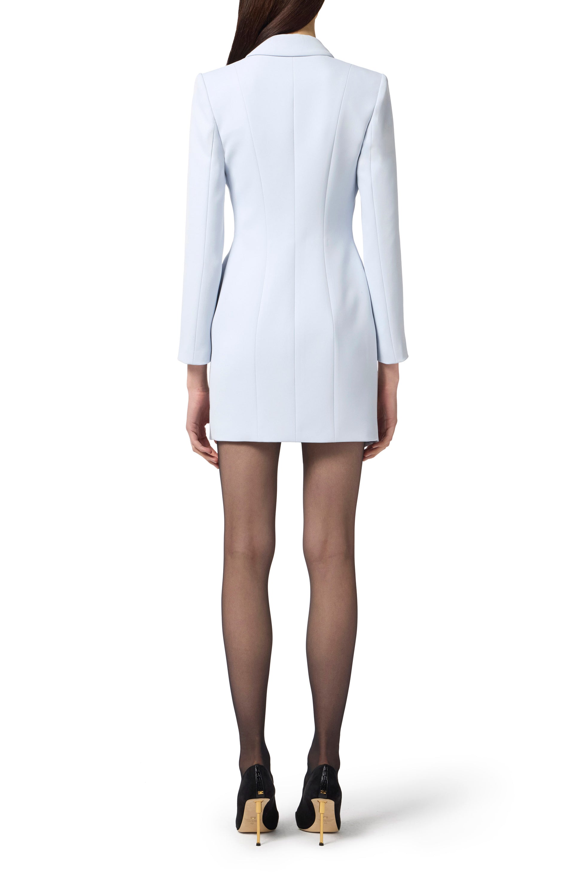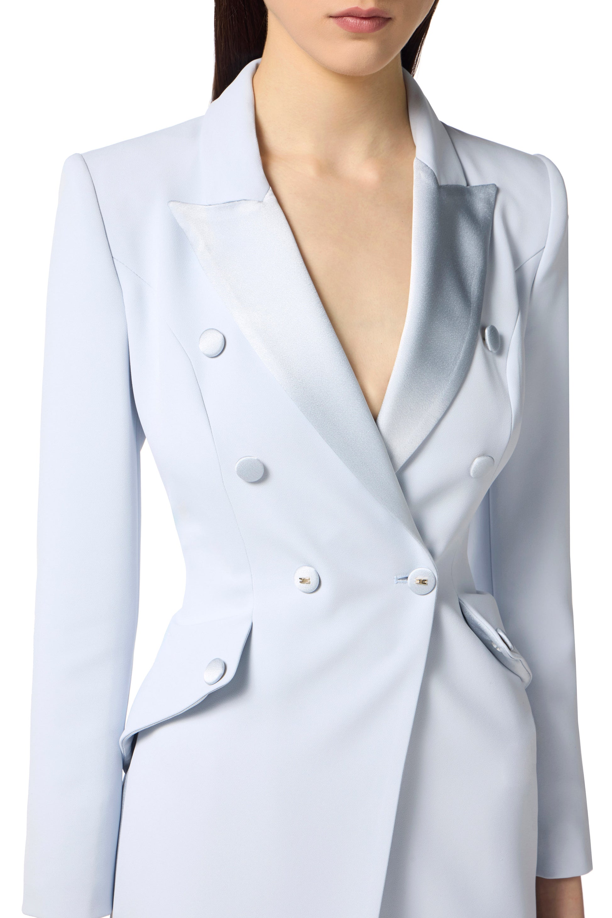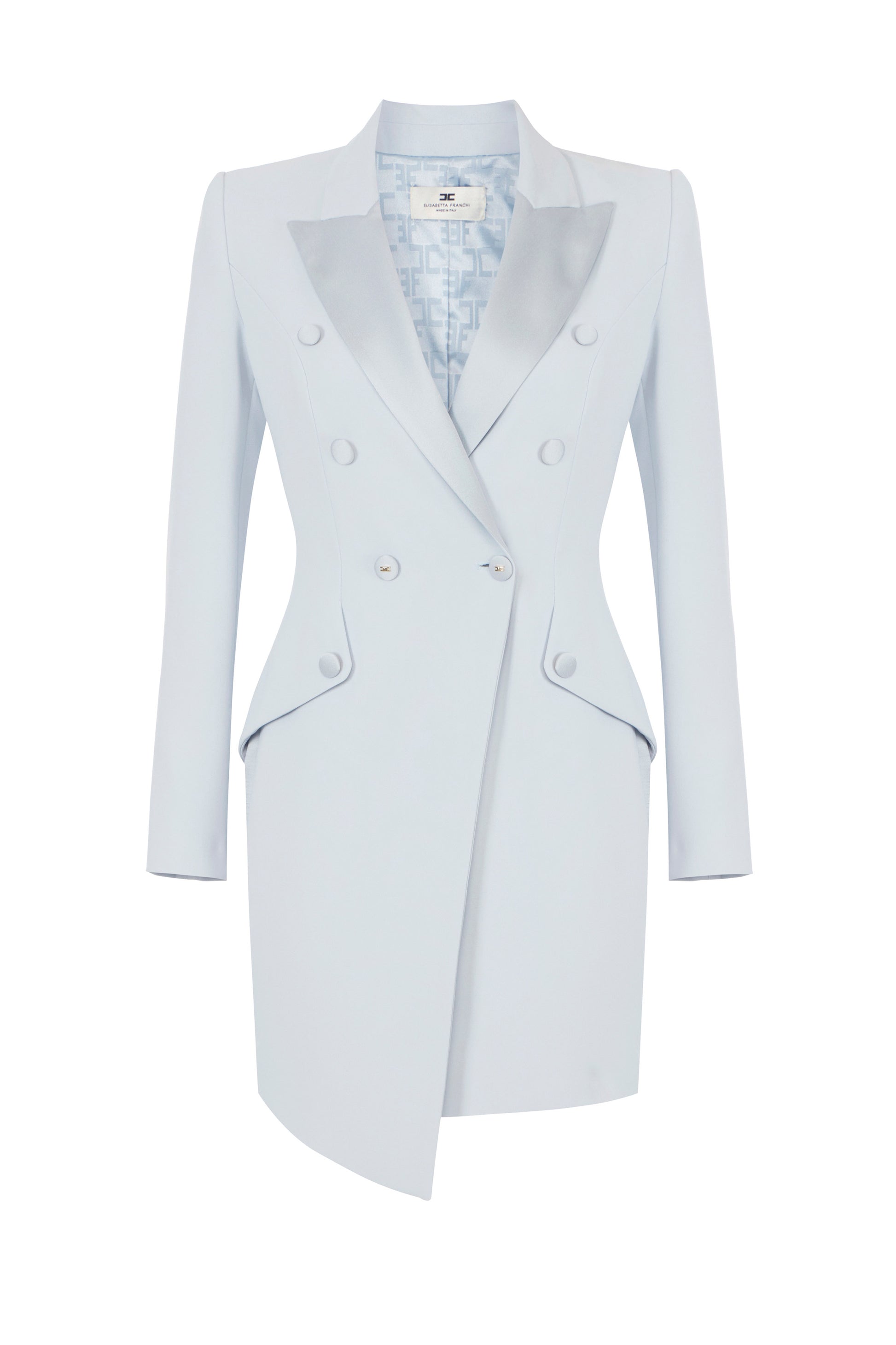 Lightweight crêpe coat dress with a slim fit and structured shoulders. Inspired by the elegance of the tuxedo, it has satin lapels and side bands for a refined interplay of cuts and textures. The skirt with asymmetrical bottom gives an unprecedented style. Matching buttons, two of which with logo.