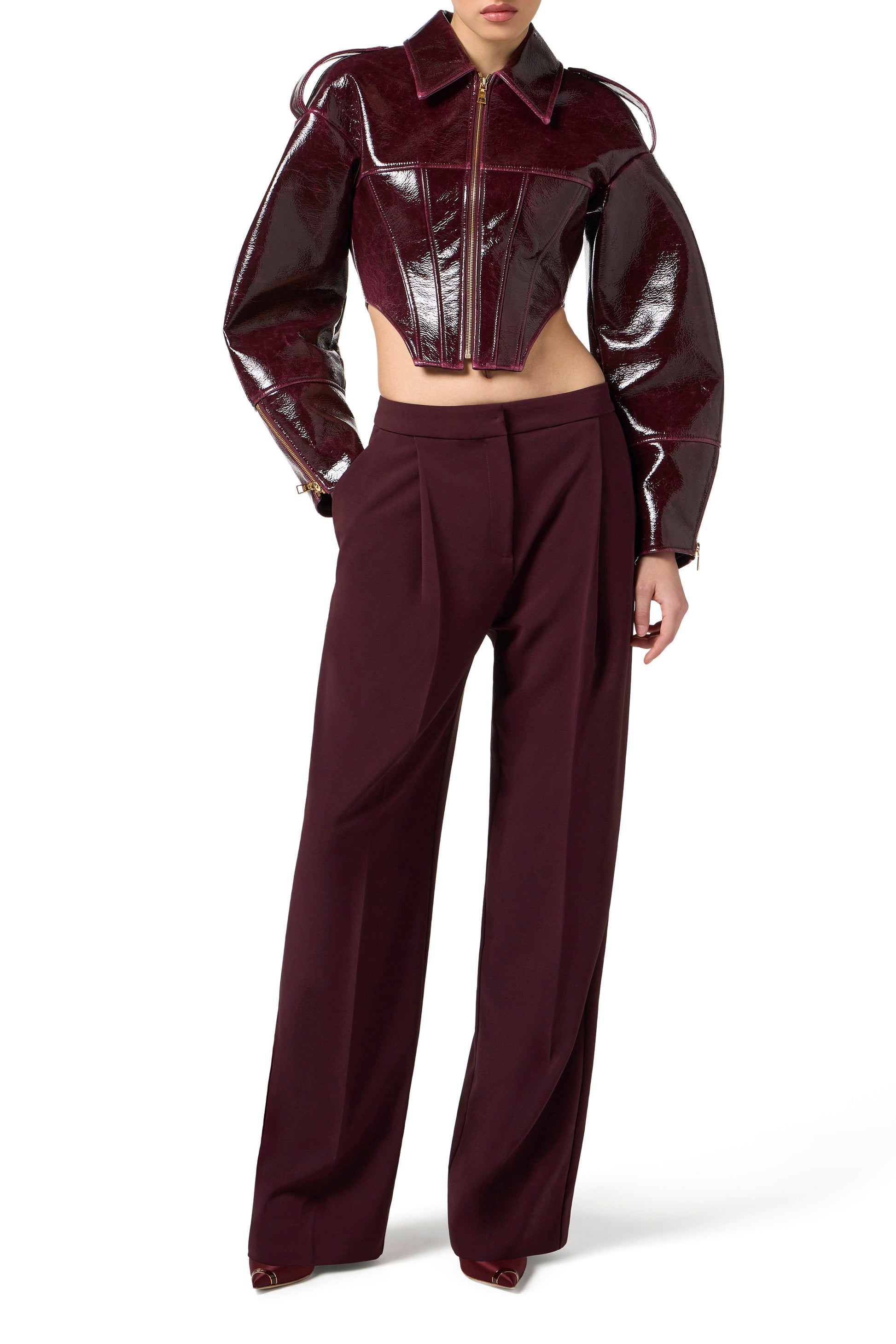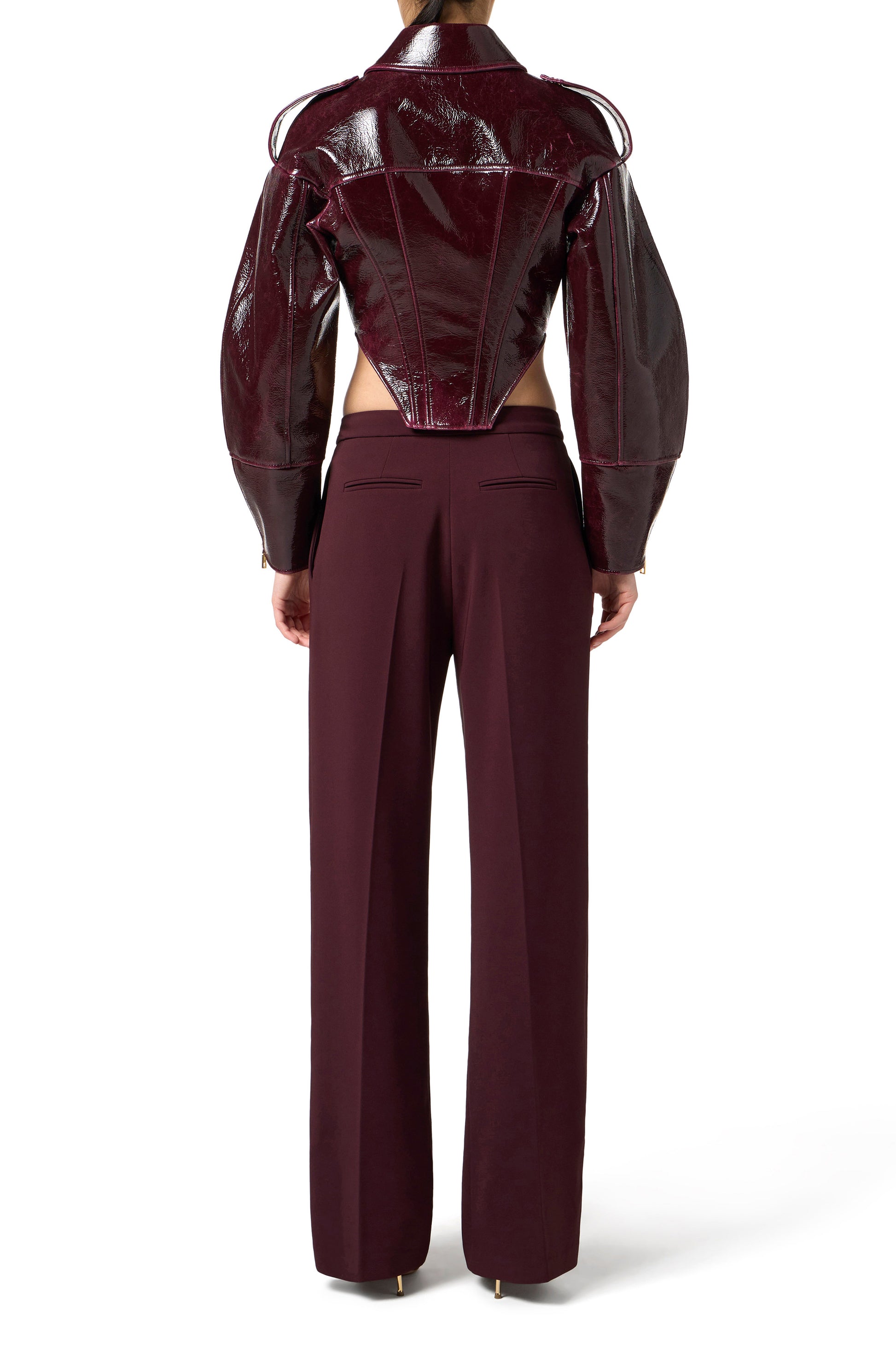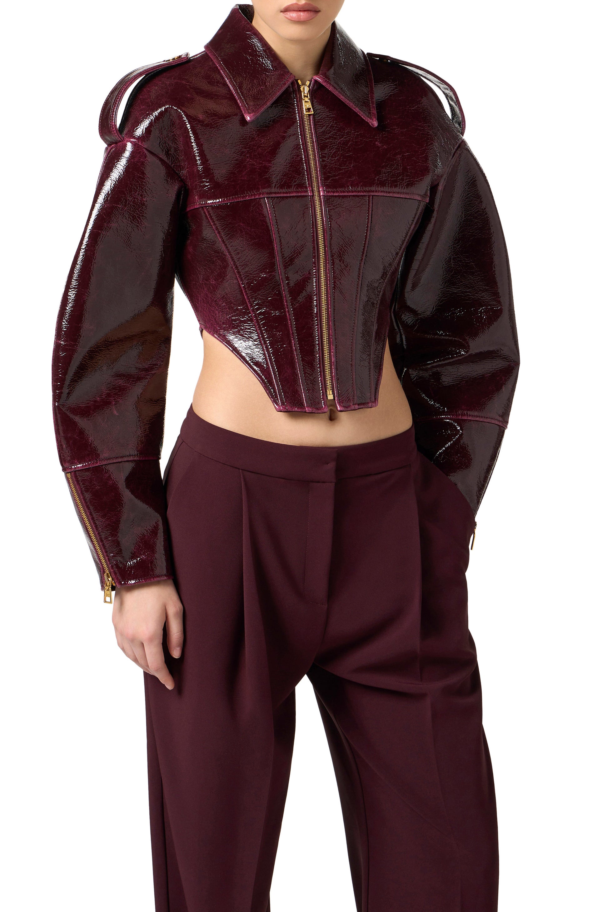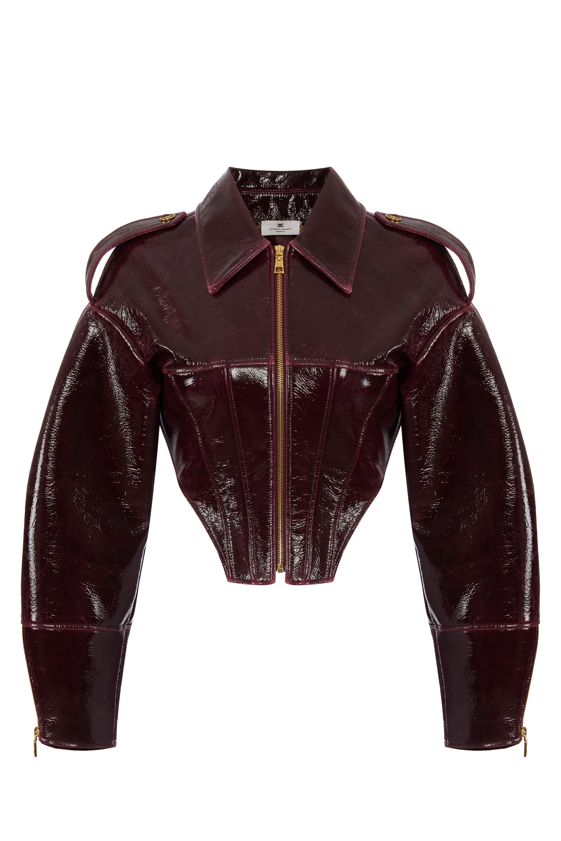 Jacket made of coated cloth with a slim fit. It features a bustier construction with cuts inspired by the world of corsetry, sculpting the silhouette. The wide sleeves have buttoned frogs on the shoulders and are finished with a golden metal zip at the bottom.