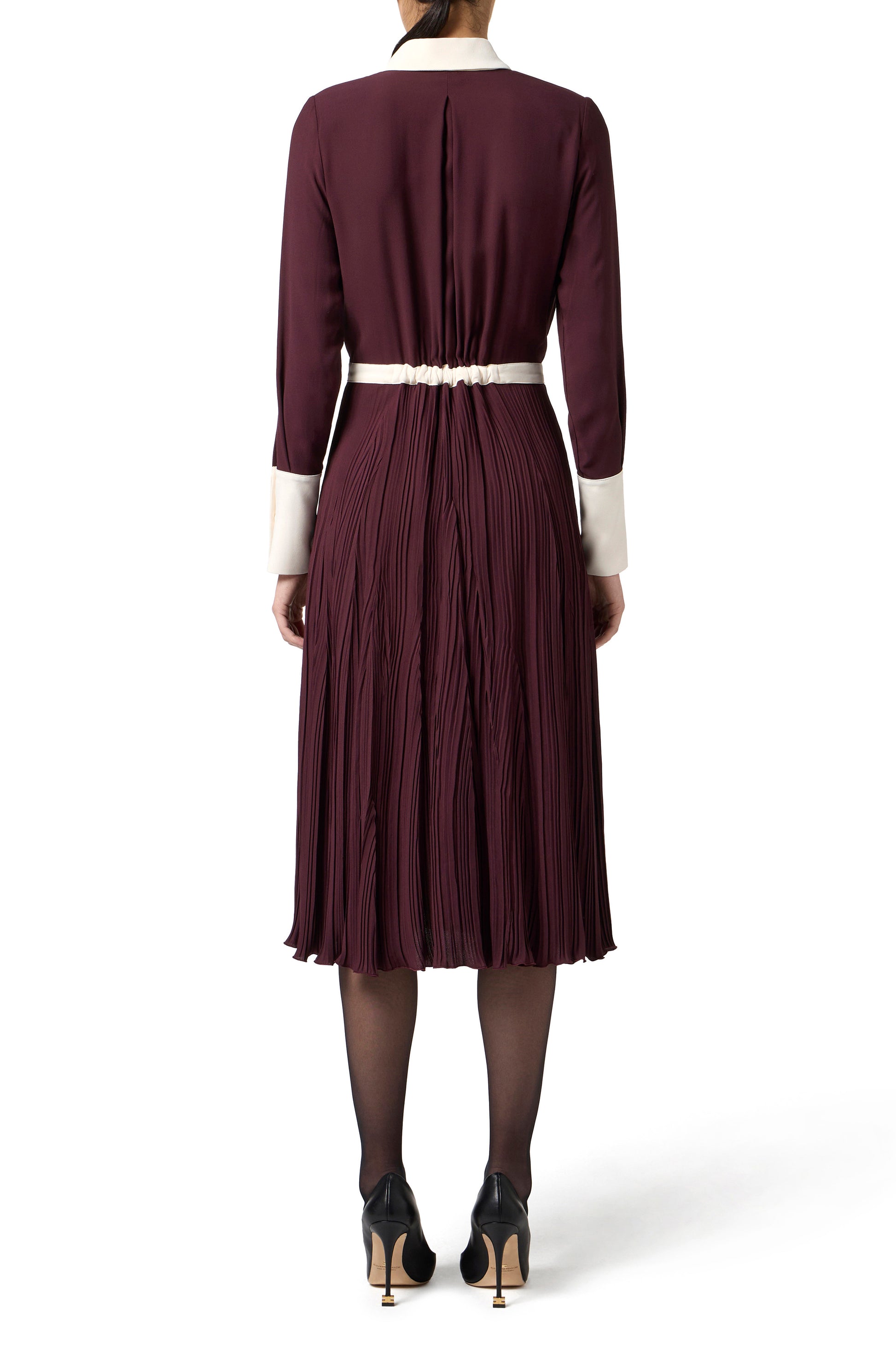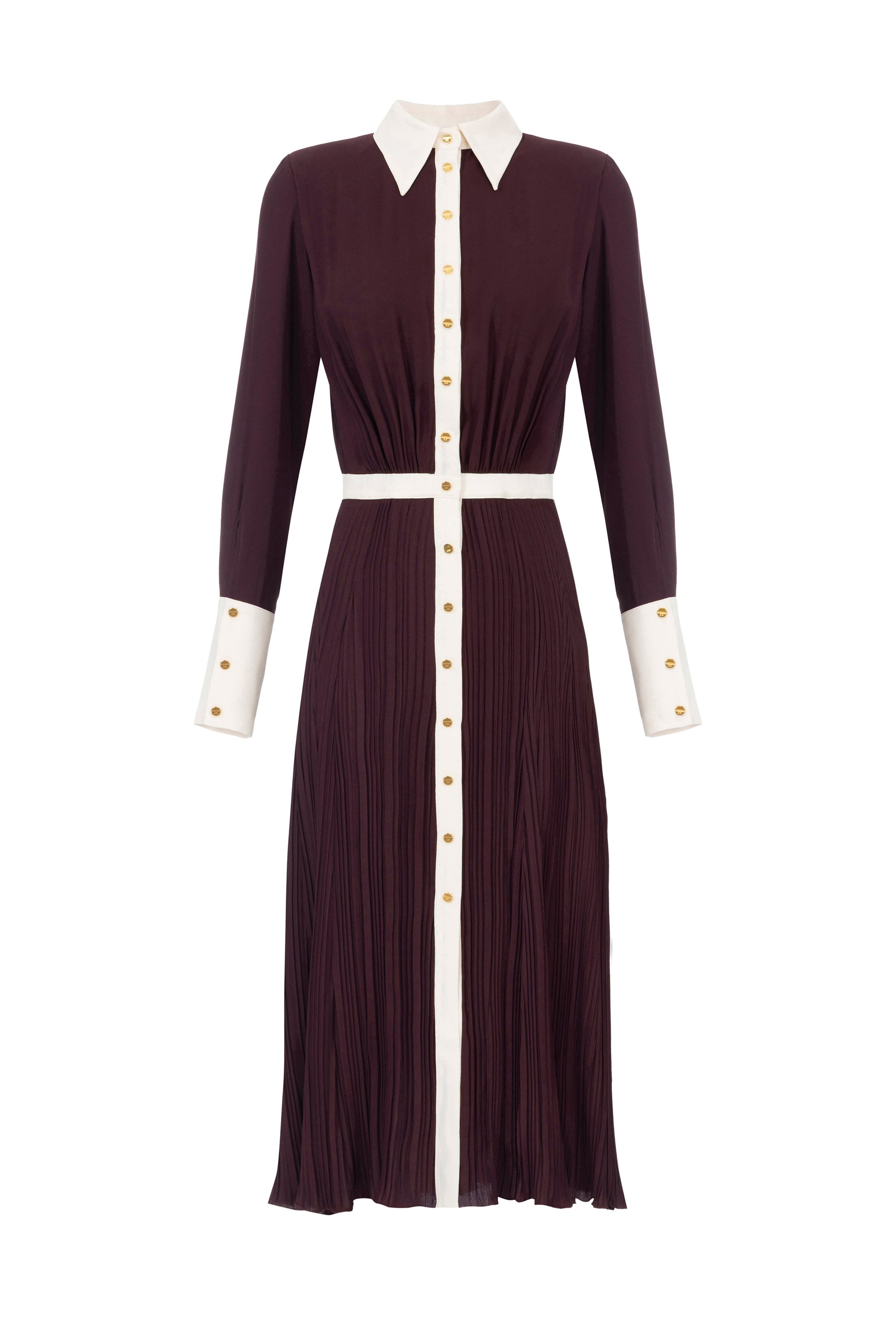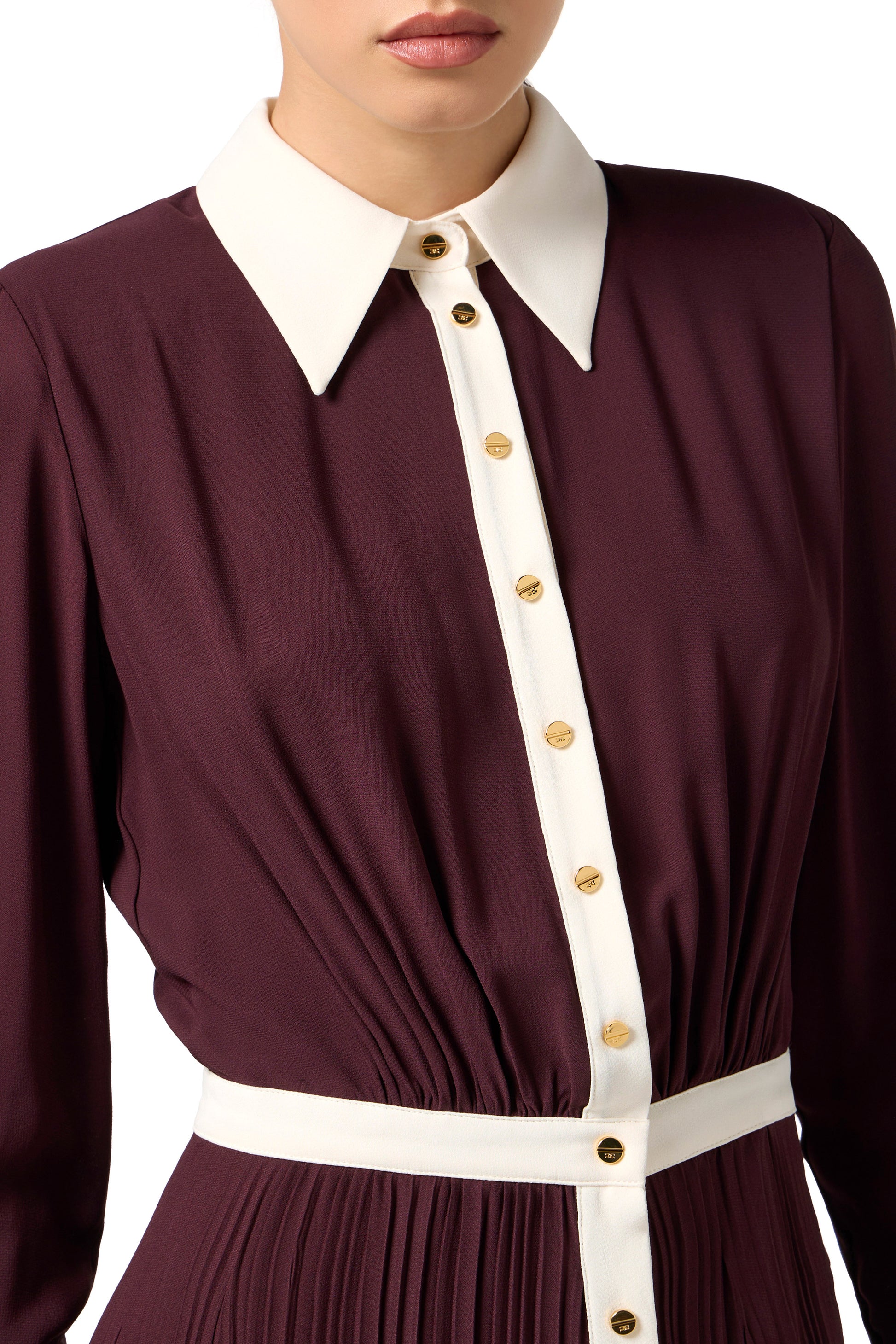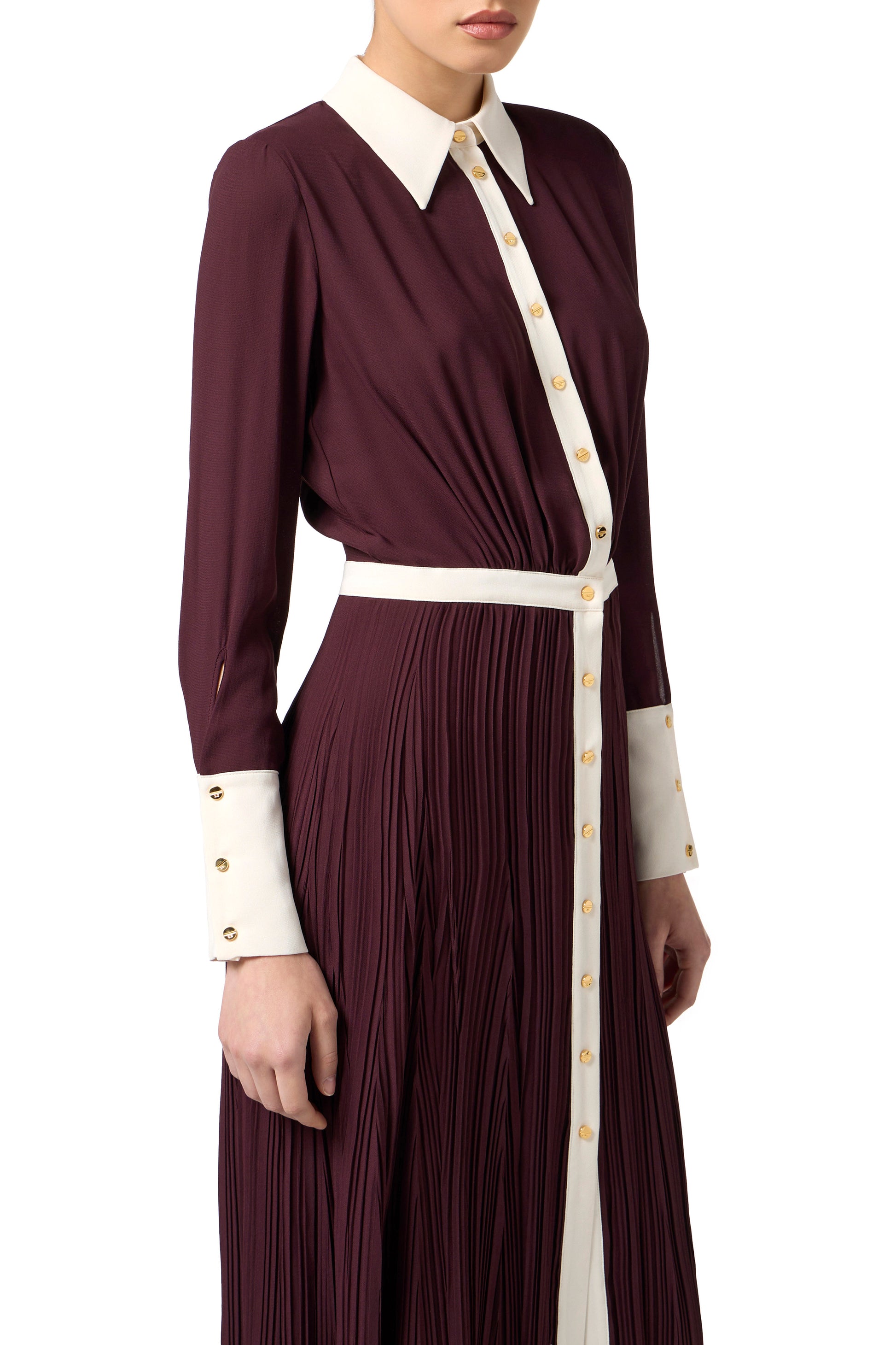 Dress in viscose georgette fabric with slim fit. The dress has a shirt collar, wide cuffs and a pleated skirt with an elastic at the back of the waist. The contrasting elements create refined colour-blocking effects. The golden metal buttons provide a touch of light.