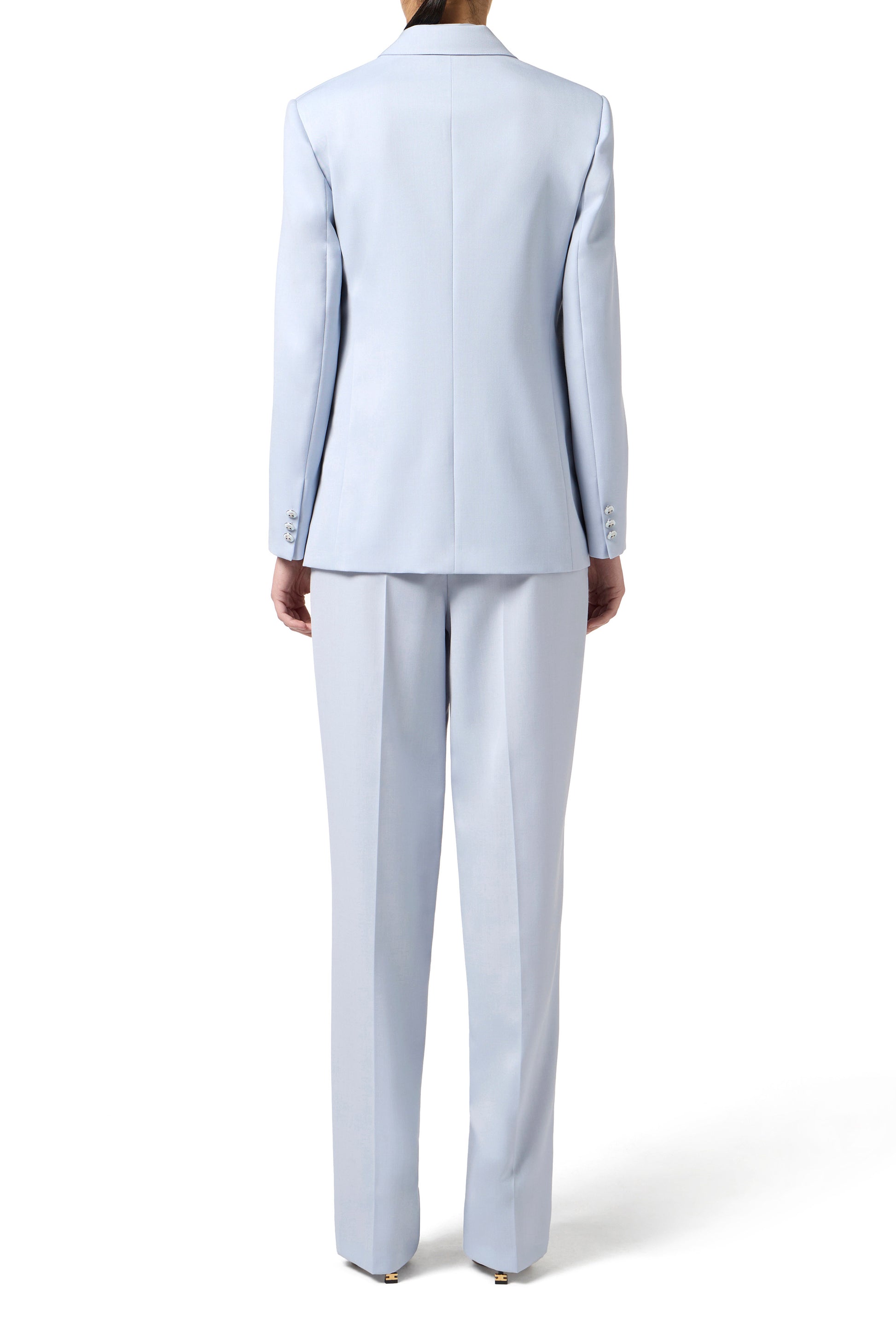 Double-breasted cool wool jacket with regular fit. The blazer has slightly structured shoulders, peak lapels and flaps. It is characterised by enamelled buttons that frame a logo badge, creating bright light effects. Breast pocket with embroidered cotton pocket square.