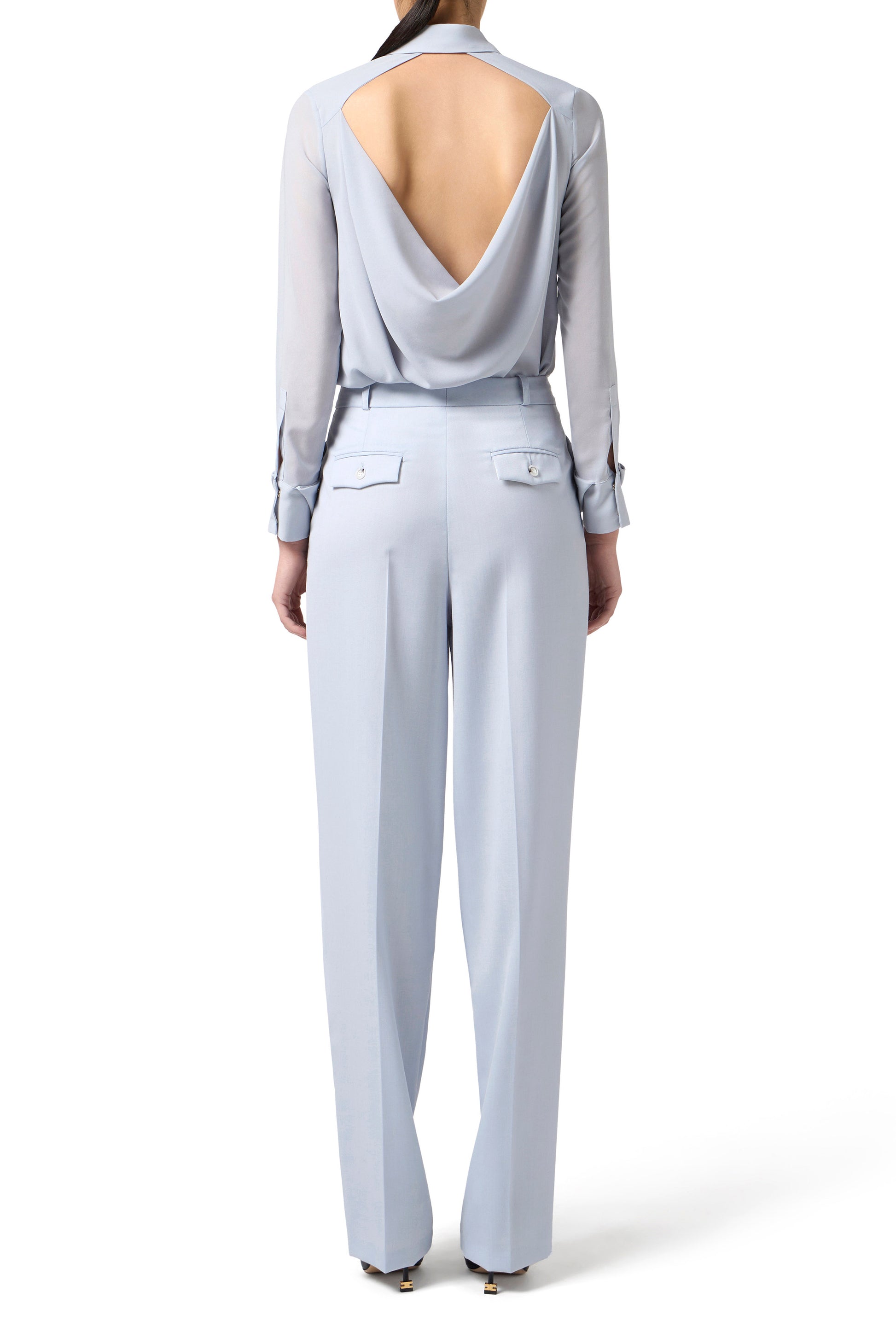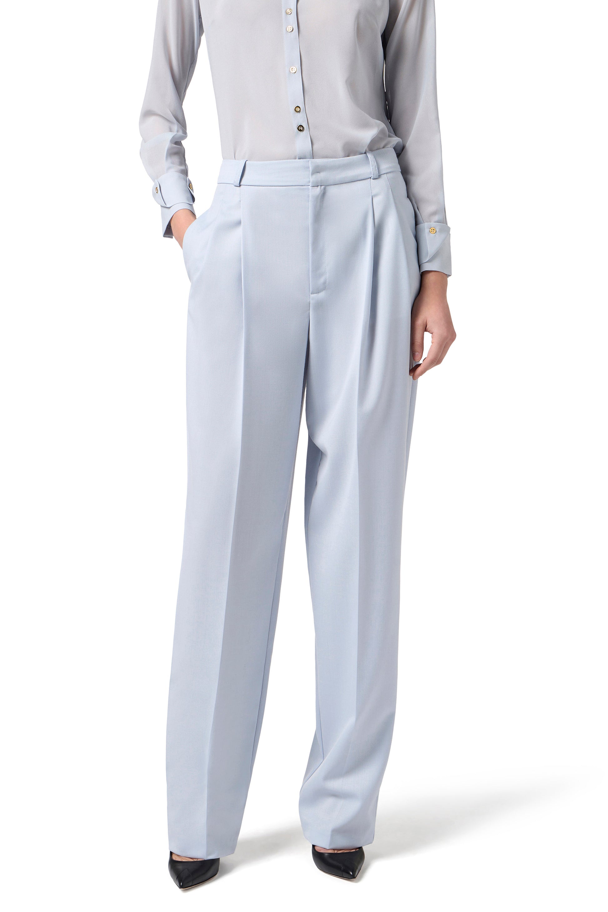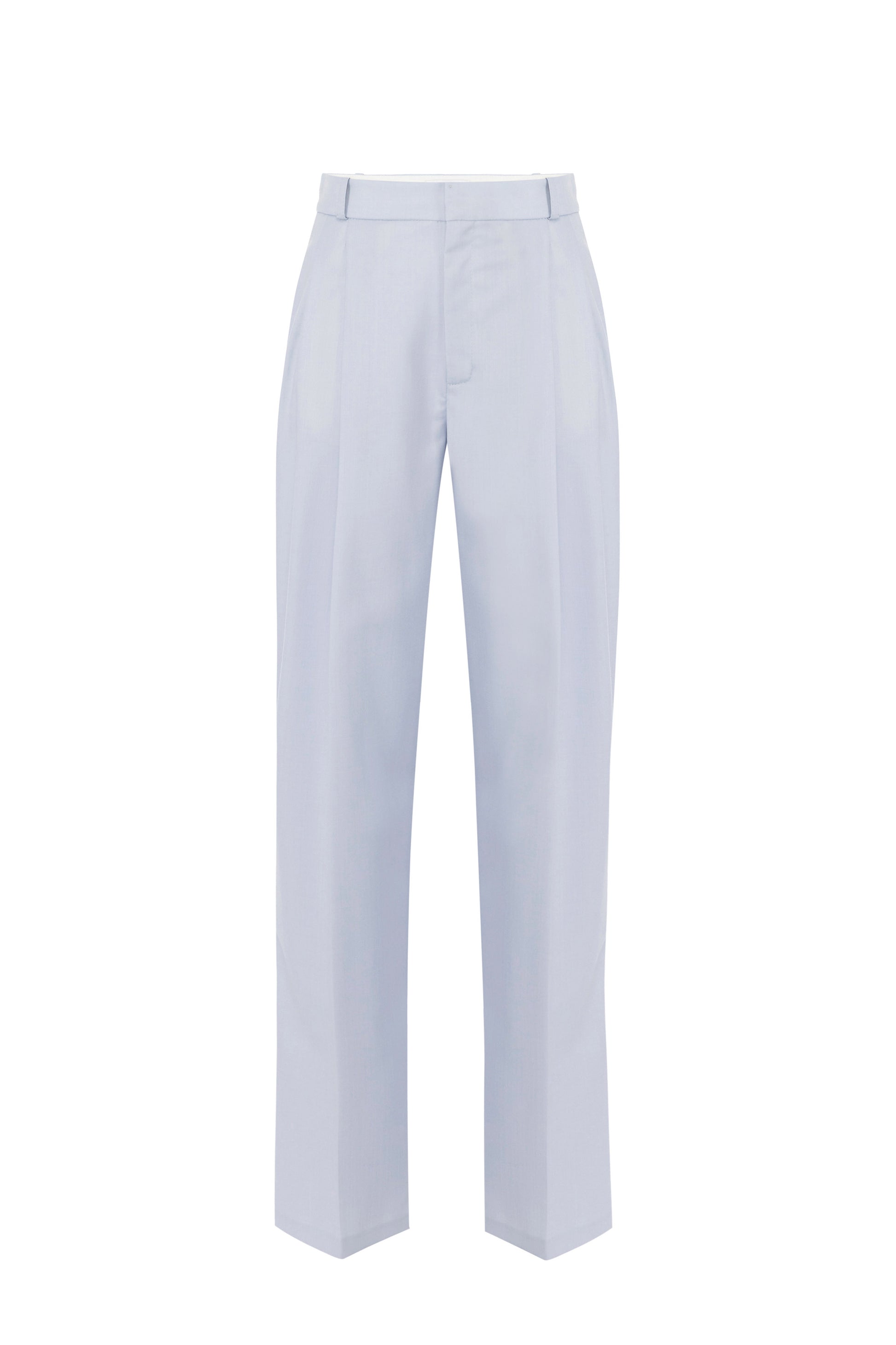 Cool wool trousers with oversized fit. With tailored construction, they have double darts at the front and a twill cotton band inside. They feature front pockets and flaps with buttons on the back.