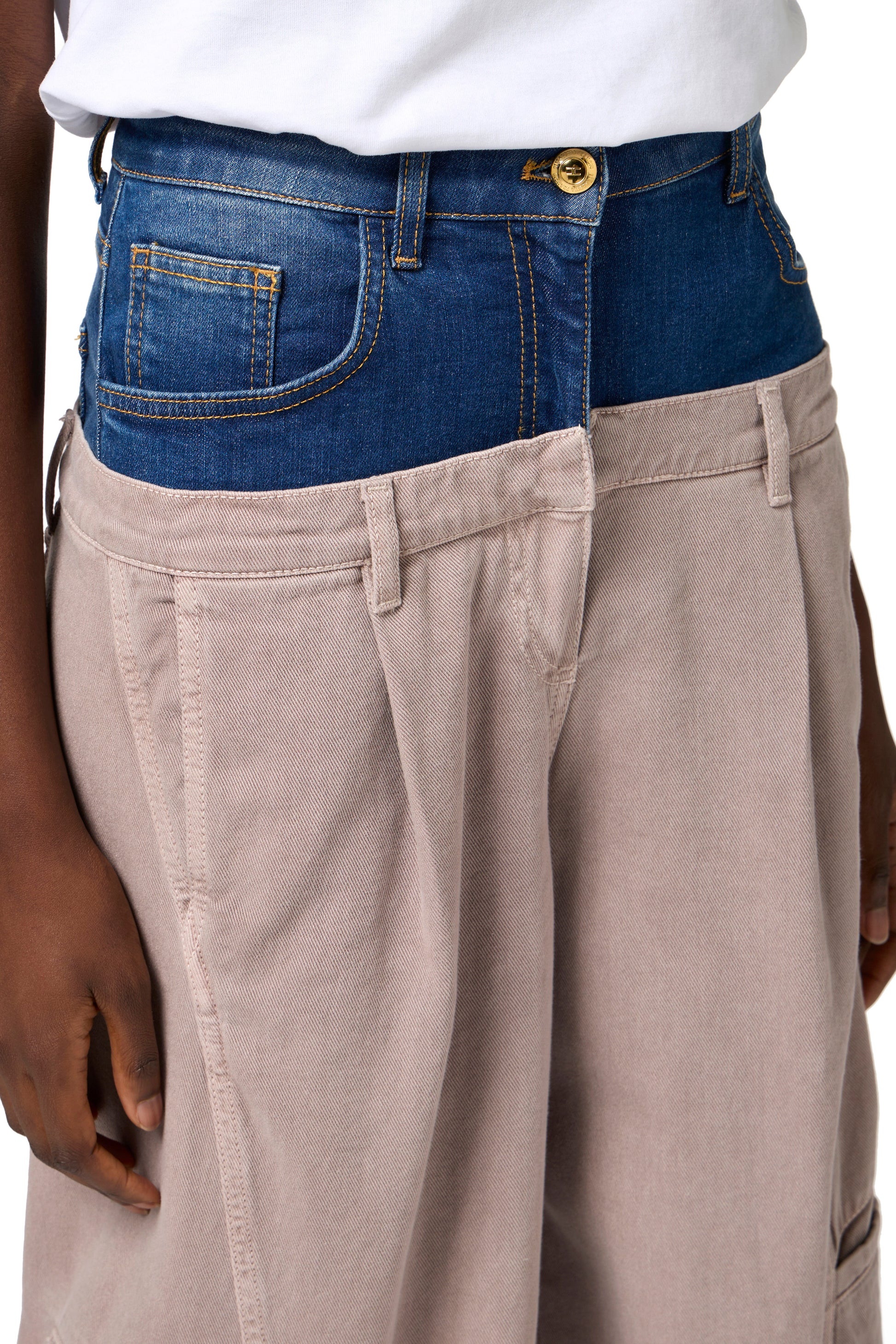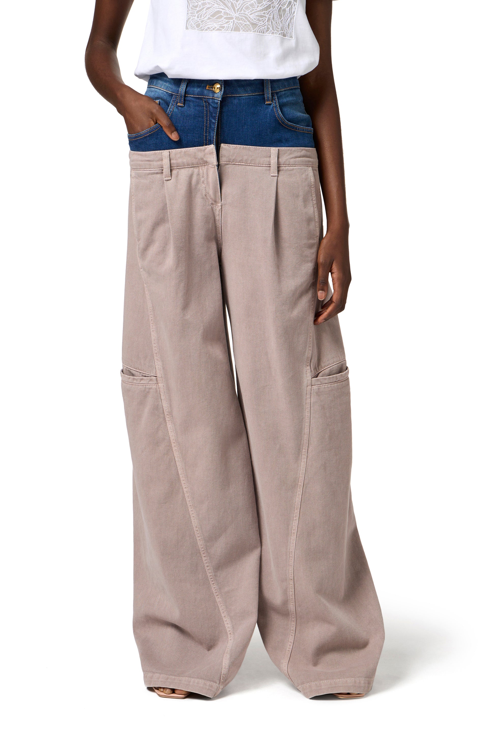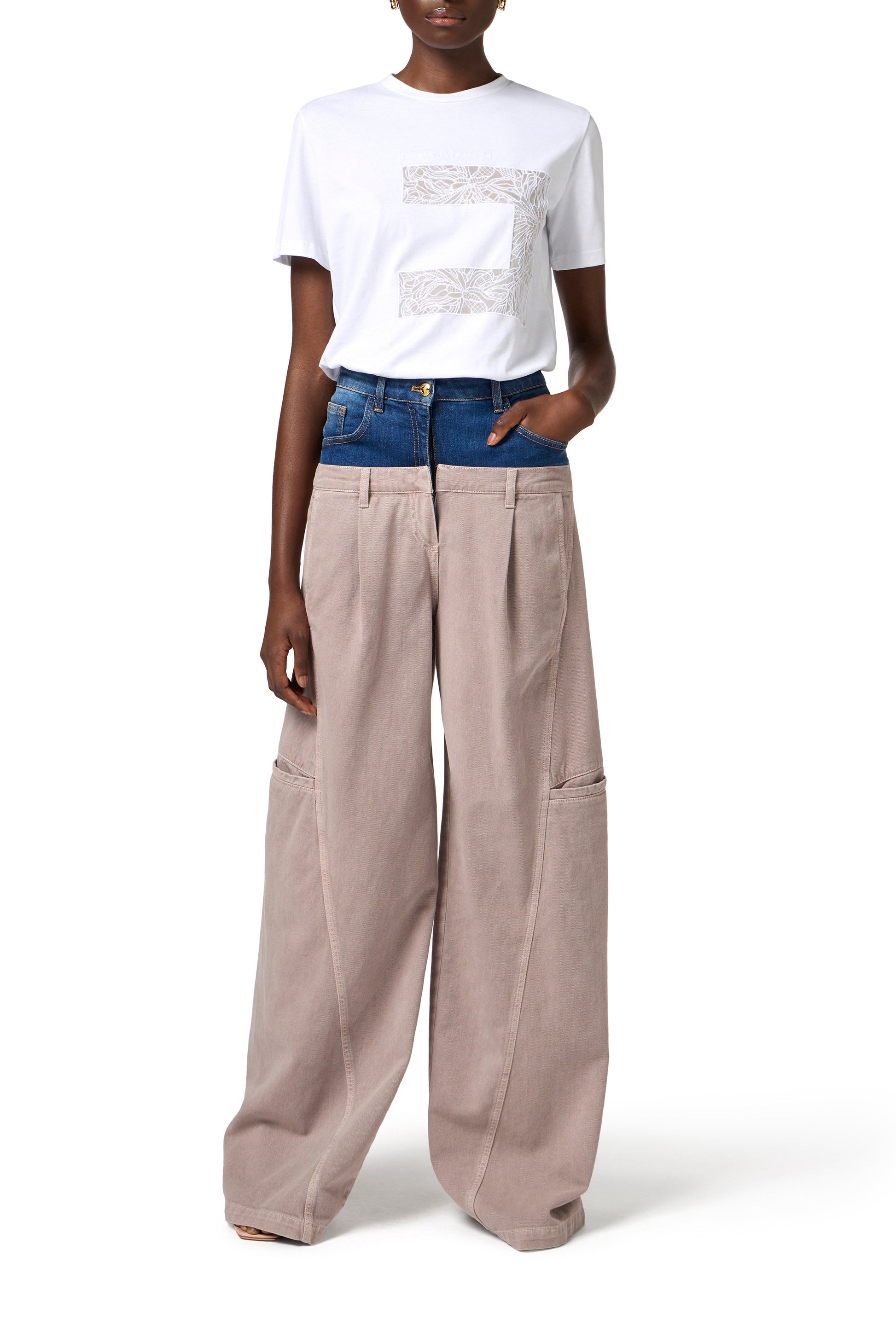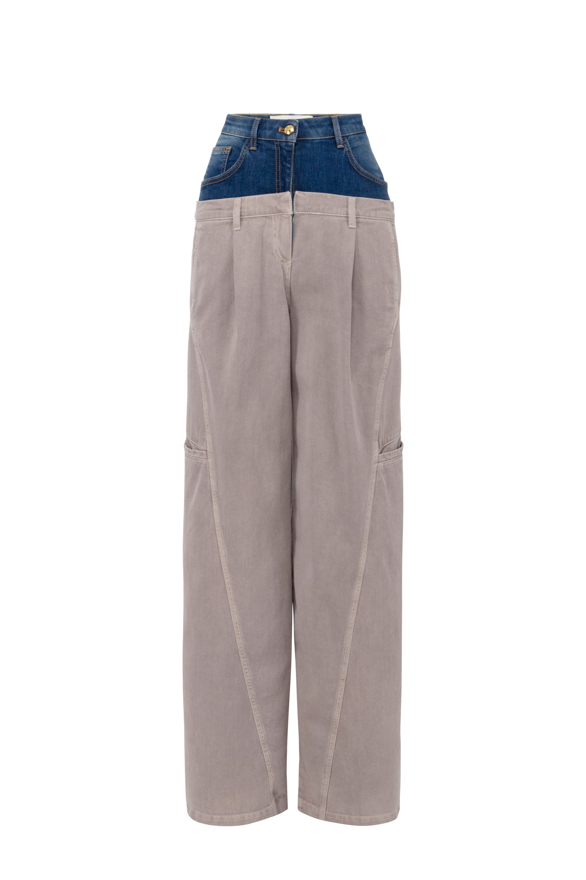 Garment-dyed cotton cargo trousers with palazzo leg, double darts and flaps on the back. The garment is characterised by a denim peplum that mixes style and inspiration. Golden metal button and logo label complete the garment.