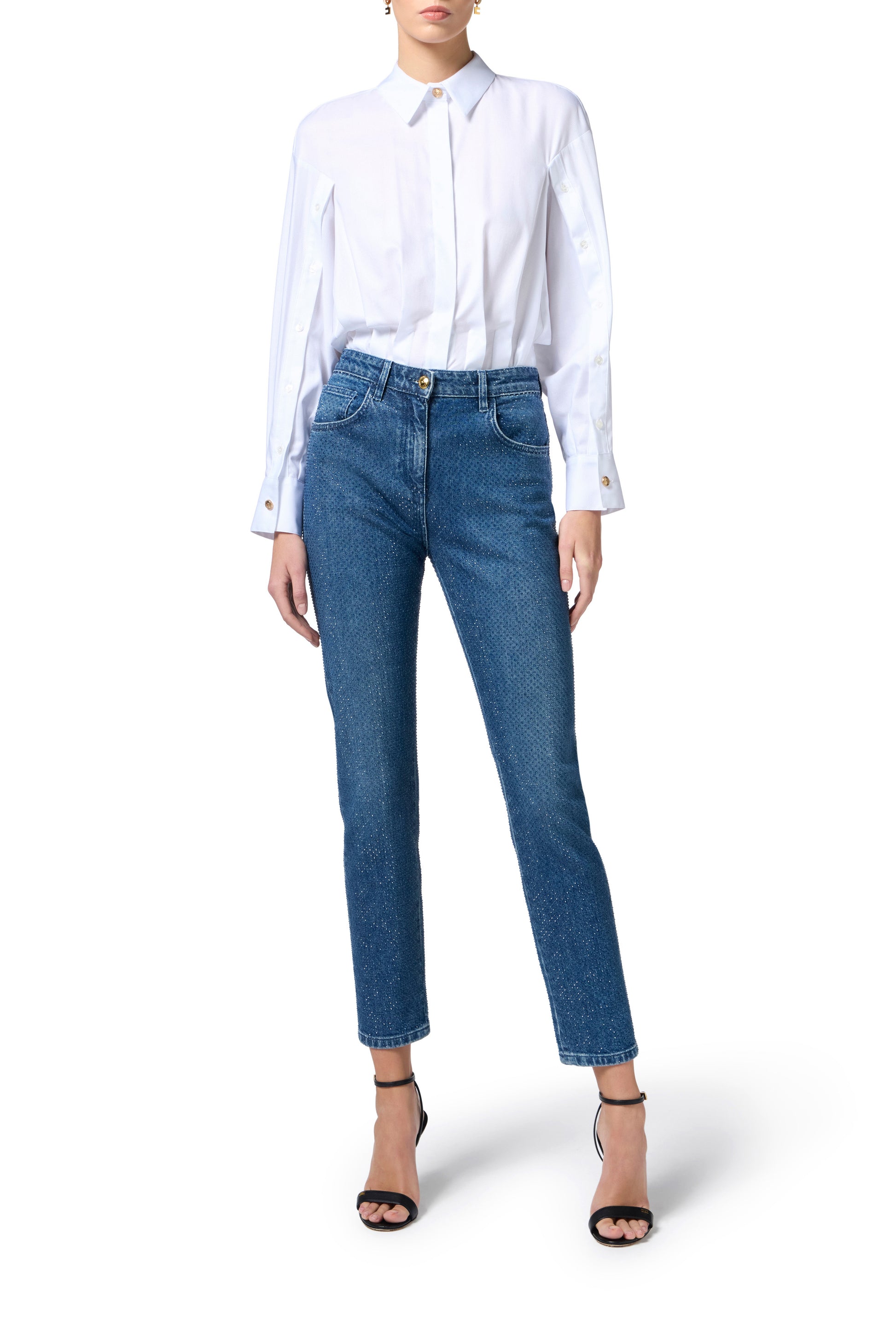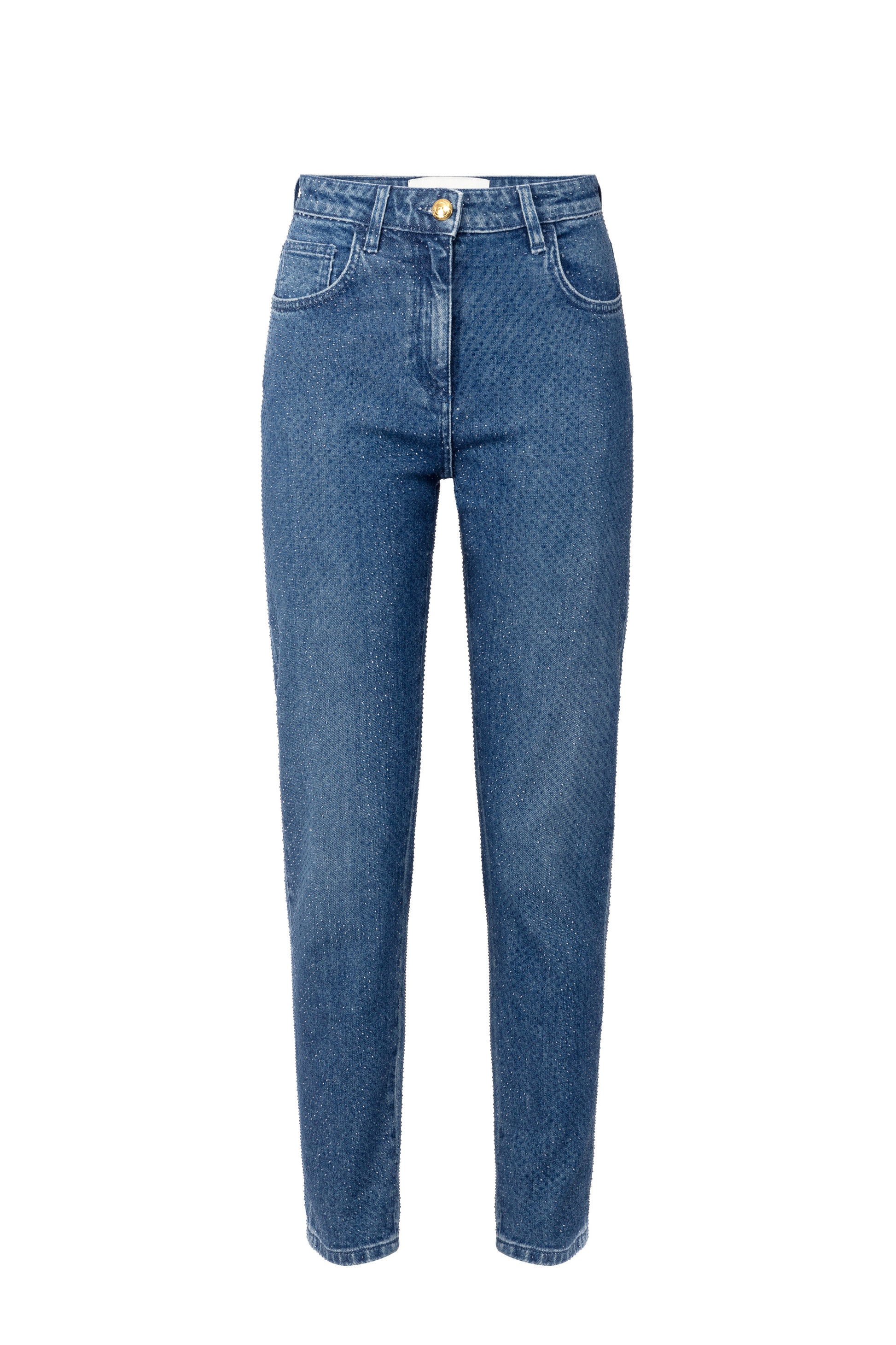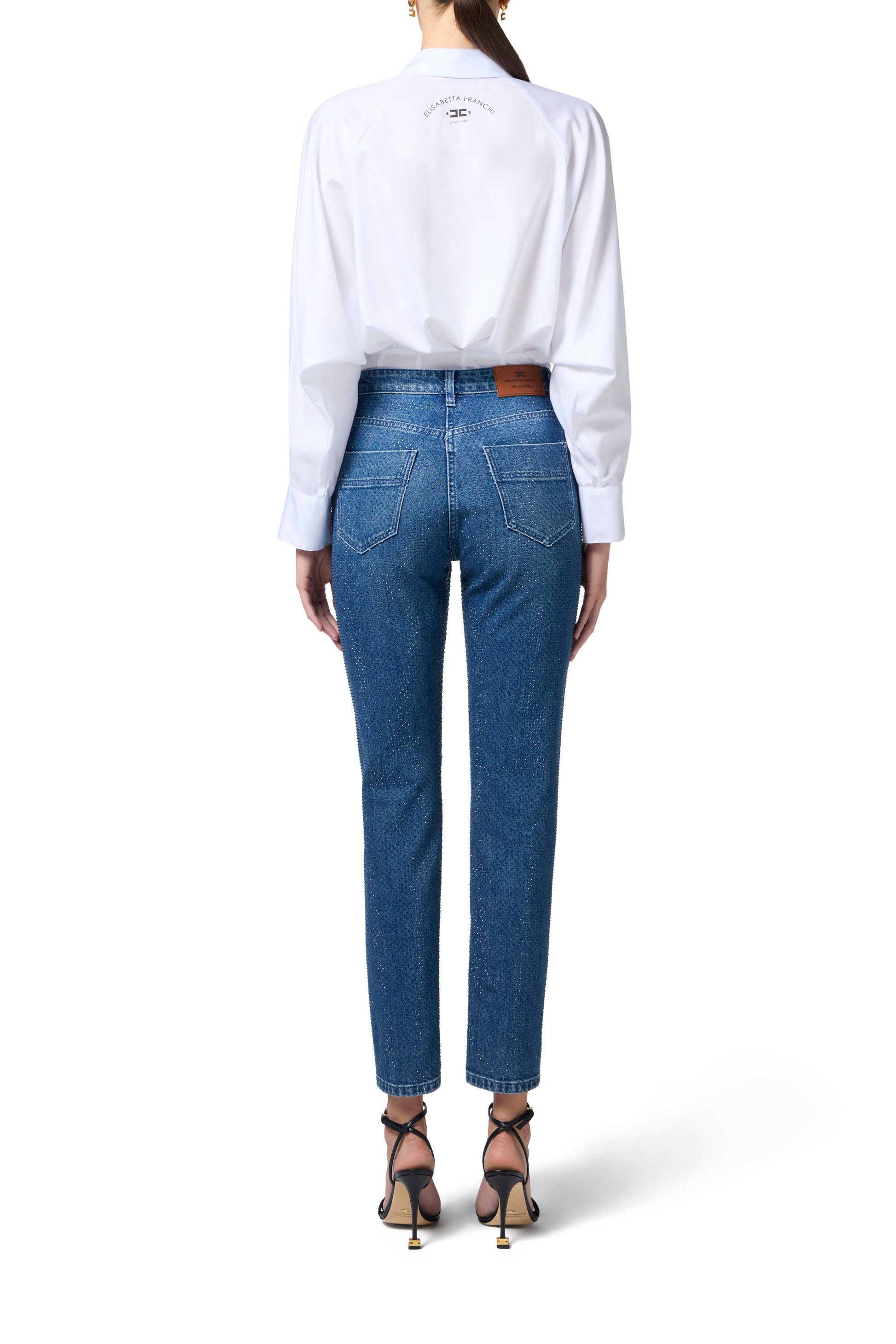 Five-pocket trousers in cotton denim characterised by the sparkling full-sequin texture decorating the entire length and the golden metal logo button. Pockets on the front and back. Slim fit.