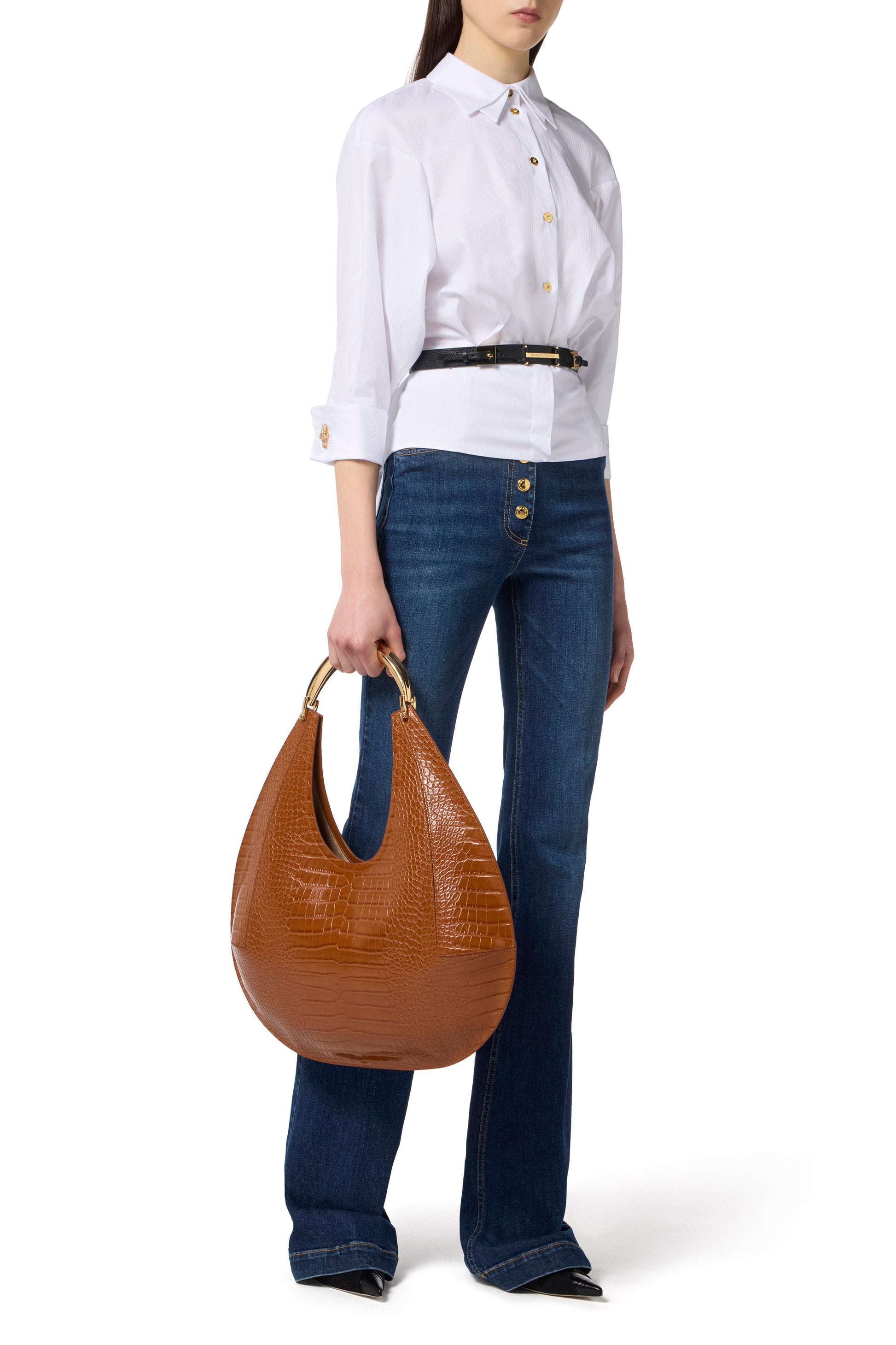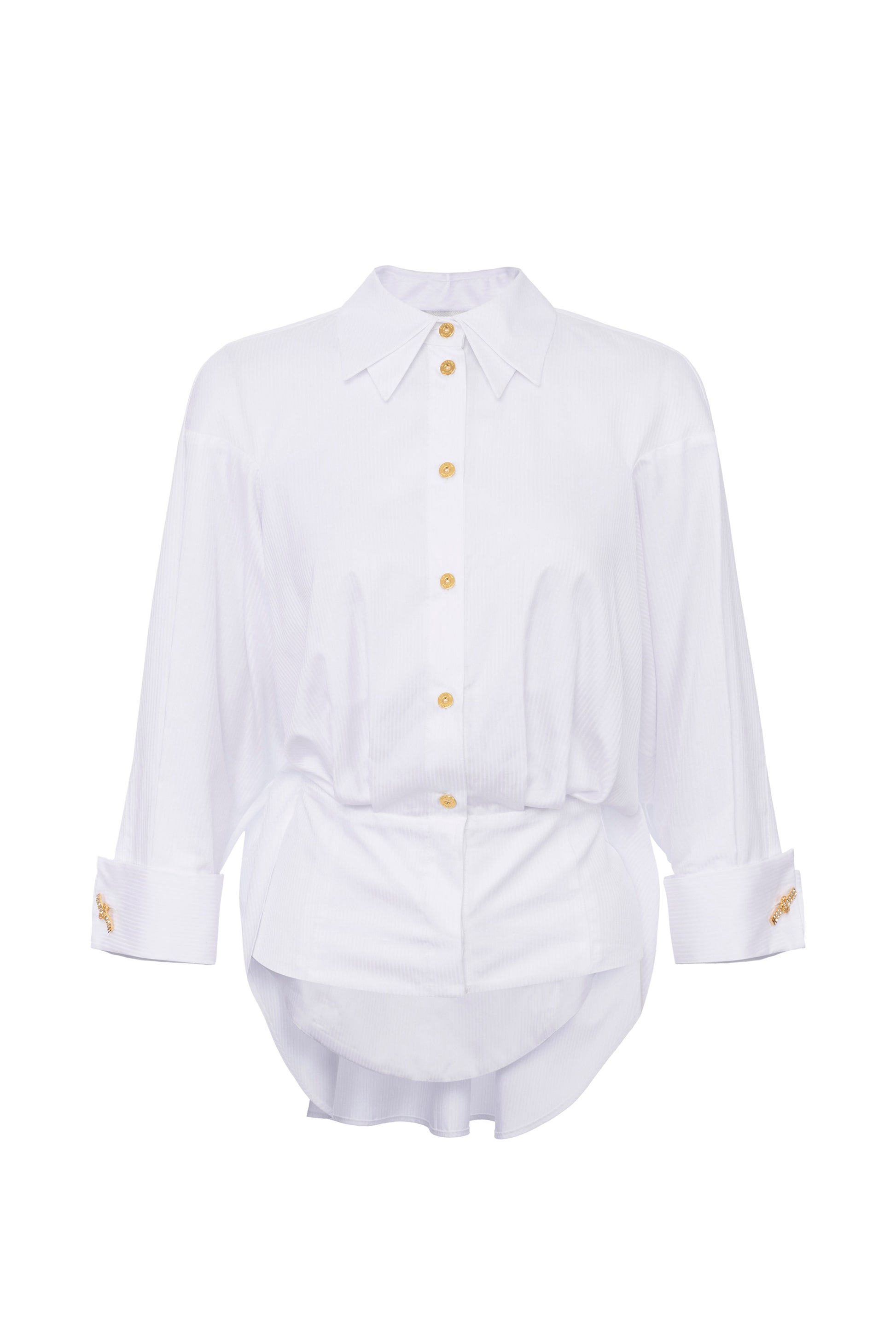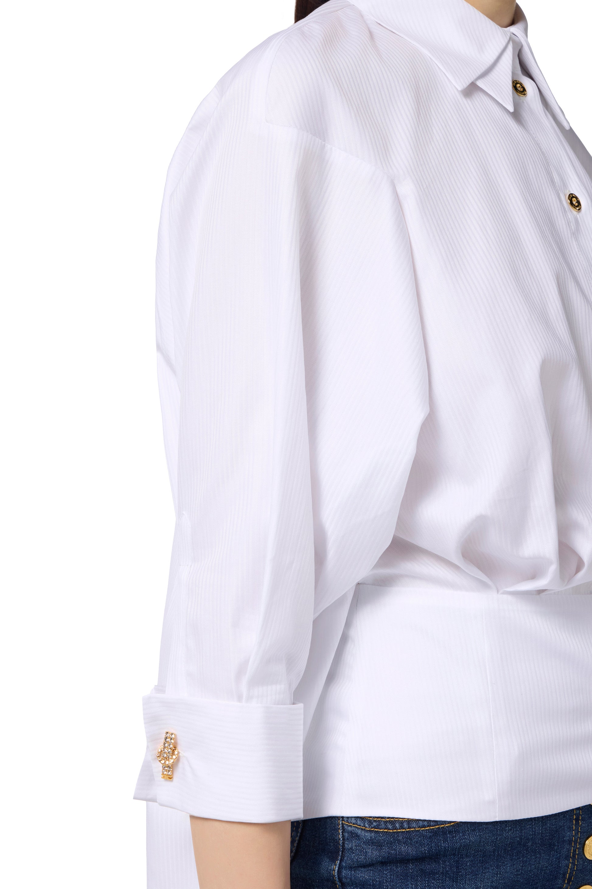 Cotton poplin shirt with oversized fit. The construction features a double collar, ¾ sleeves and a peplum at the waist with a longer, wider hem at the back for a striking effect. The texture with matching jacquard stripes gives three-dimensionality. The rhinestone cufflinks provide a touch of light.