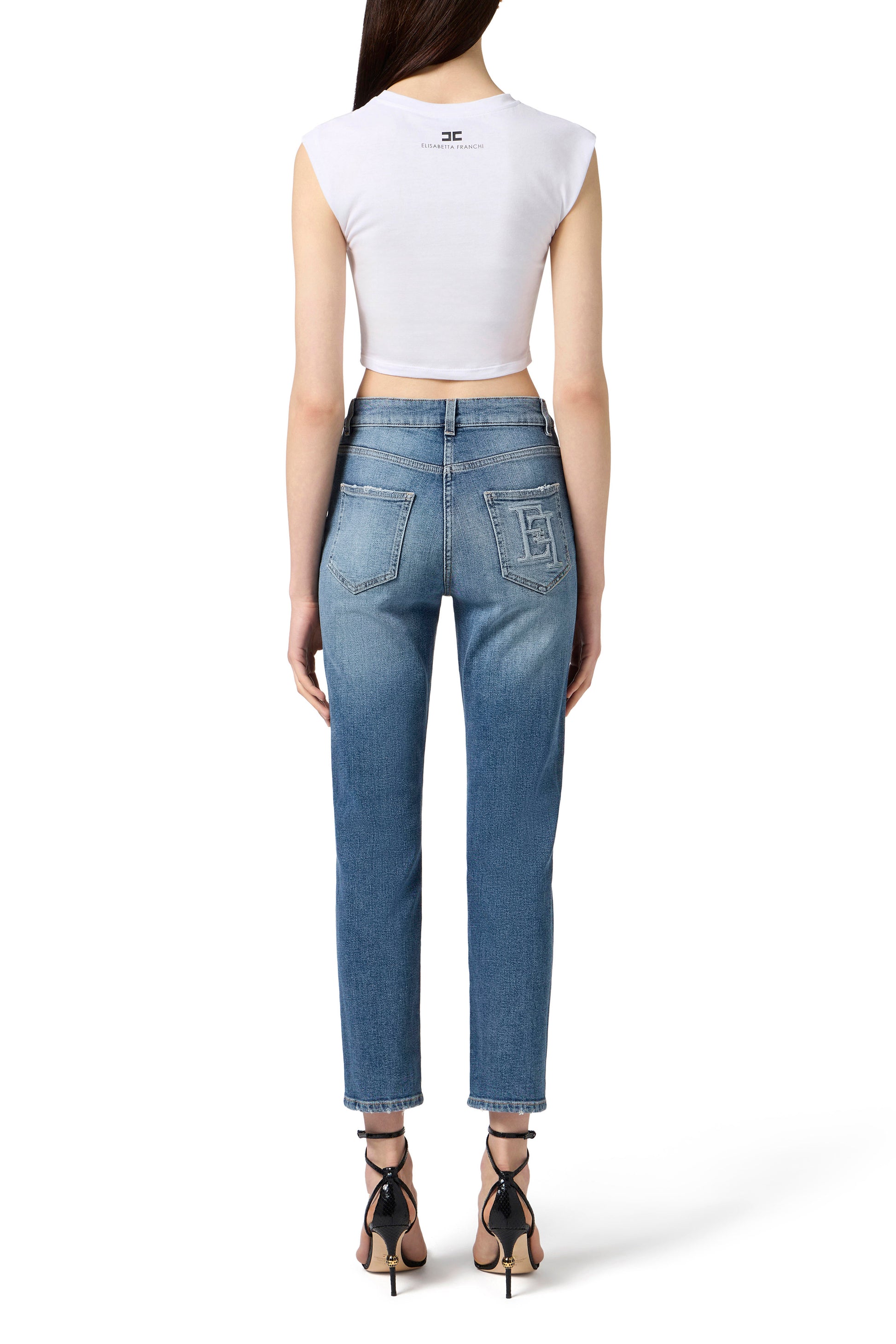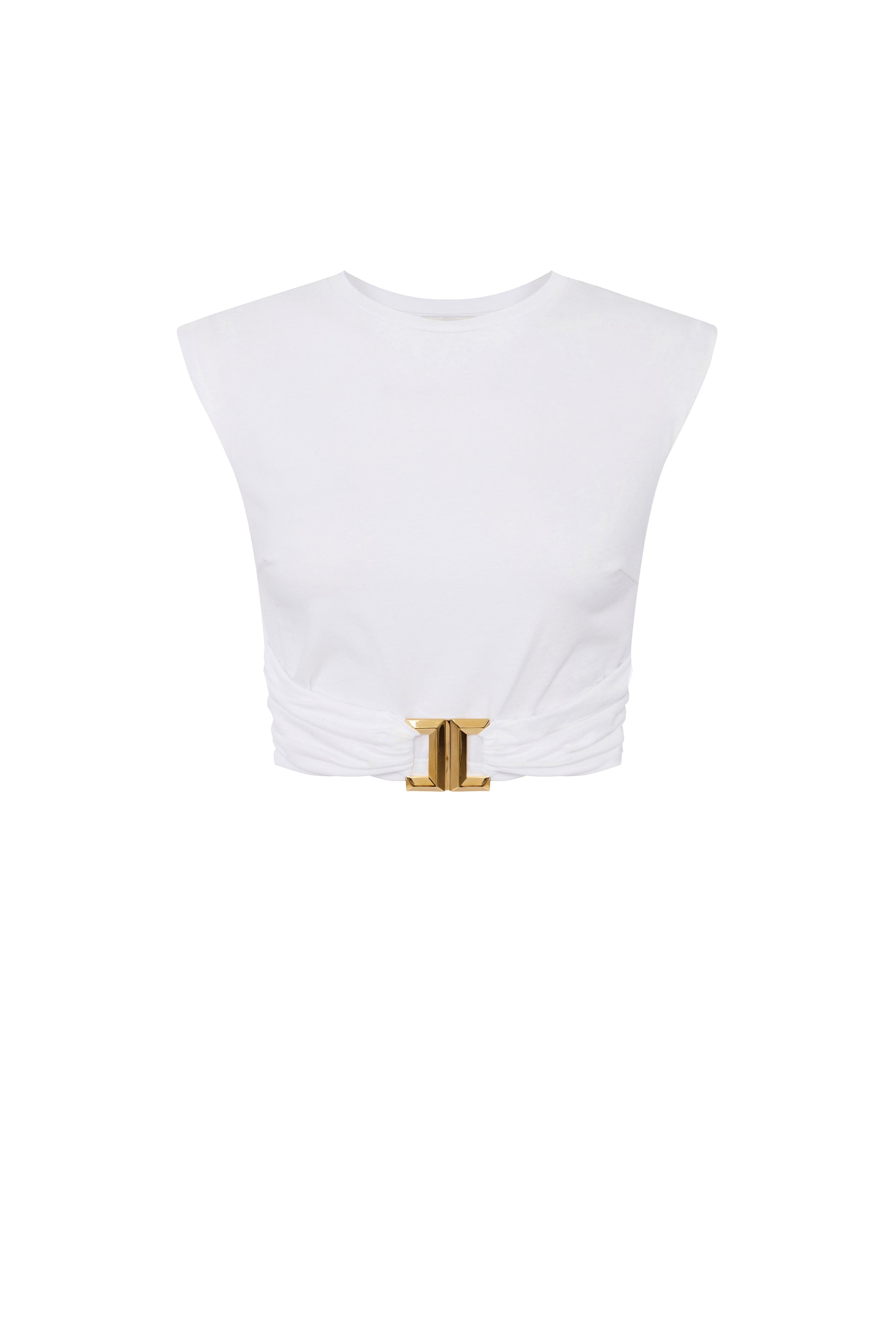 Short-sleeved cotton jersey T-shirt. It has a cropped cut and is embellished with a diamond-shaped plaque that holds the waist and forms a draping. Personalised with logo printed on the back. Slim fit.