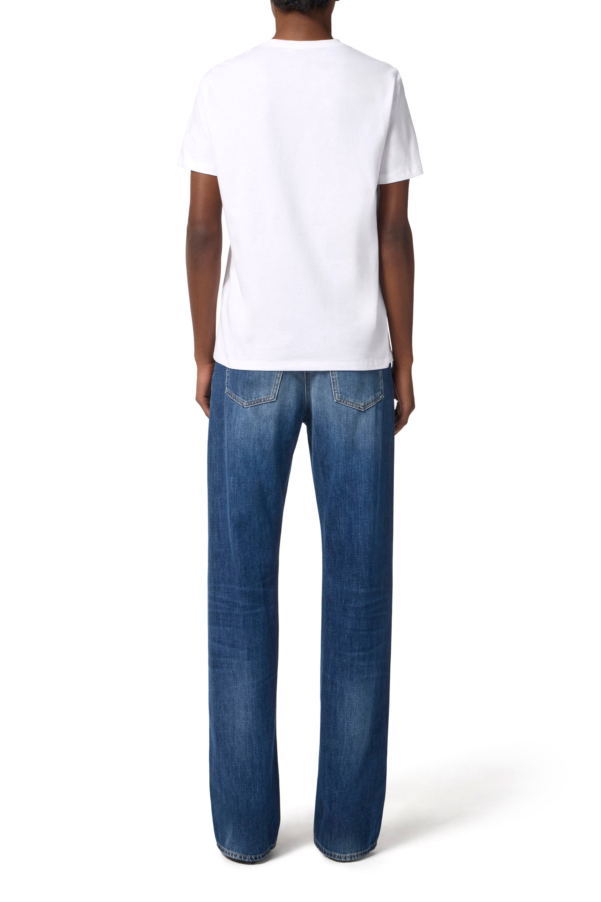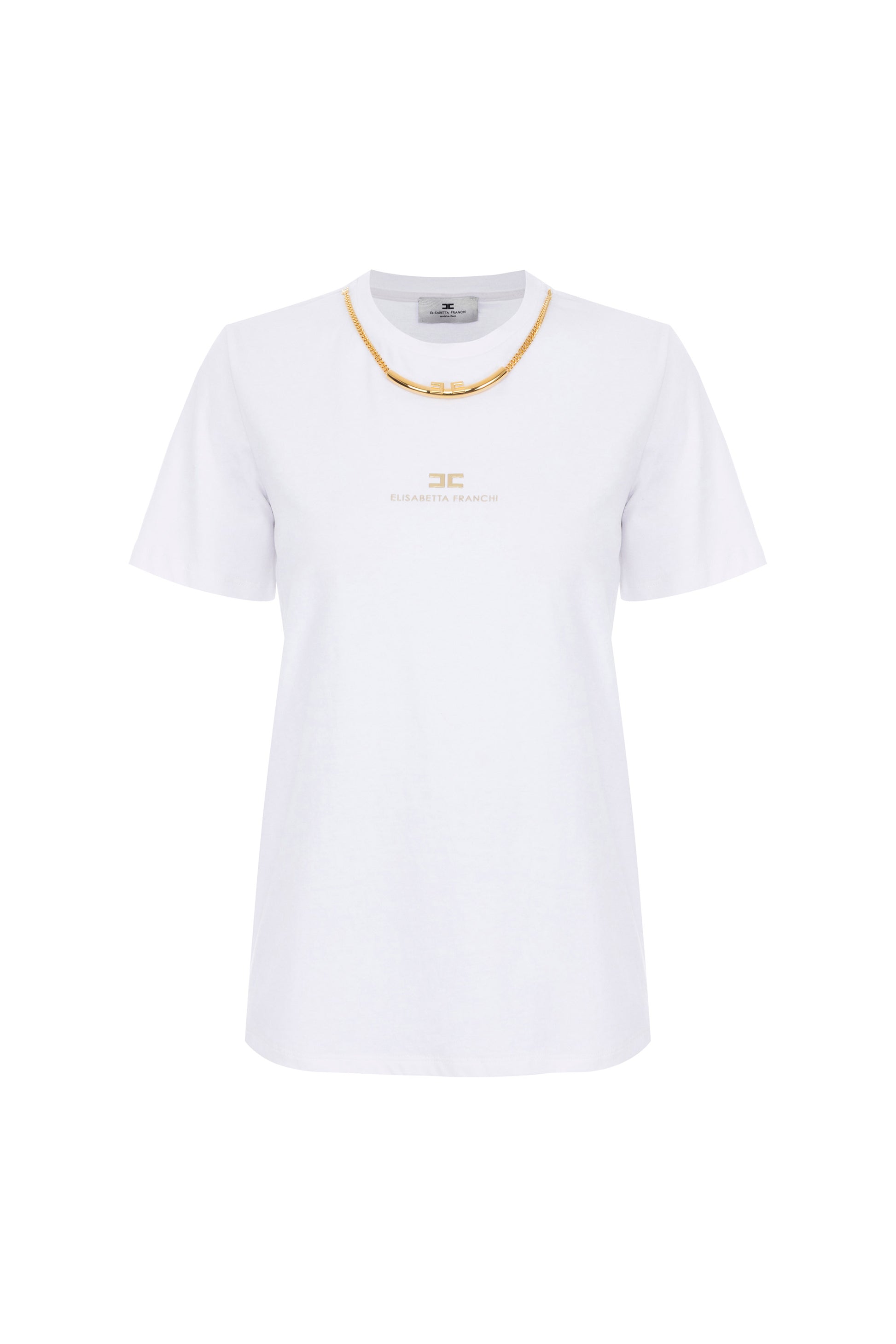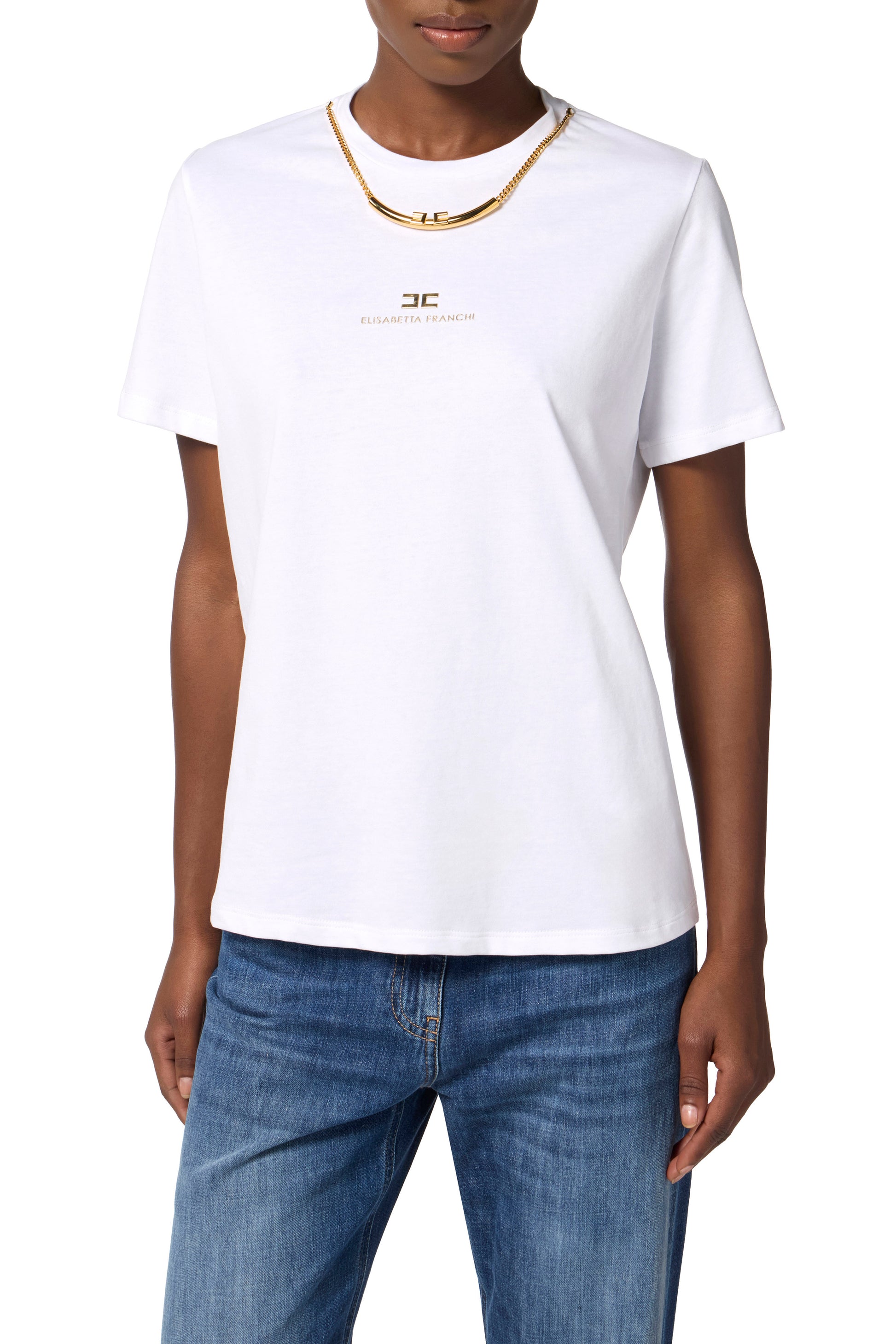 Short-sleeved cotton jersey T-shirt. It is embellished with a detachable necklace with chain, central logo and golden metal tubular elements. The embossed logo adds an extra touch of light. Regular fit.