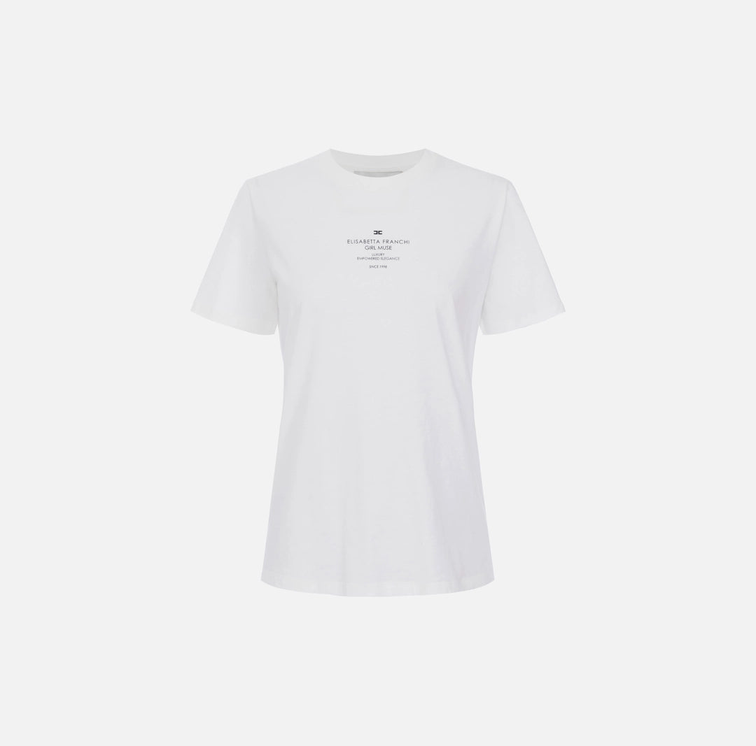 Short-sleeved cotton jersey T-shirt. With a slightly loose volume and straight line, it is personalised by the collection print on the front, with logo and lettering in a contrasting colour for a refined graphic balance. Regular fit.