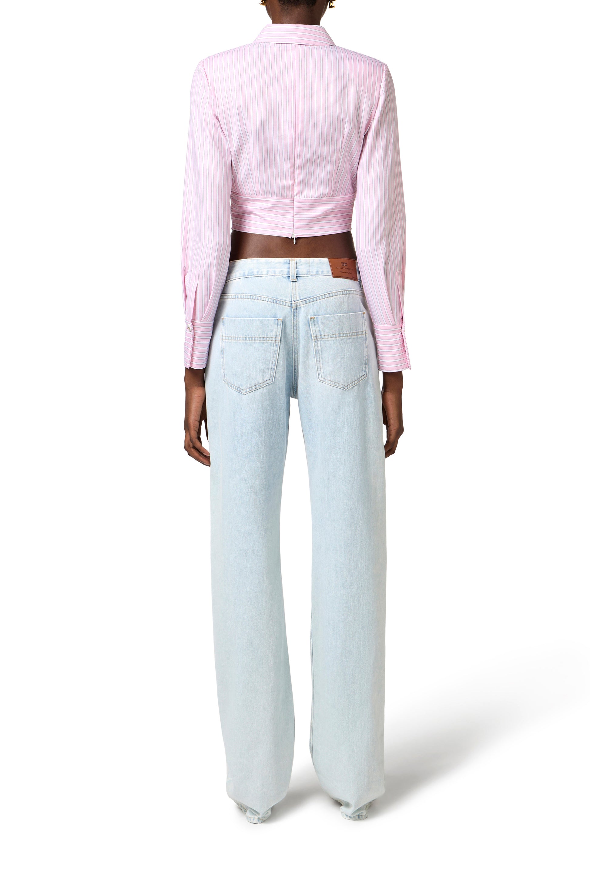 Cotton poplin shirt with long sleeves and regular collar. The bow-tied sash at the front gives movement to the garment. A touch of light is provided by the golden metal logo buttons that decorate the collar and cuffs. Regular fit.