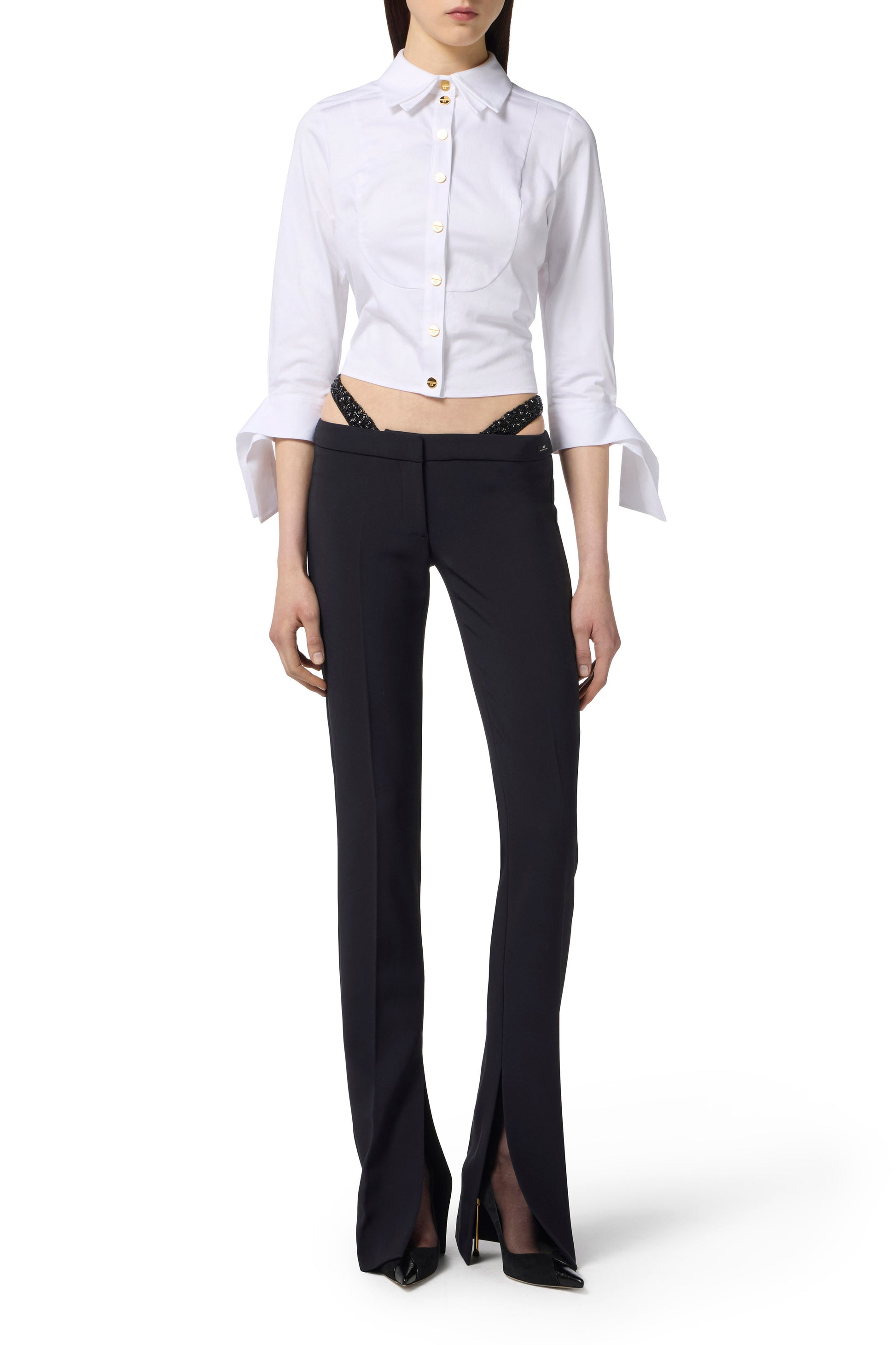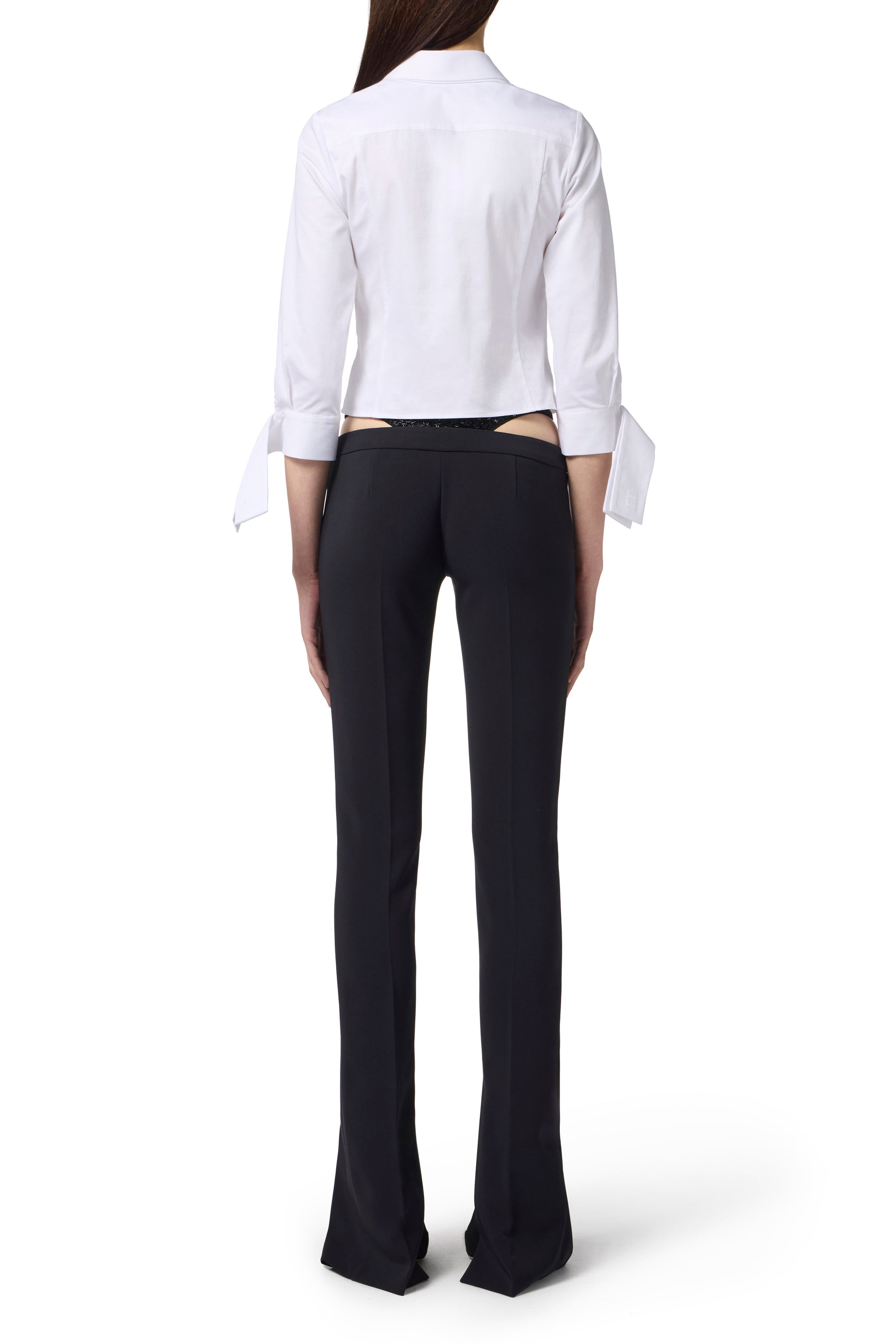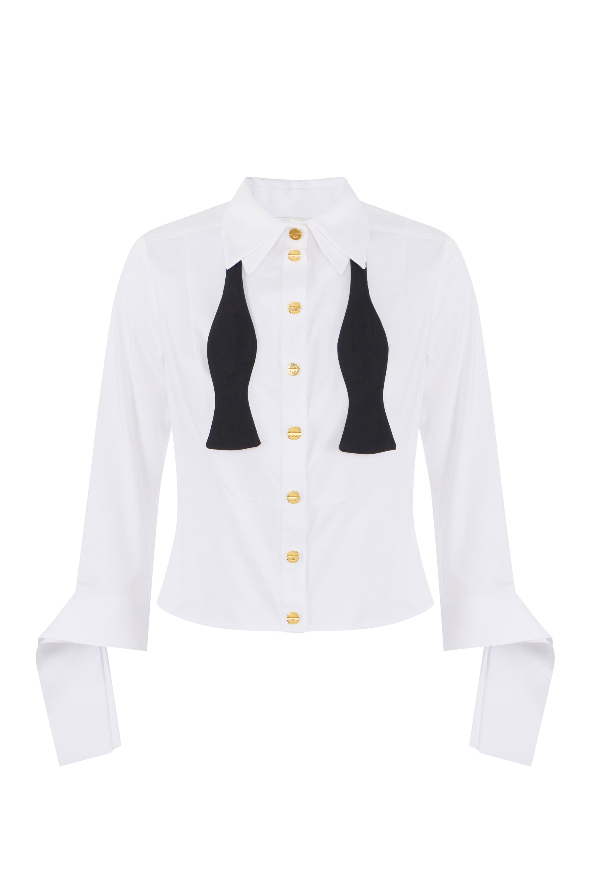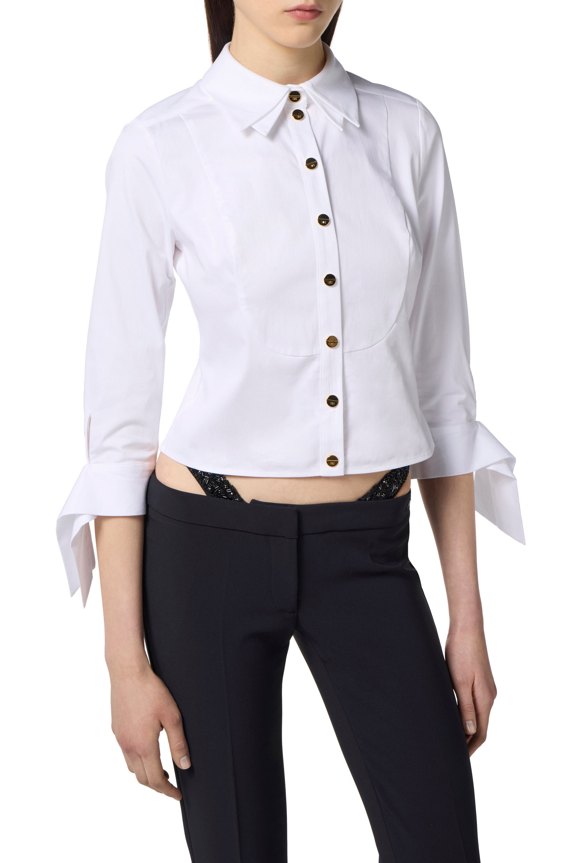Cotton poplin shirt with slim fit. It has a double collar enhanced by the satin loose bow tie, removable for more styling options. The dickey and ¾ sleeves with logo-embroidered tie cuffs complete the garment. Buttons in golden metal with logo.