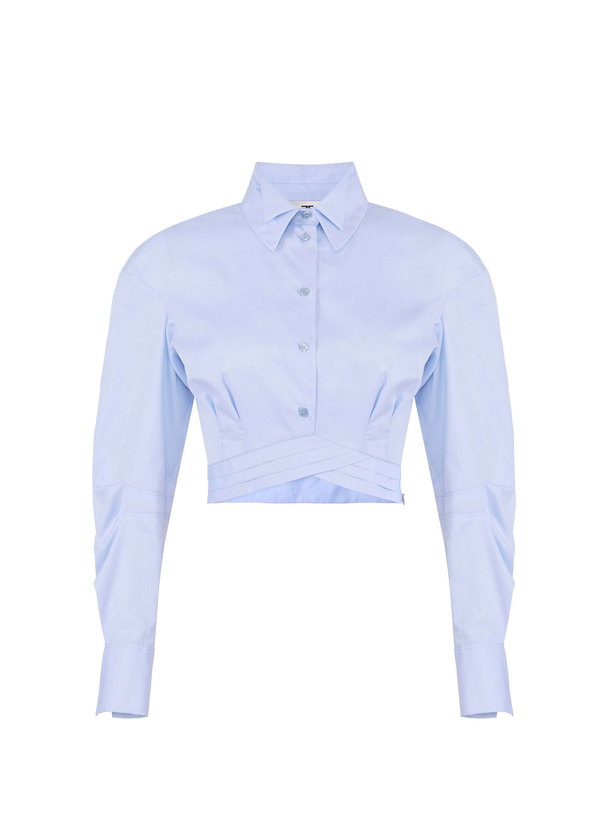 Cotton poplin shirt with regular fit. It stands out for its interplay of volumes that blend with sartorial details such as the double collar inspired by tuxedo jackets, loose sleeves and a waistband with pleats.