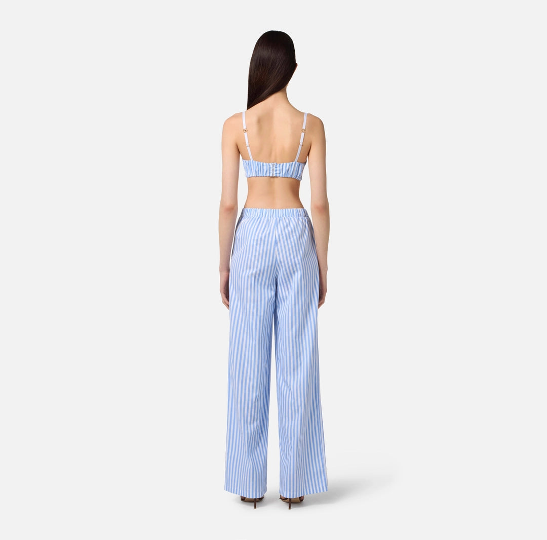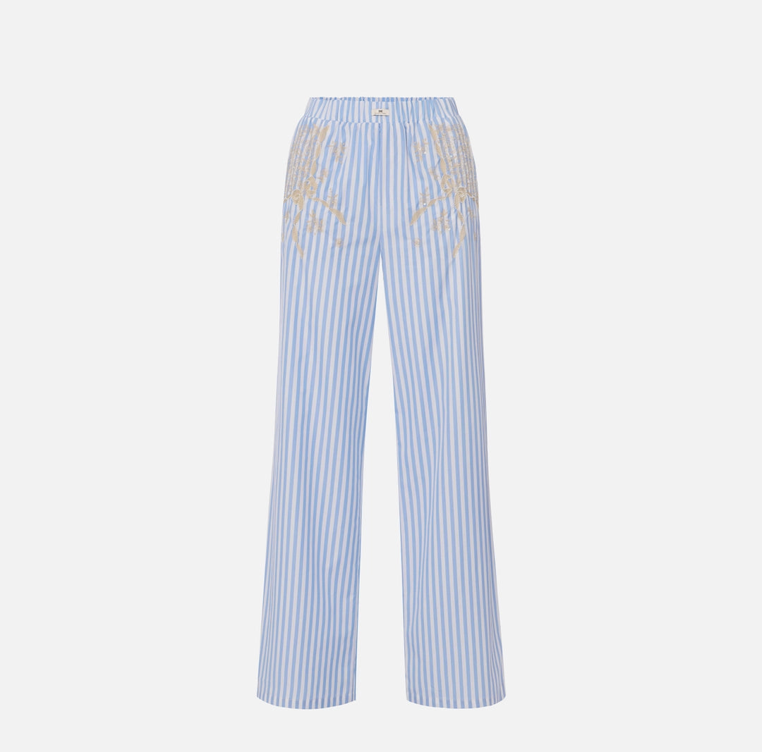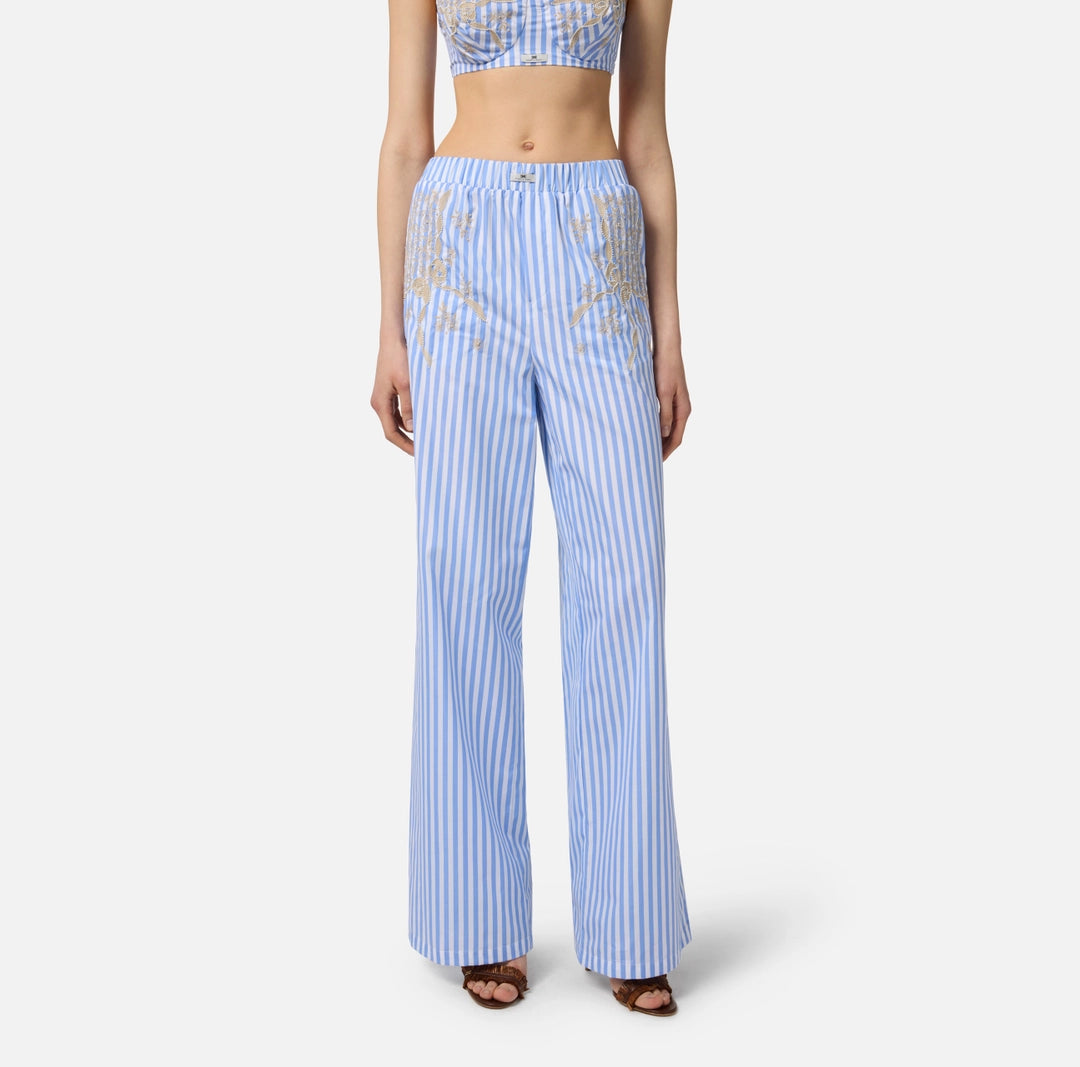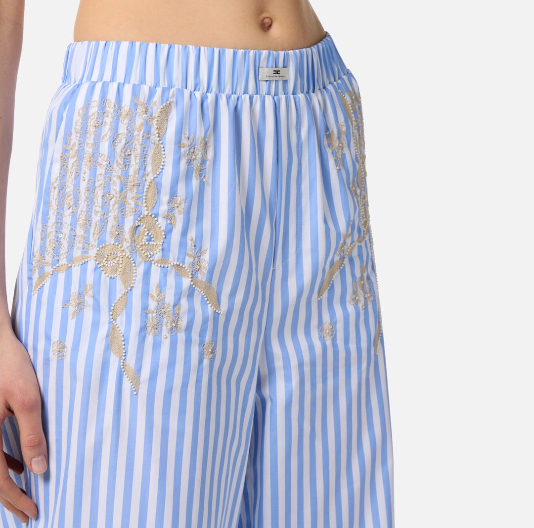 Cotton poplin trousers with regular fit. With elastic waistband, they are embellished on the hips with floral hand-made embroideries, and enriched with delicate bead appliqués. The stripes create a dynamic and refined pattern.