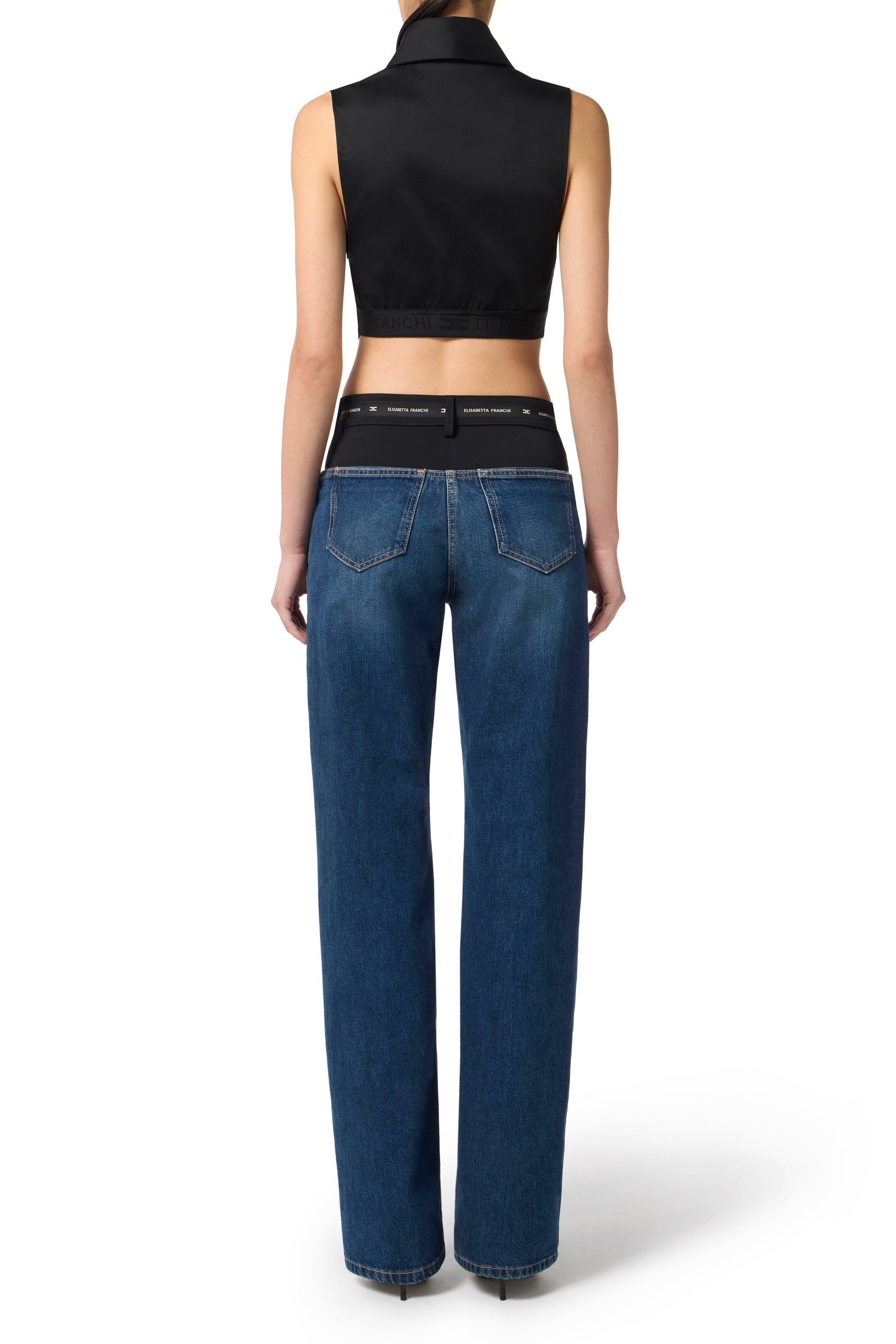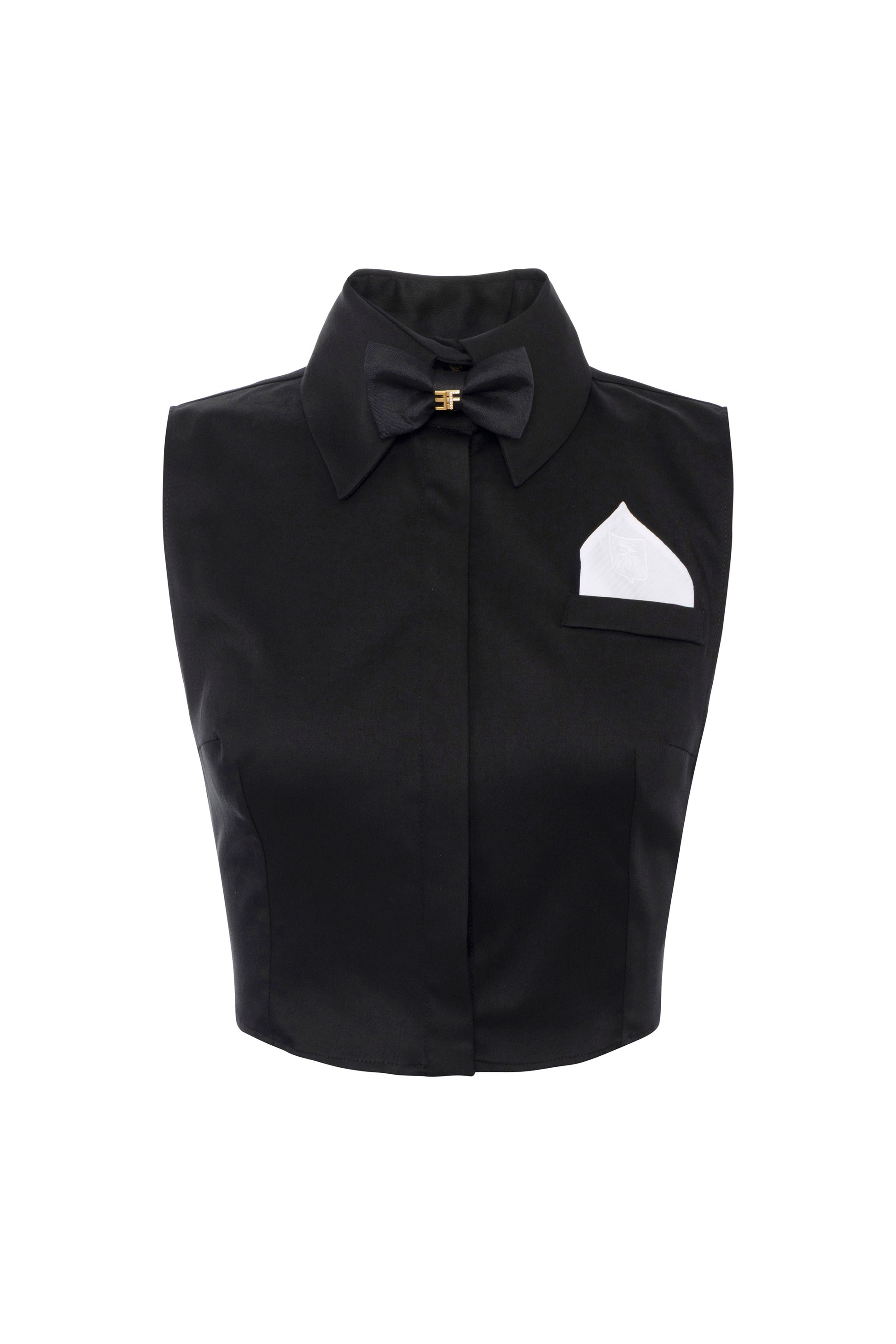 Sleeveless cotton satin shirt with regular fit. With a classic collar, it is characterised by a bow tie with jewel detail, made of satin and removable for many styling options. The cropped cut with elastic at the back gives a dynamic line. Breast pocket with embroidered pocket square.