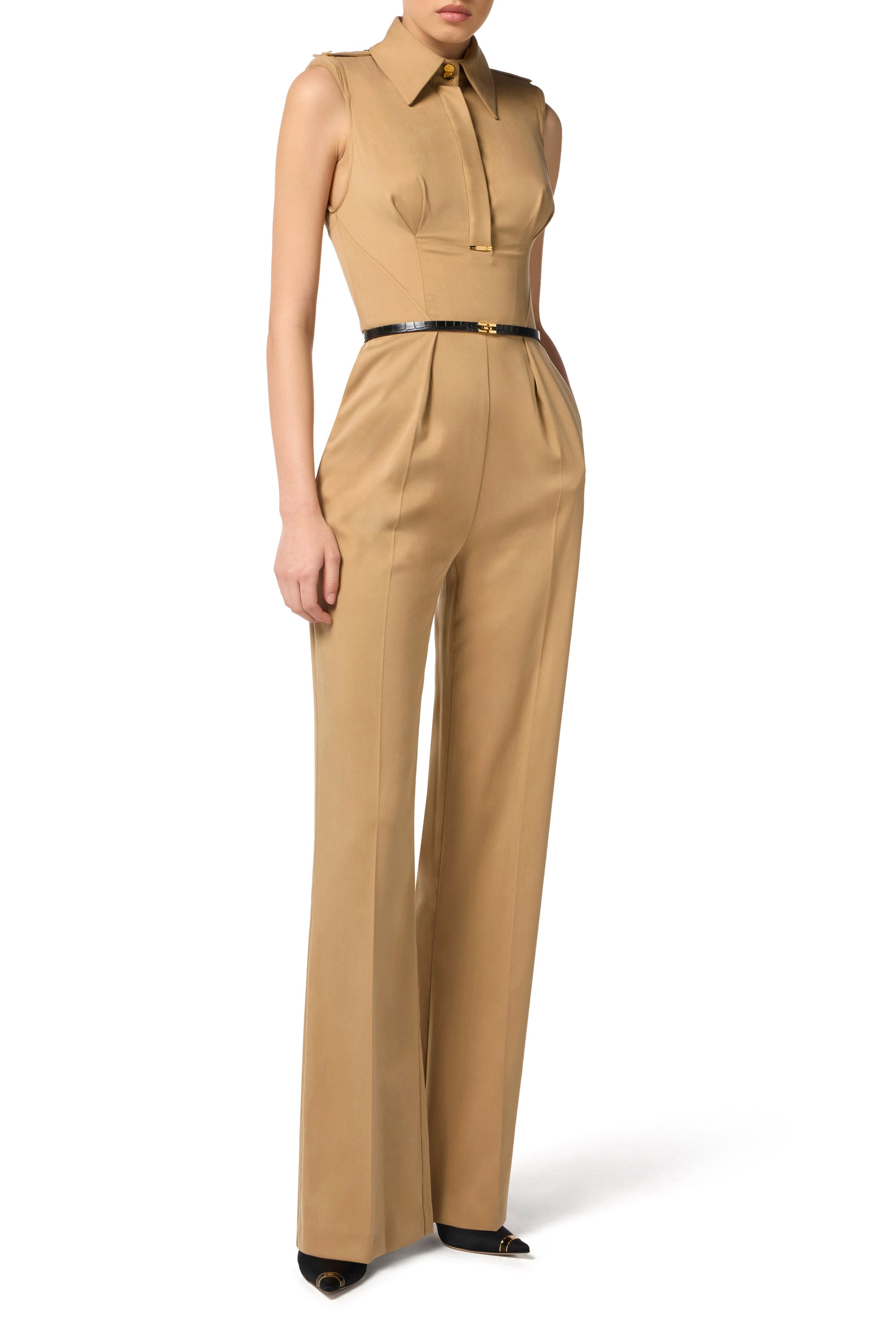 Cotton satin jumpsuit with regular fit. The top has a polo shirt collar and shoulder pads protruding from the armholes, decorated with fixed buttons and removable frogs. Finished with bustier-inspired pleats, it features flowing voluminous trousers. Belt at the waist with crocodile print texture and logo.
