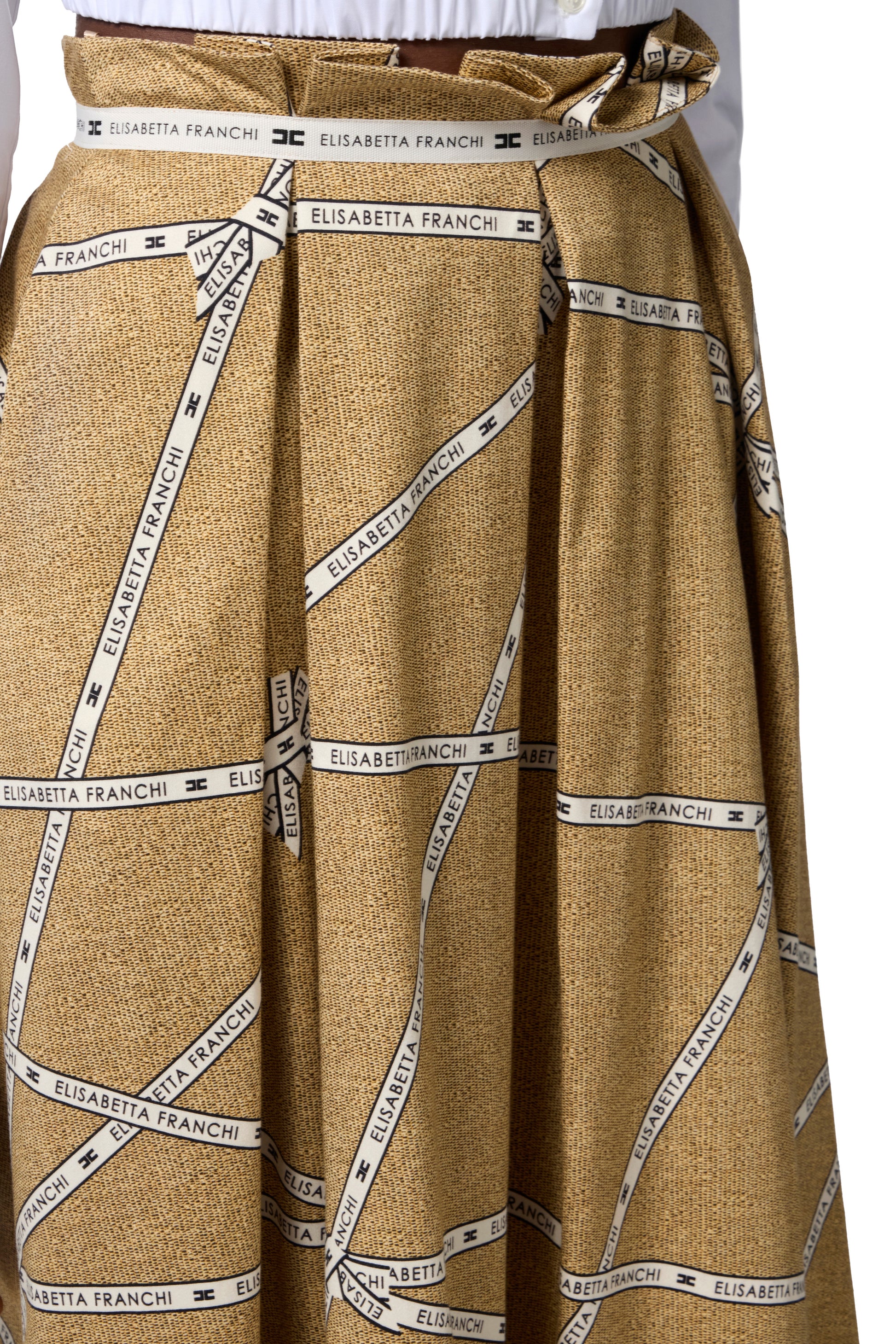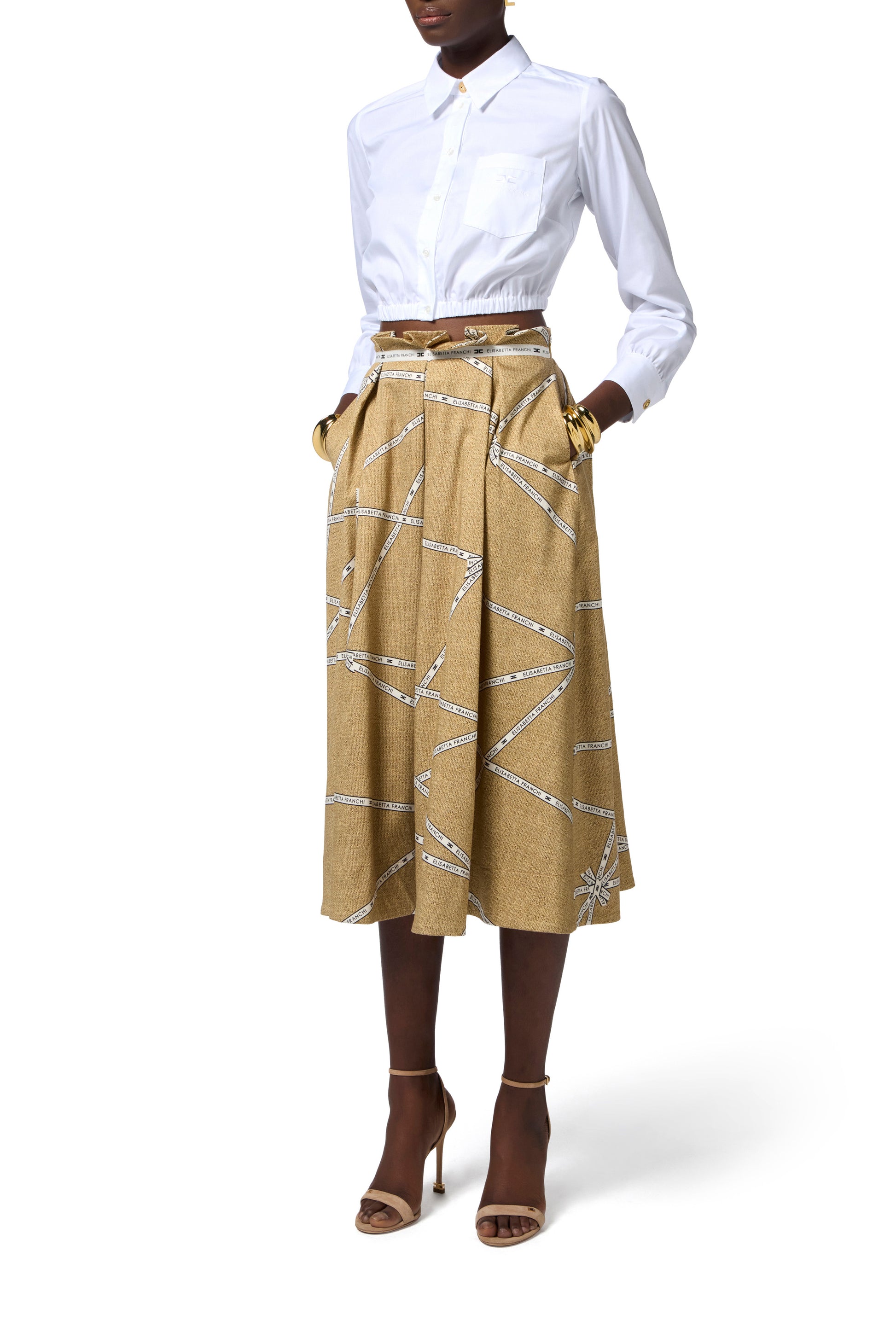 Cotton skirt with circle construction and pockets. Protagonist is the all-over multicoloured pattern that mixes the iconic collection pattern such as the raffia-effect print and the logo ribbons, one of which is made in 3D to decorate the waistline. Regular fit.