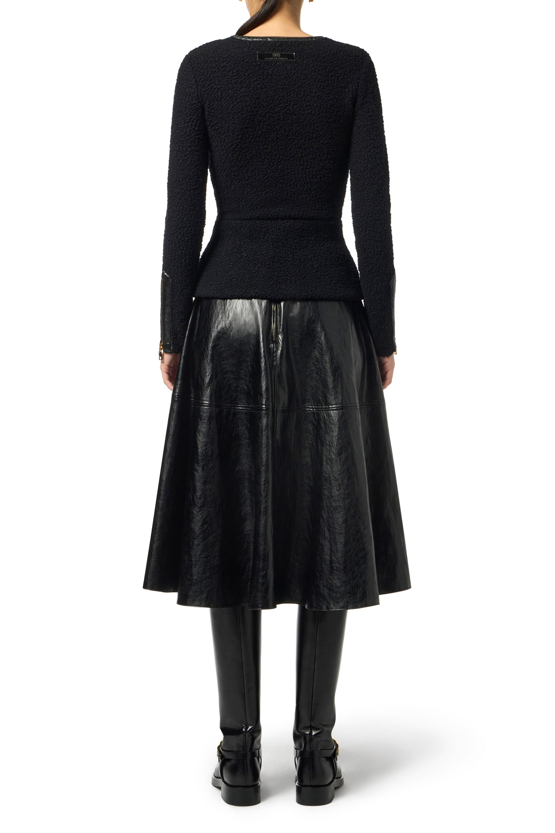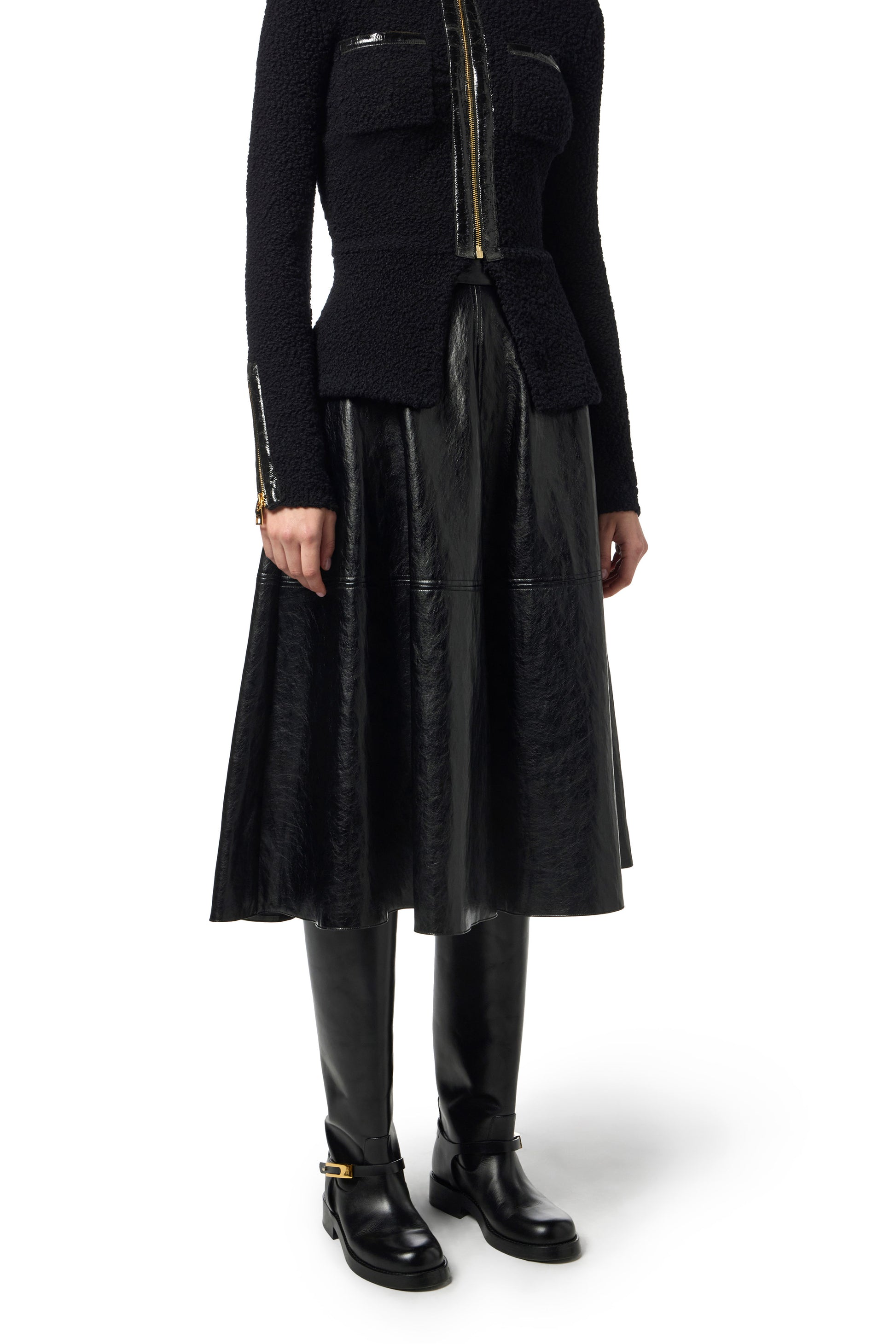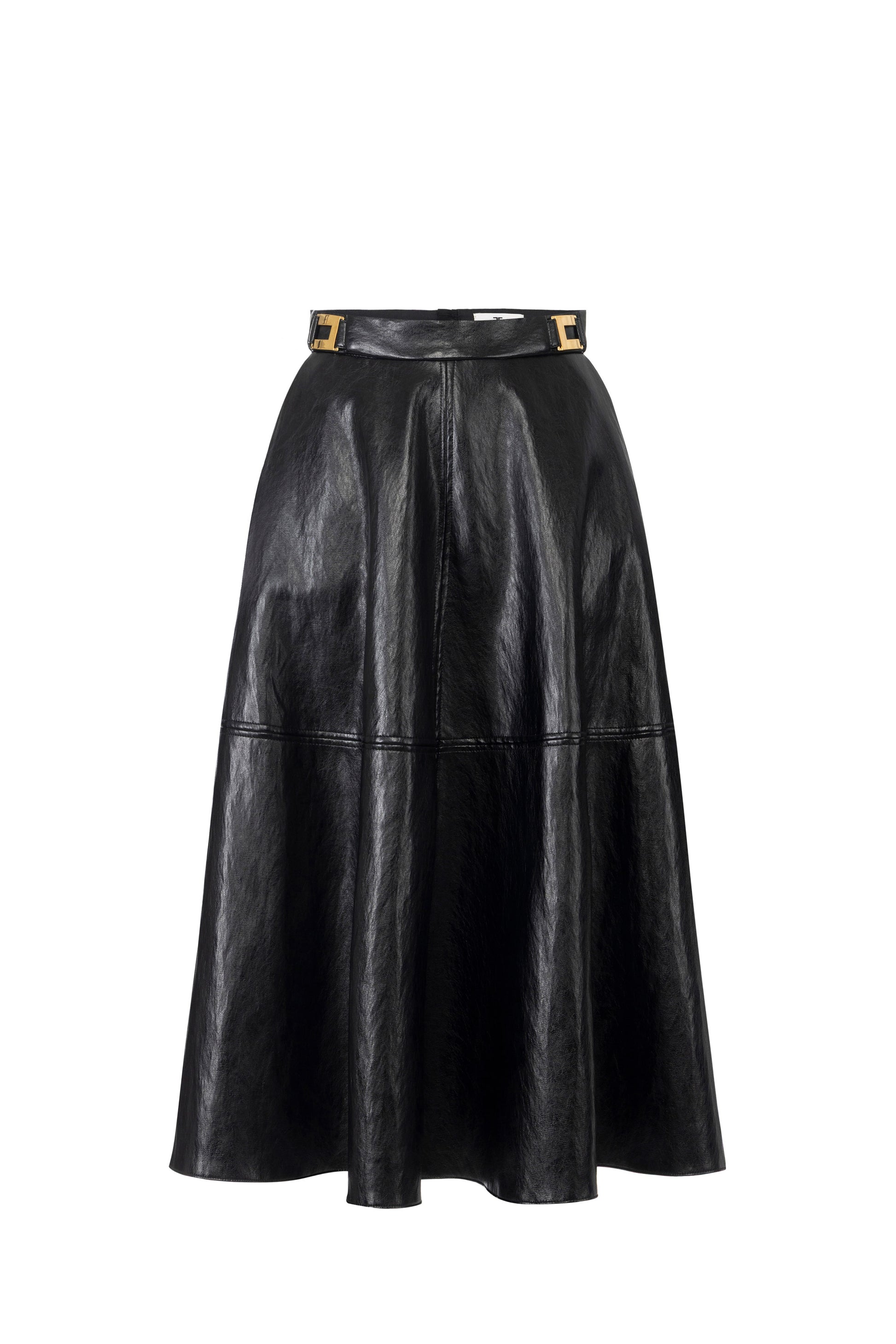 Crackled leather-effect synthetic material skirt with a regular fit. Embellished with golden metal logo accessories, it has a circle line with a flared bottom that lends lightness and elegance to the fit.