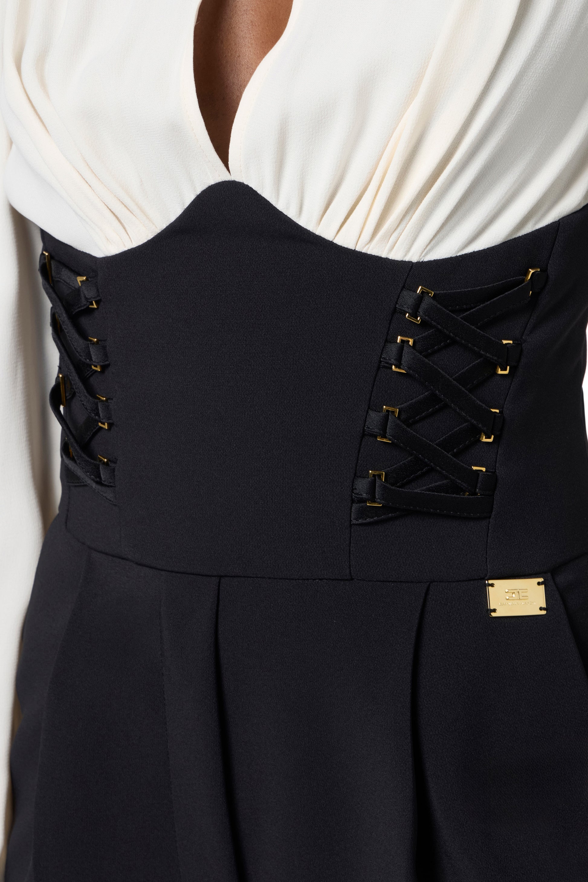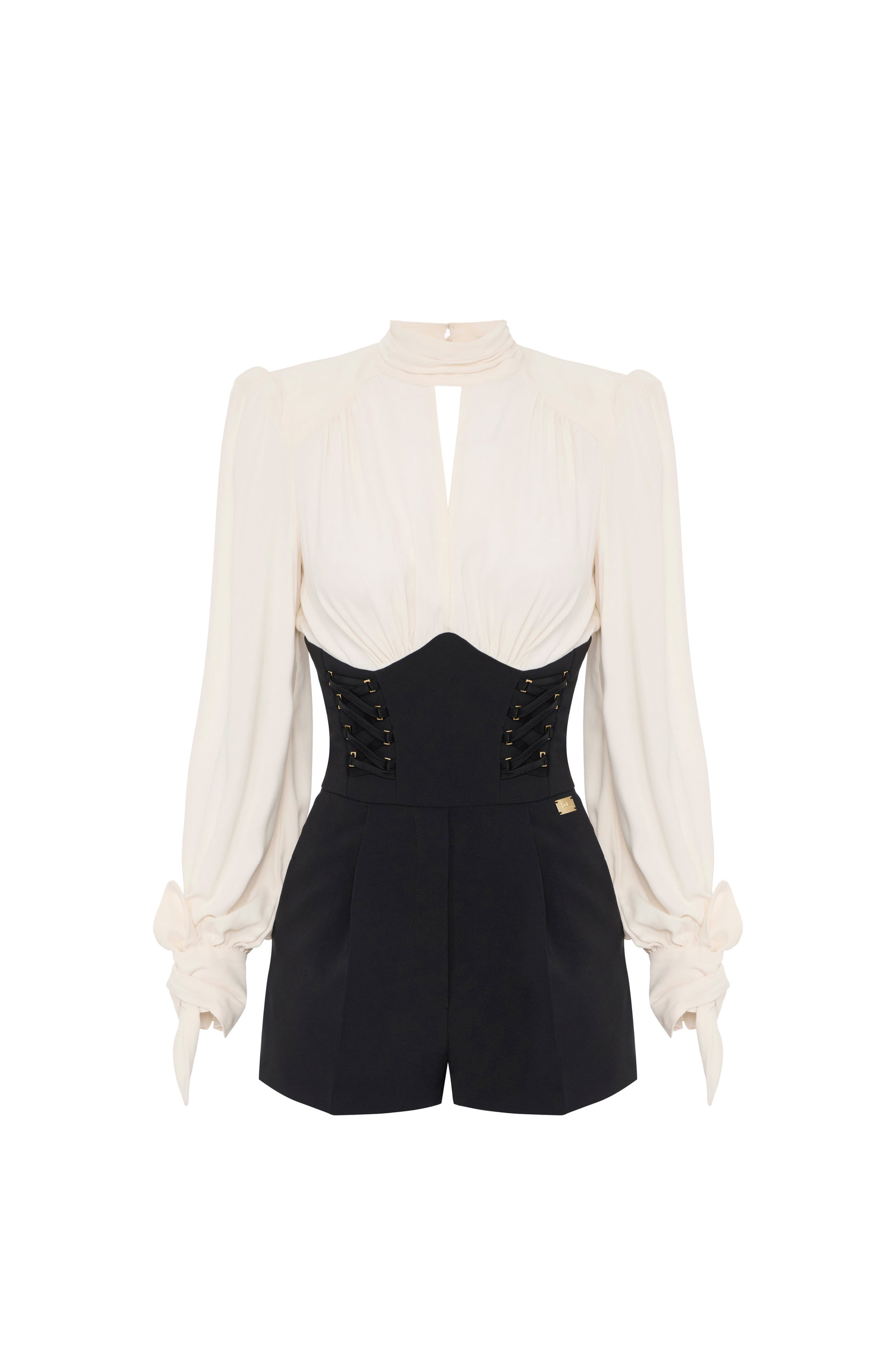 Romper suit in double-layer crêpe fabric with slim fit. The top is a totally removable long-sleeved georgette blouse with tied collar and cuffs. The bottom is decorated on the bust with satin laces criss-crossed through square loops.