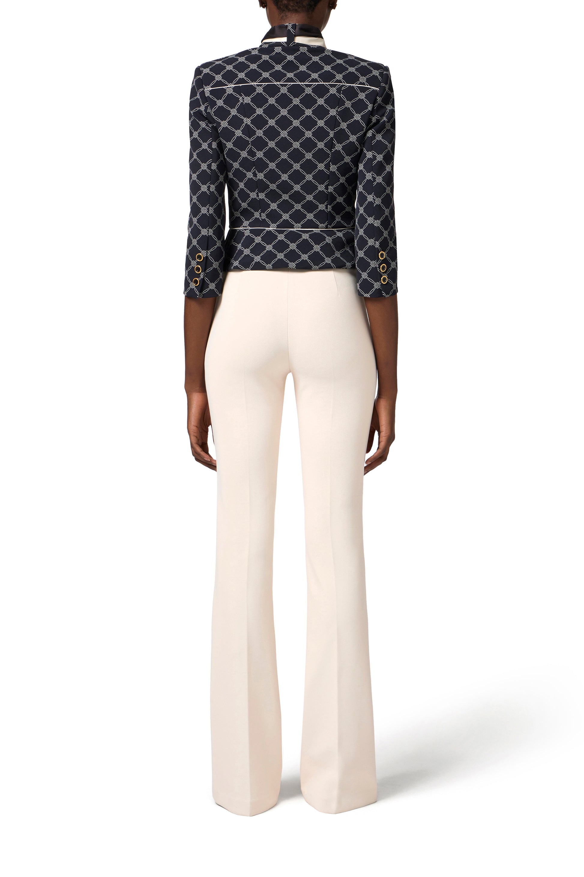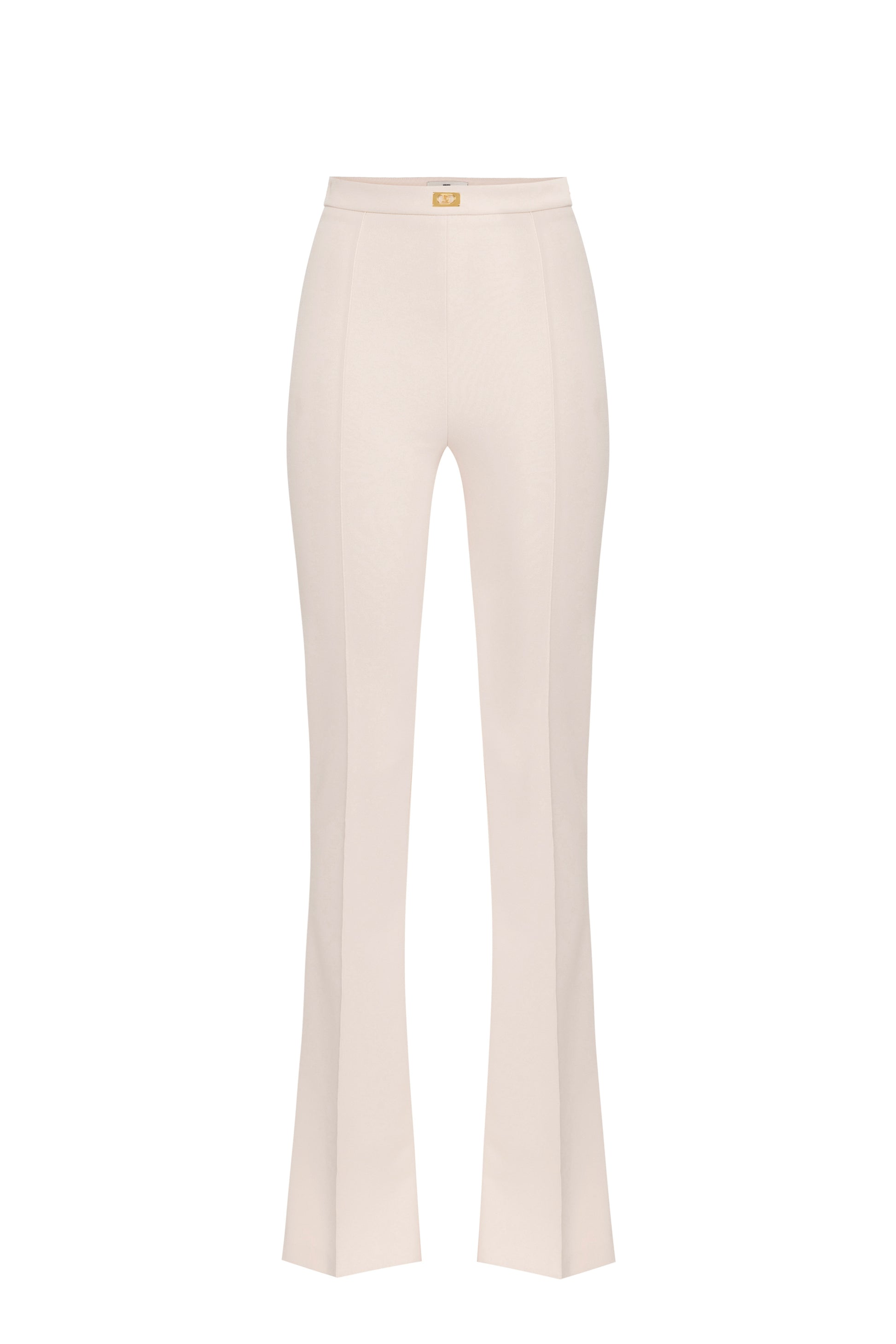 Stretch crêpe bell-bottom trousers with slim fit and leg flared at the bottom. The golden metal logo plaque on the waistband adds a touch of light to the garment. Part of the Essential collection, to create the perfect wardrobe.