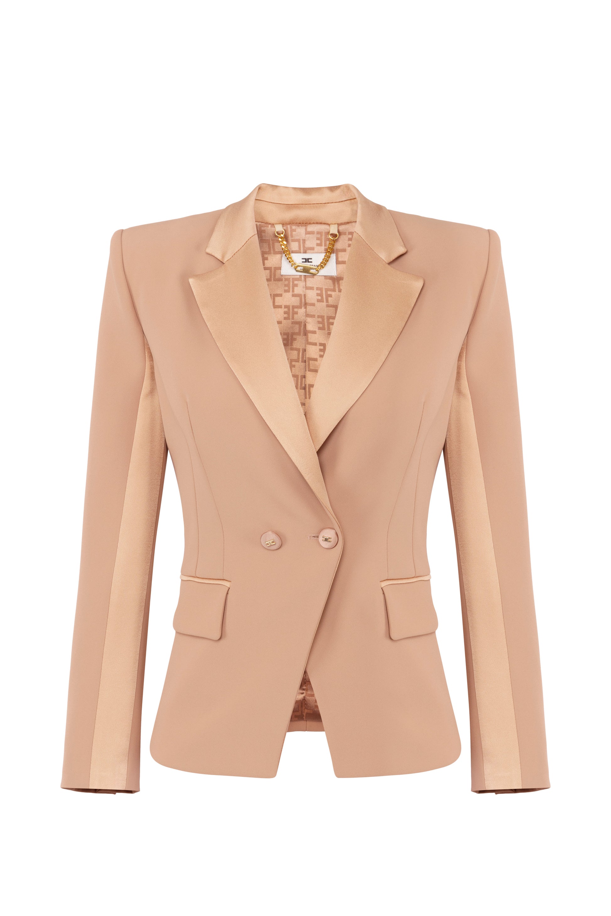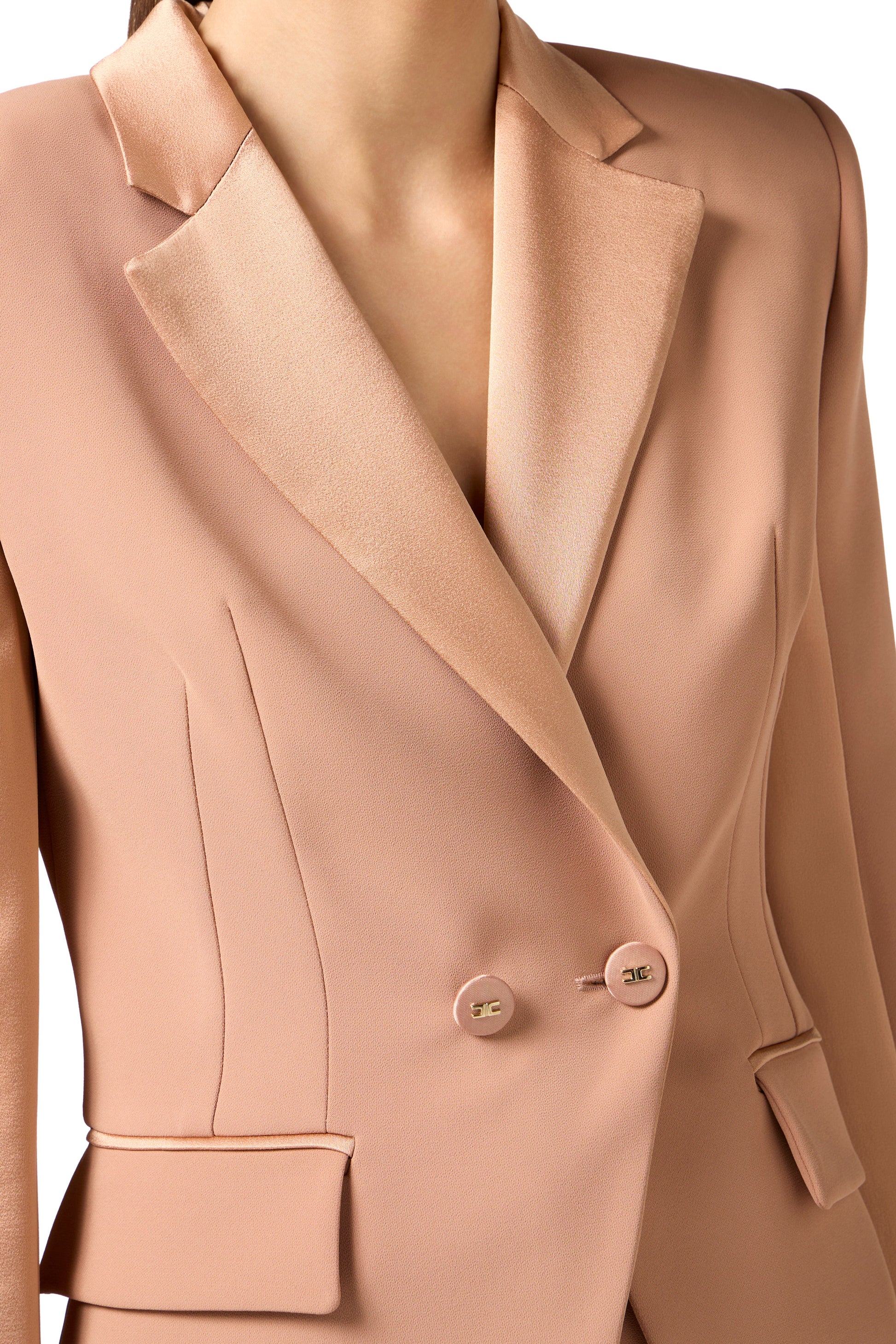 Single-breasted jacket in lightweight crêpe fabric with welt pockets. The blazer is characterised by shiny satin lapels that create luminous contrasts. Closure with satin button embellished with golden metal logo.