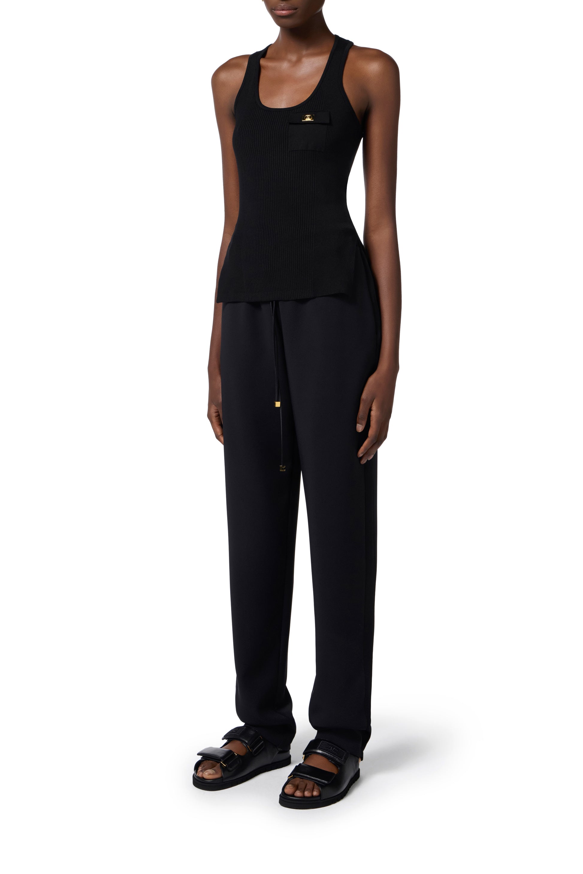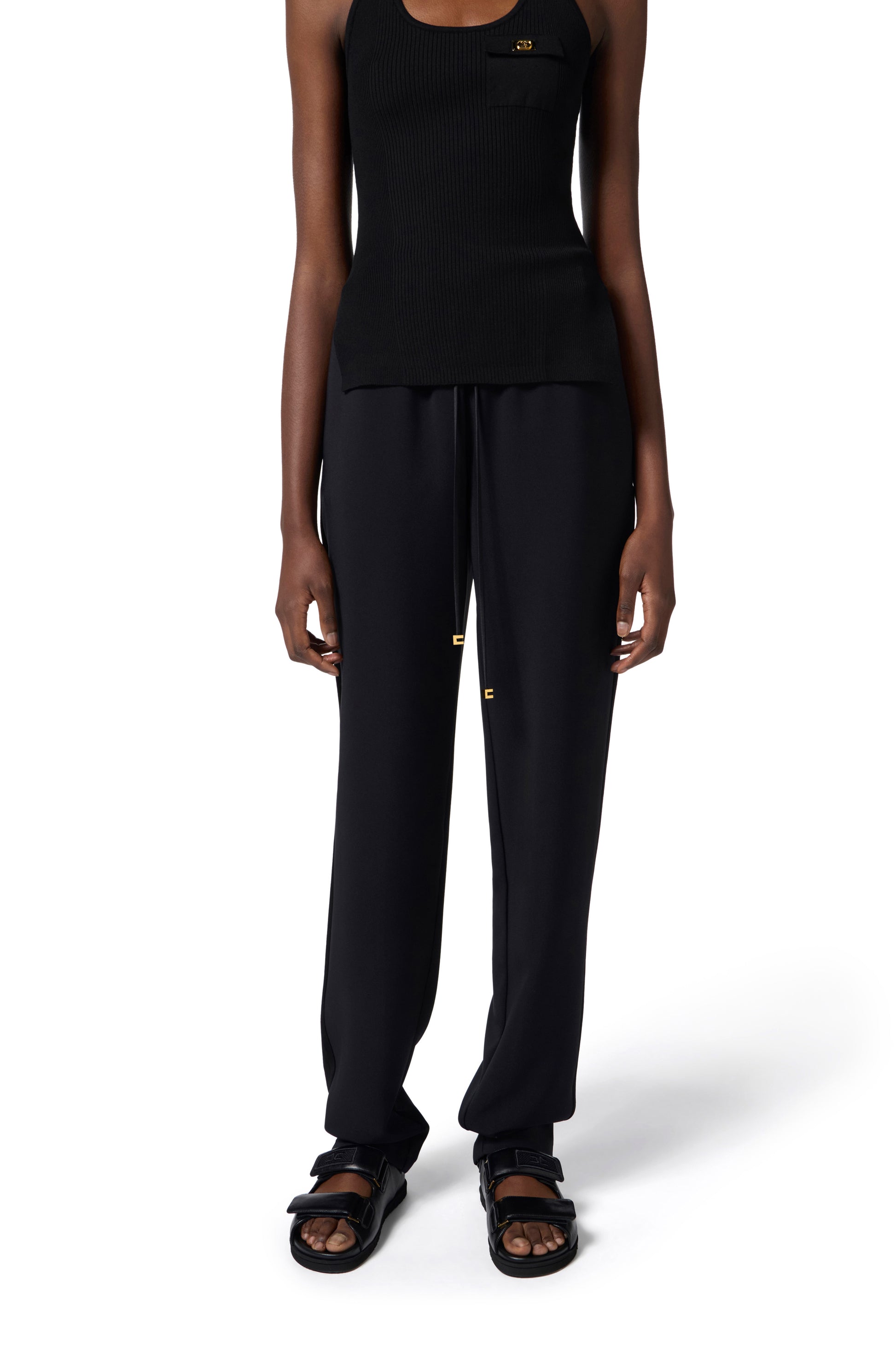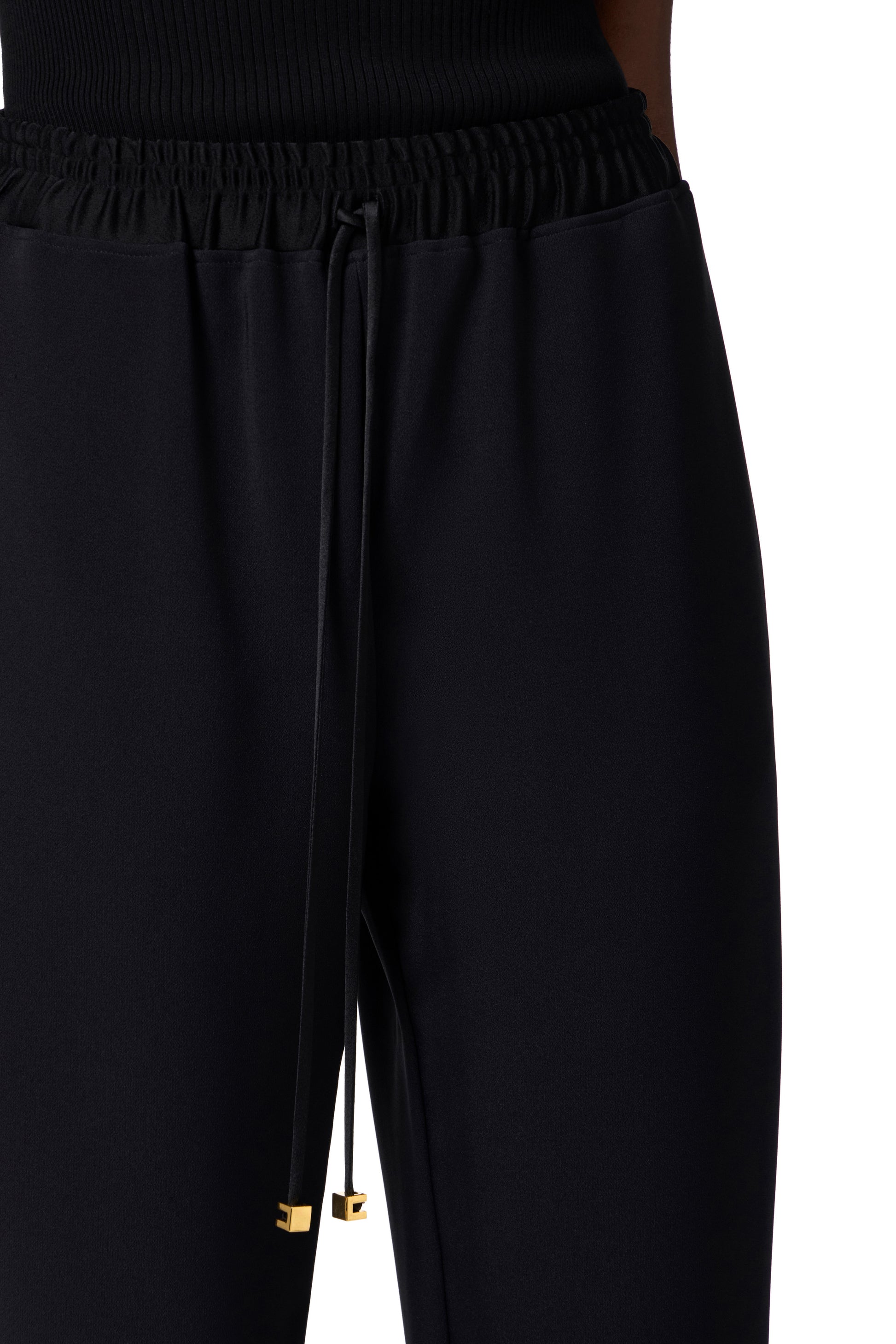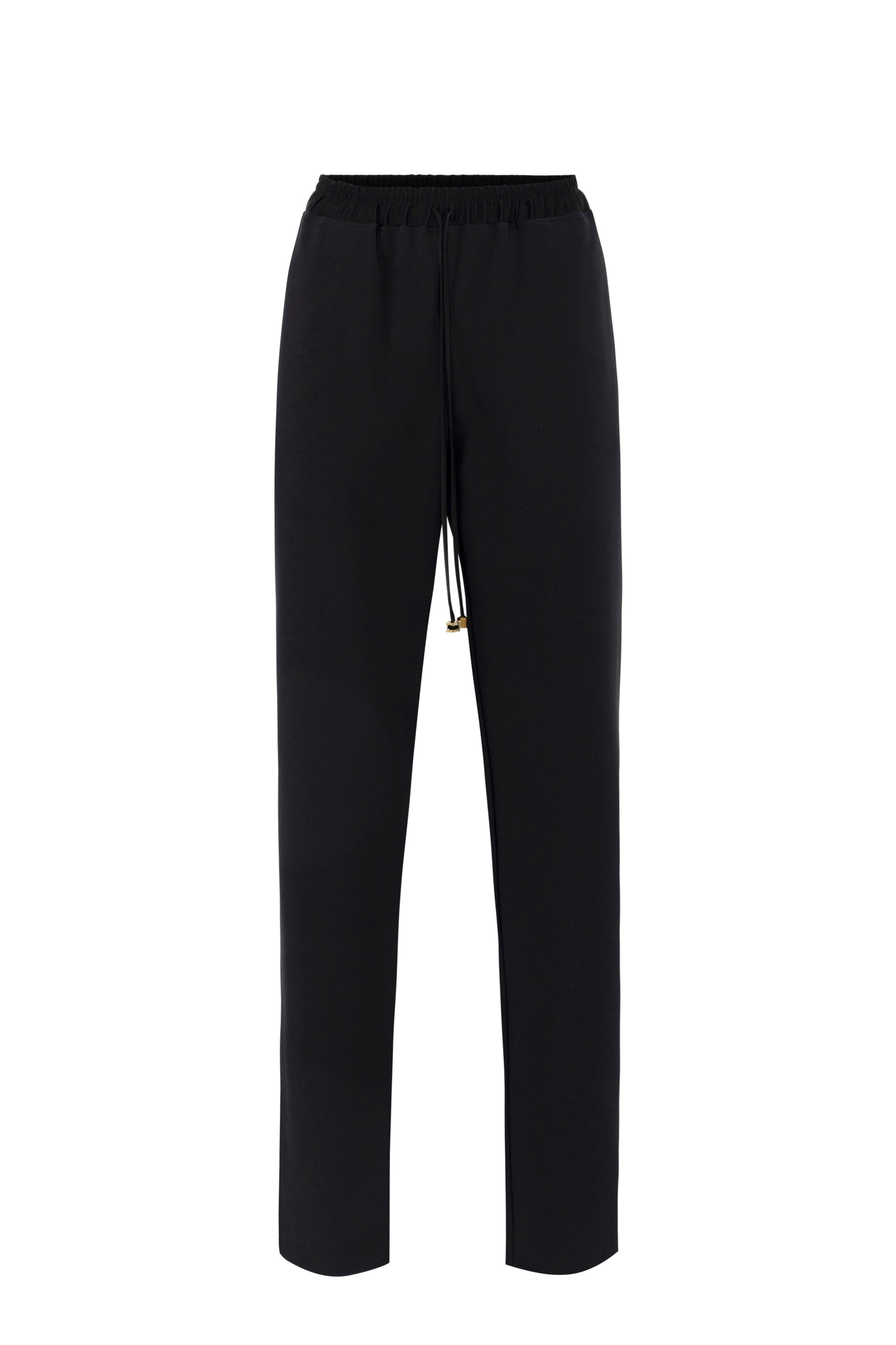 Tuxedo-style lightweight crêpe trousers with shiny satin side bands. Drawstring at the waist with cords embellished at the ends with golden metal logo. Regular fit.