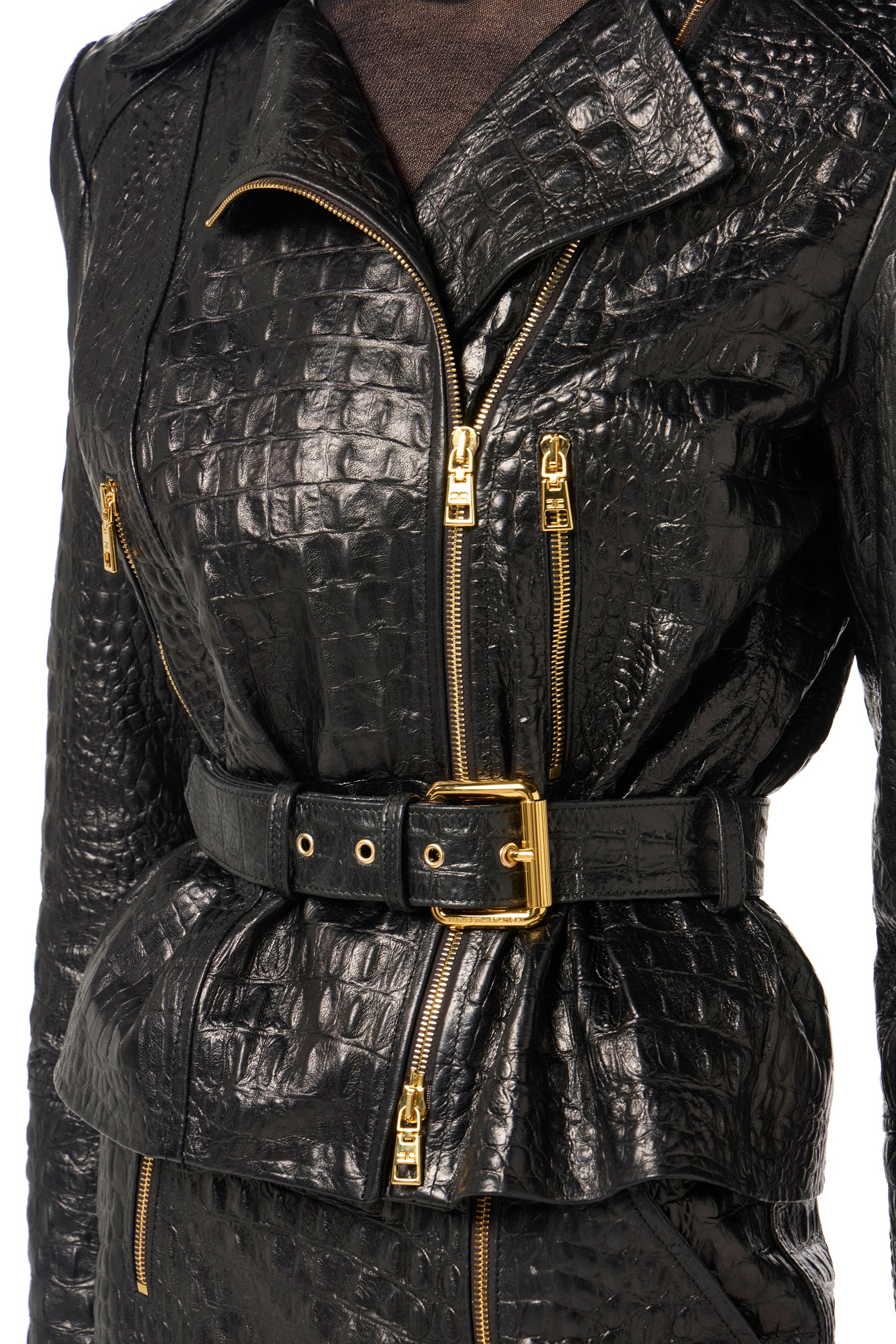Leather biker jacket with a crocodile print texture. The jacket evokes classic biker styles with lapels, pockets and asymmetrical zip closure. Reinterpreted for contemporary elegance with structured shoulders, it features a belt with buckle that enhances the waist and loop on the back. Regular fit.