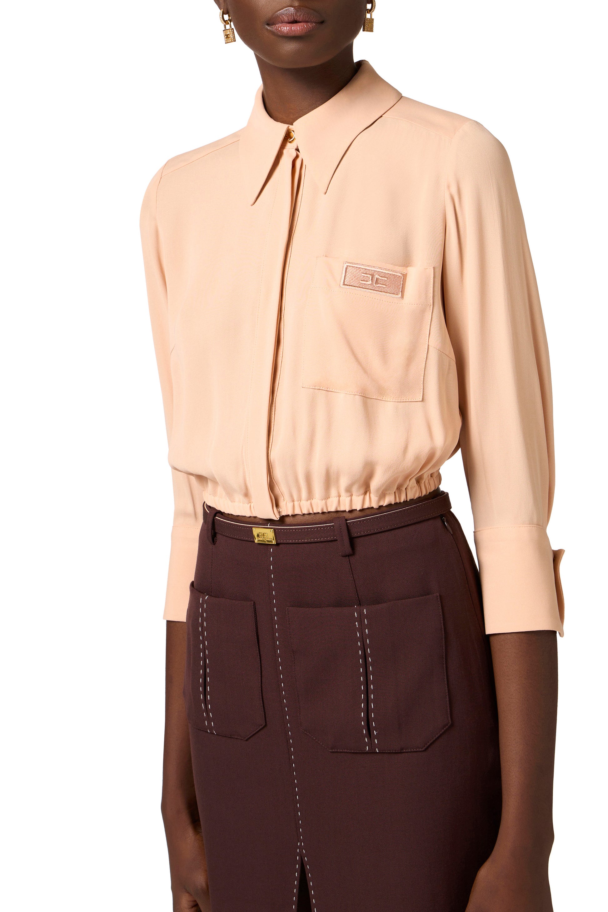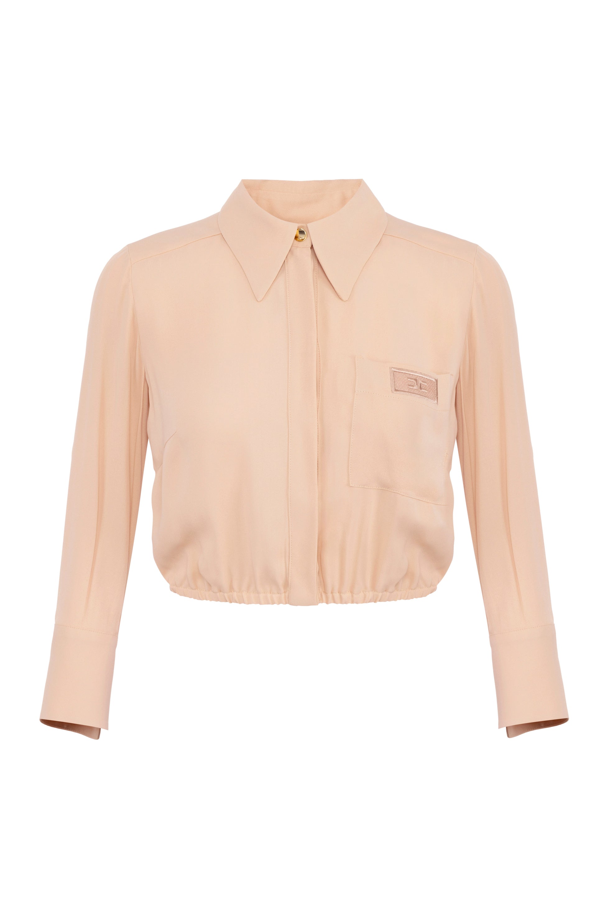 Cropped blouse in viscose georgette fabric with slim fit. The garment has ¾ sleeves and elastic at the bottom. The focus is on the breast pocket embellished with a perforated label with thread-embroidered logo. The small button placket and back yoke add definition.