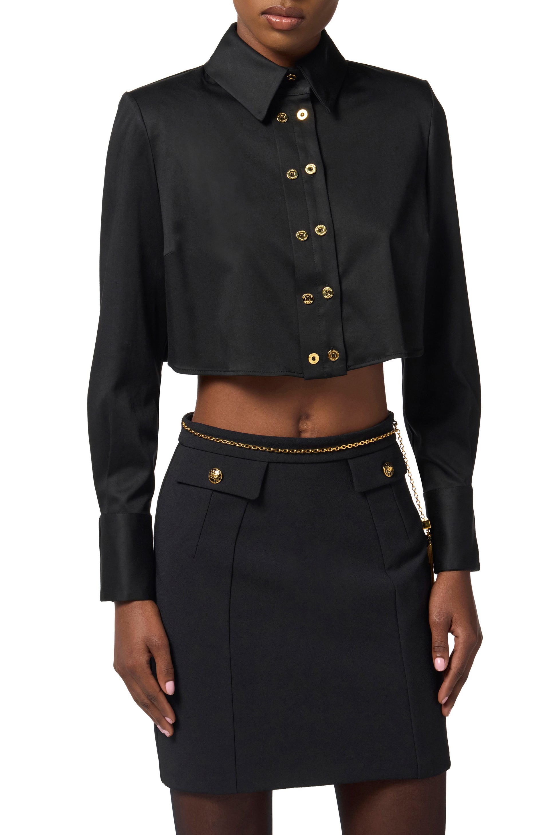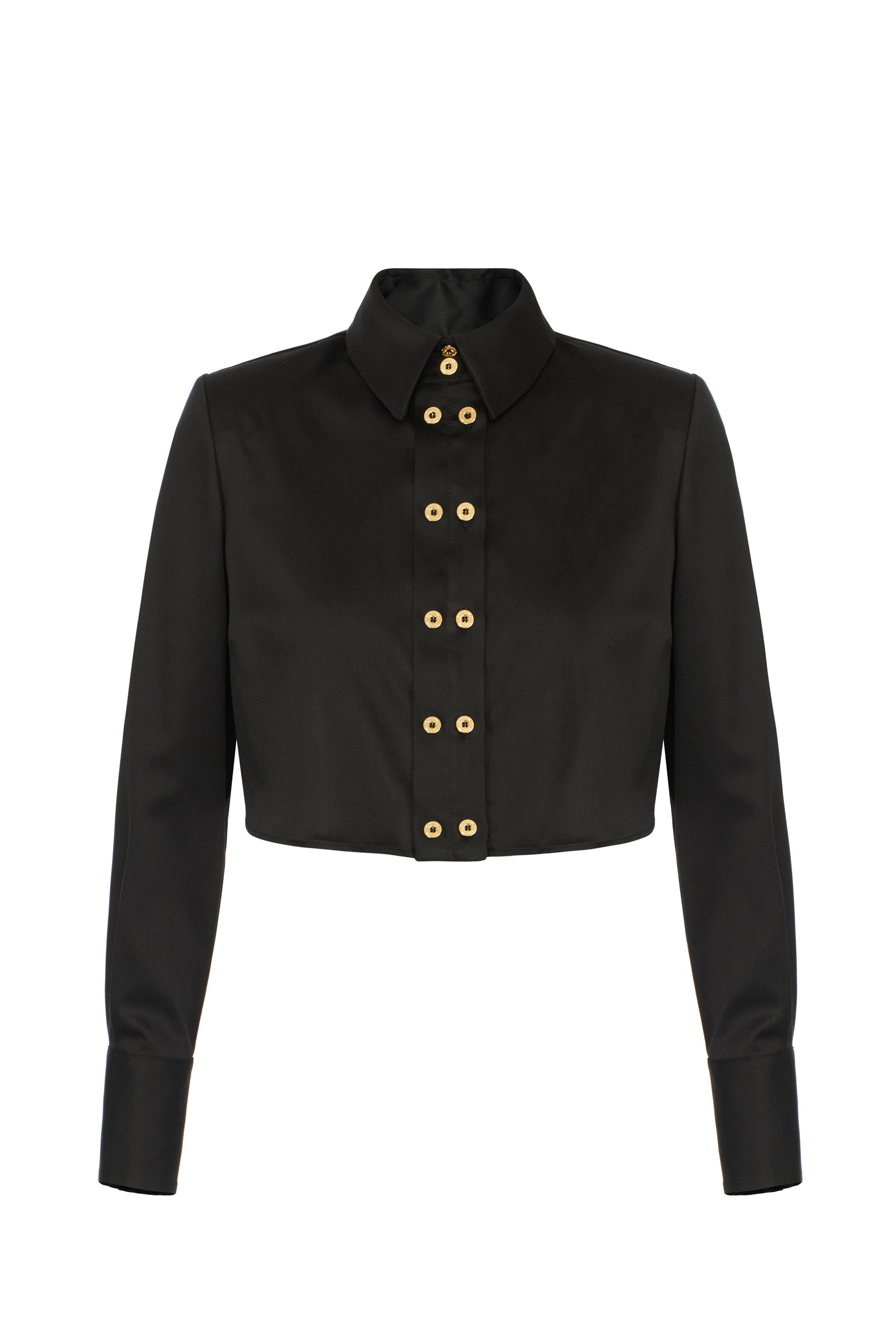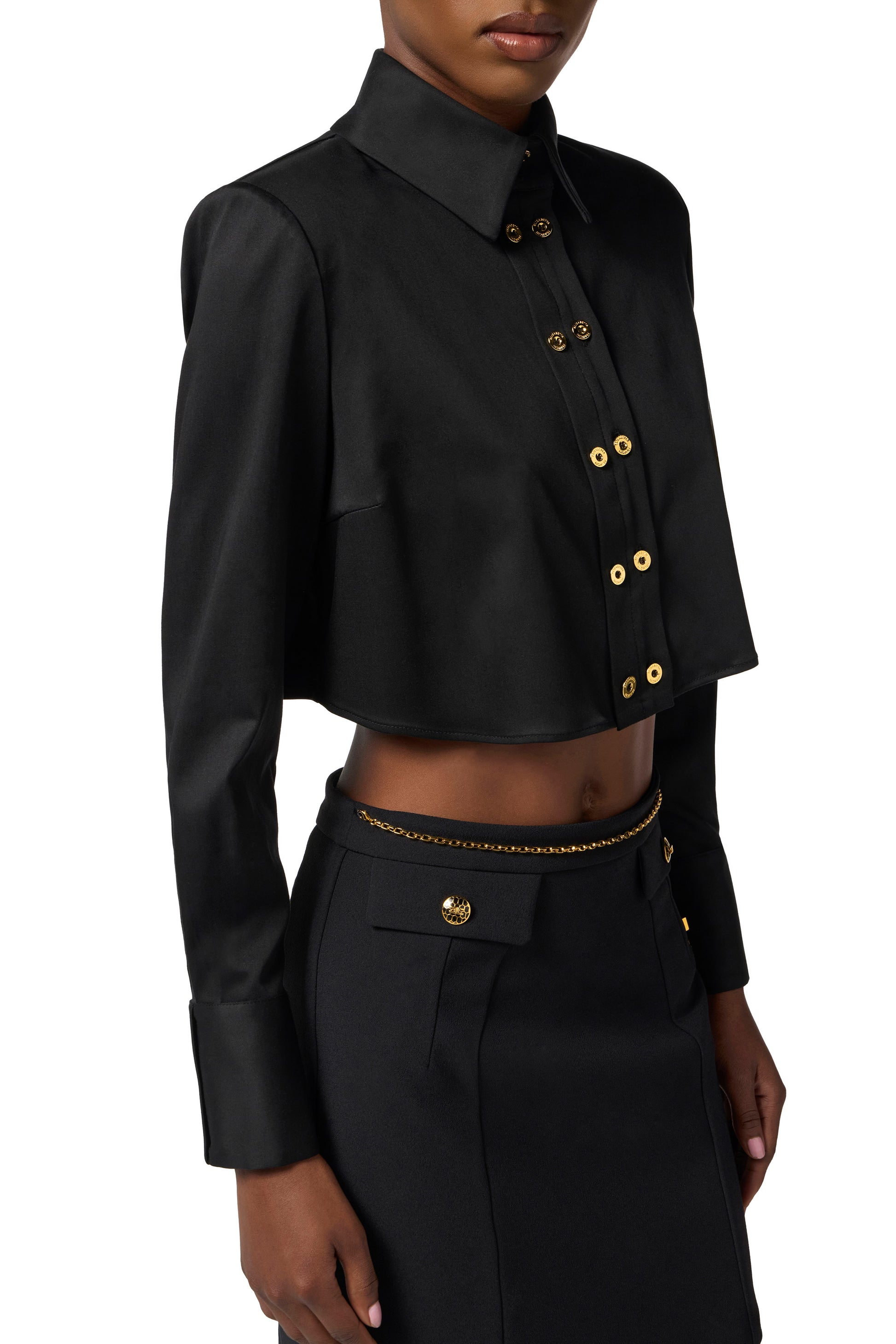 Cotton satin shirt with regular fit. With a loose and flowing weave, the garment has a classic collar and sleeves with wide cuffs. It is characterised by the cropped cut that leaves the waist uncovered and the small button placket decorated with a double row of buttons.