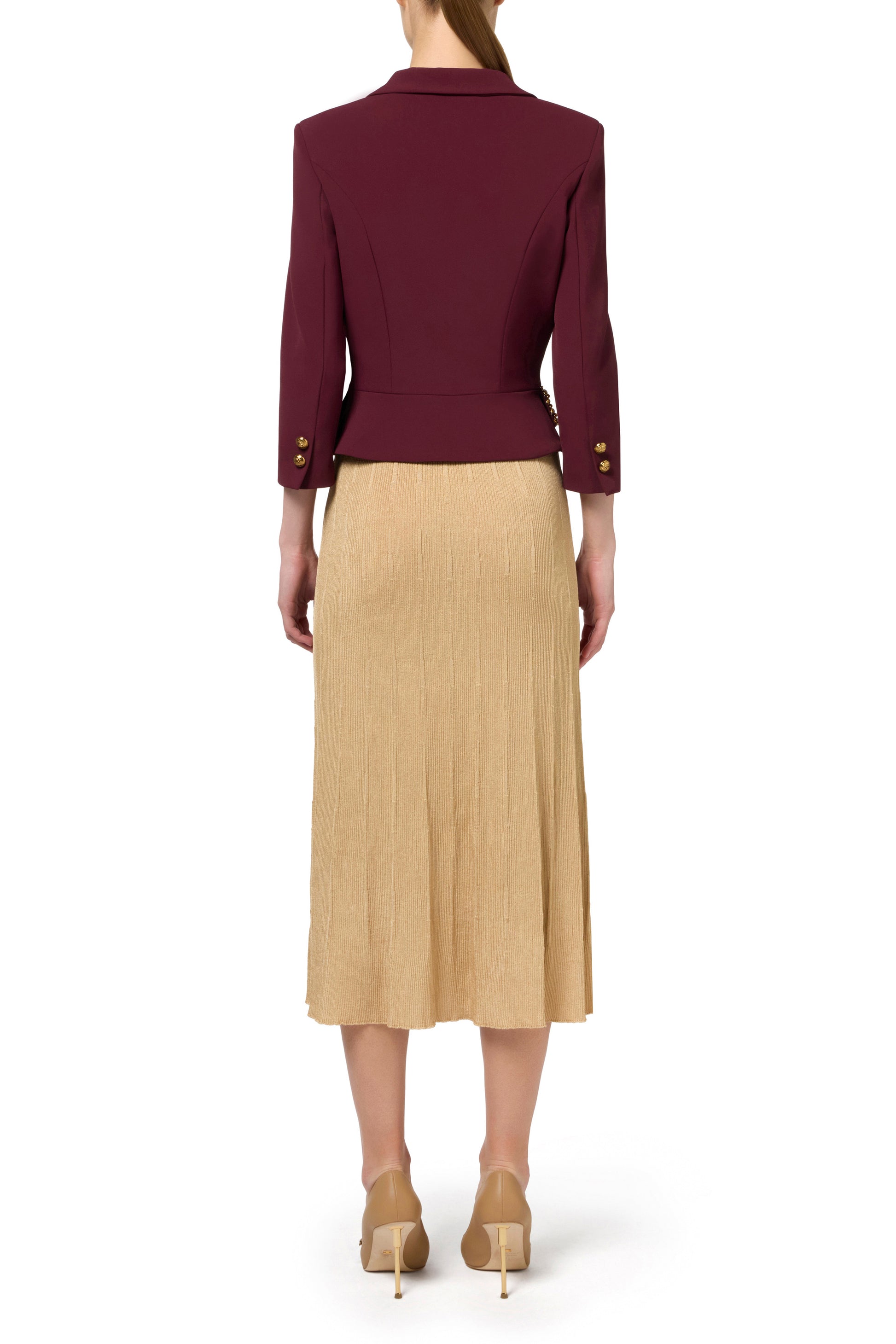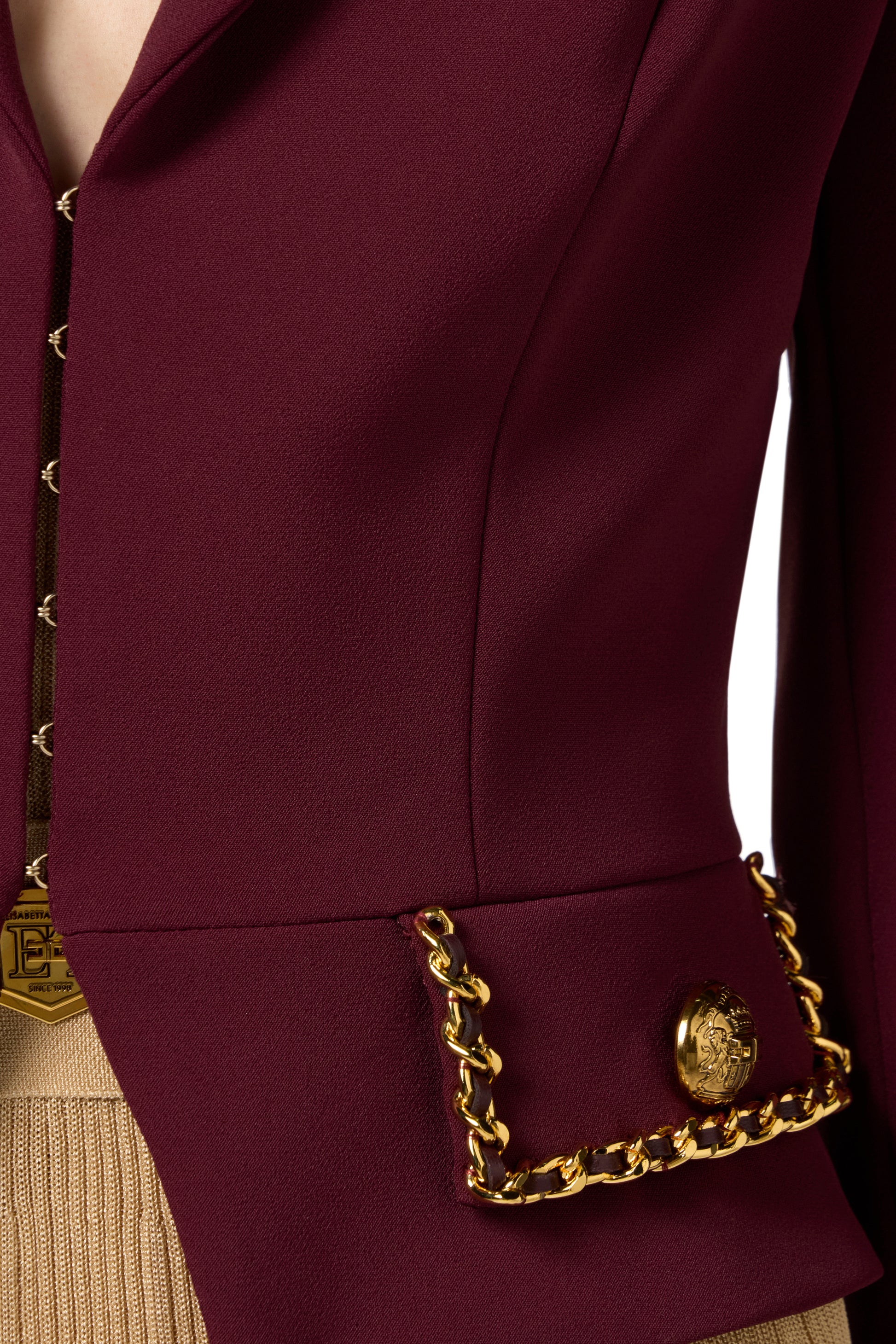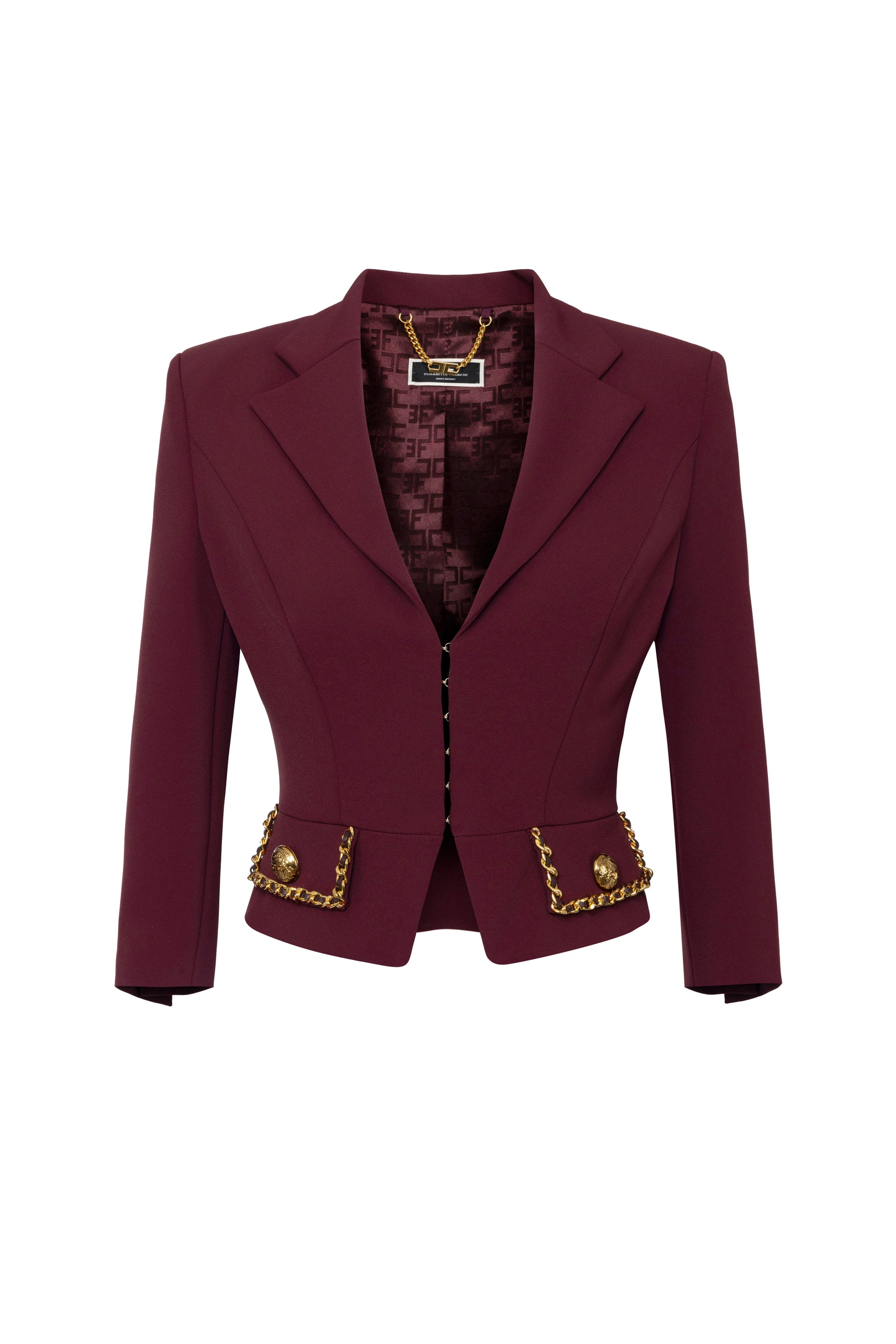Cropped jacket in double layer stretch crêpe with 3/4 sleeves and single-breasted fastening. It features a peplum with flaps trimmed with chain threaded with leather-effect synthetic material.