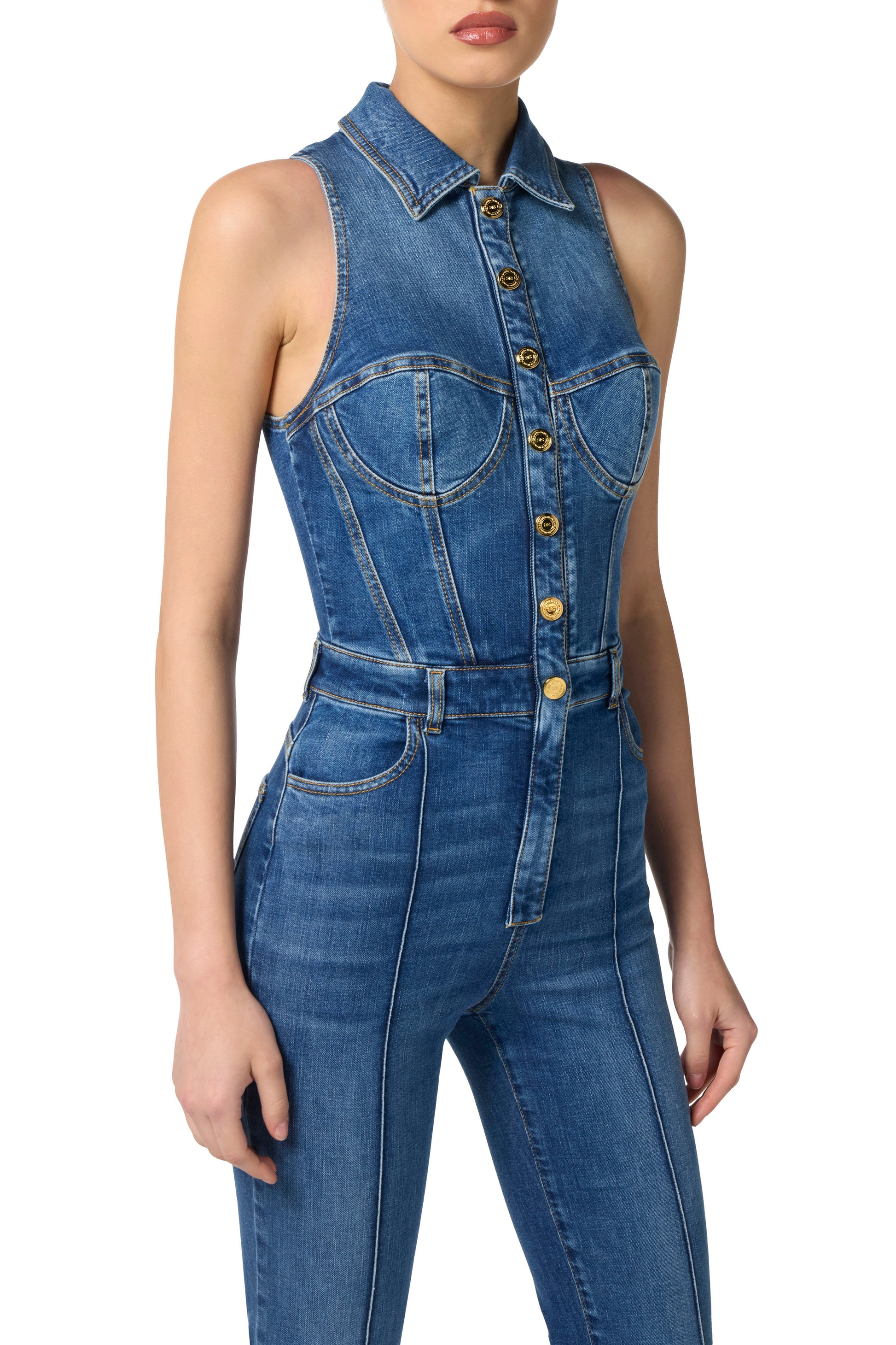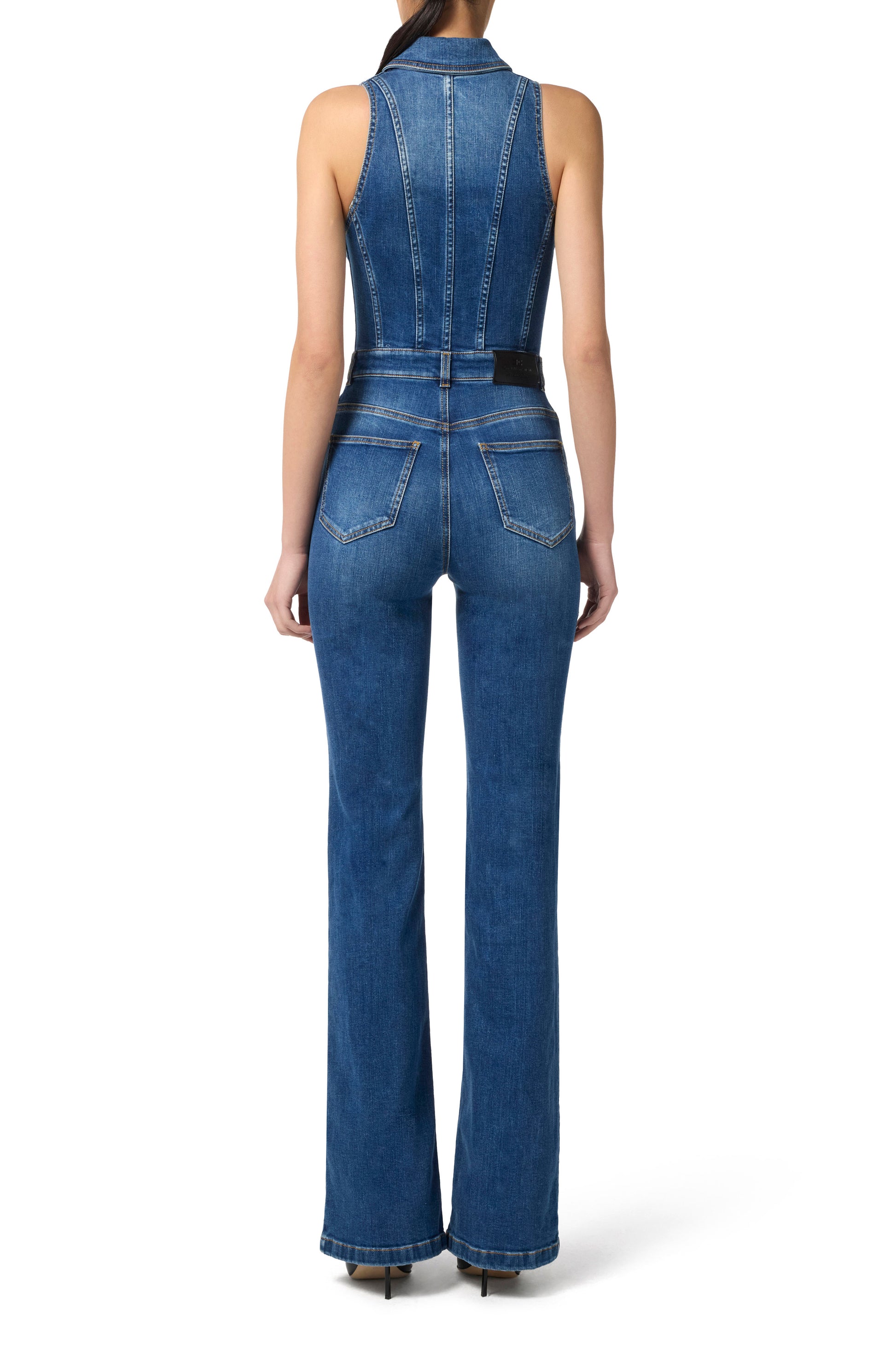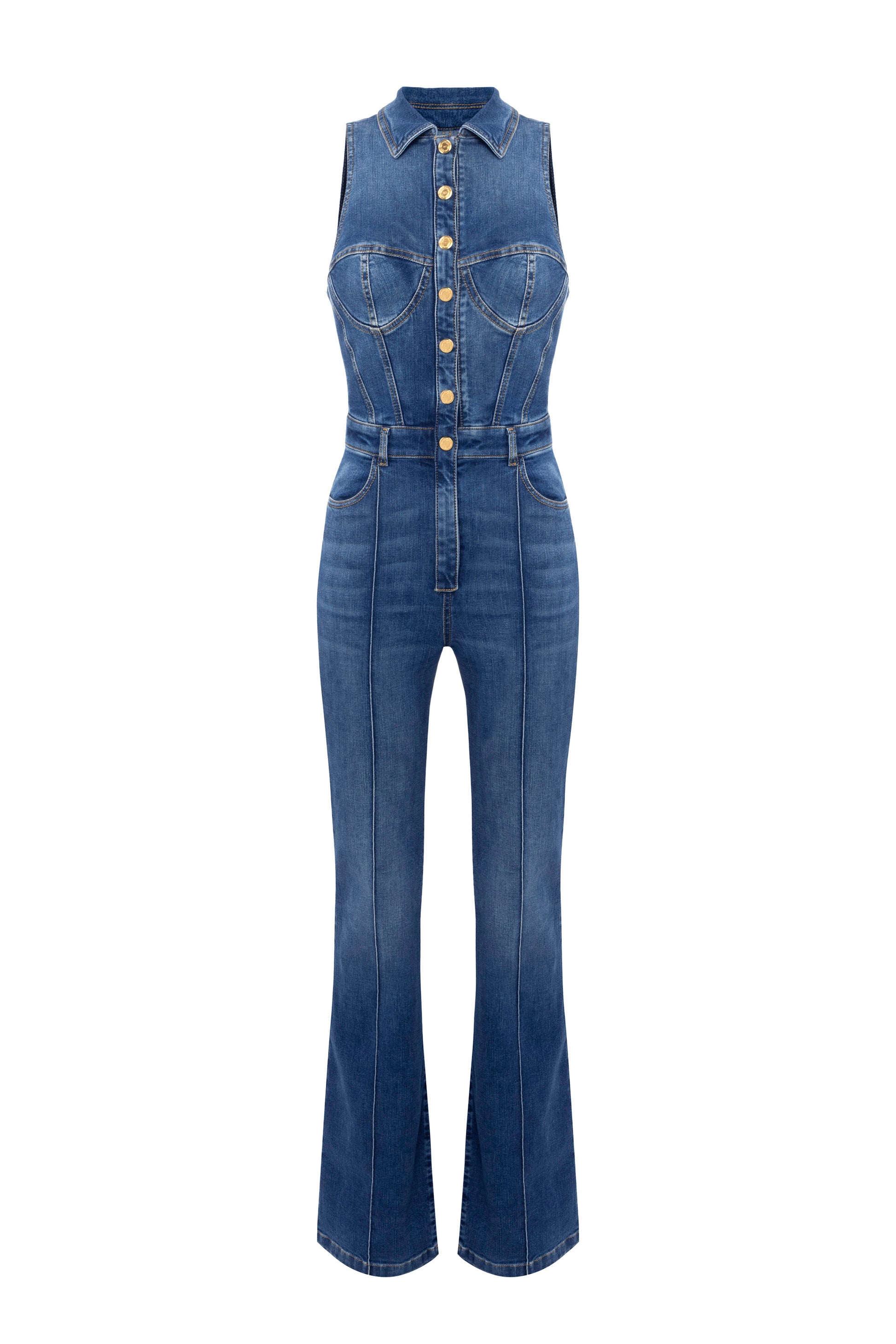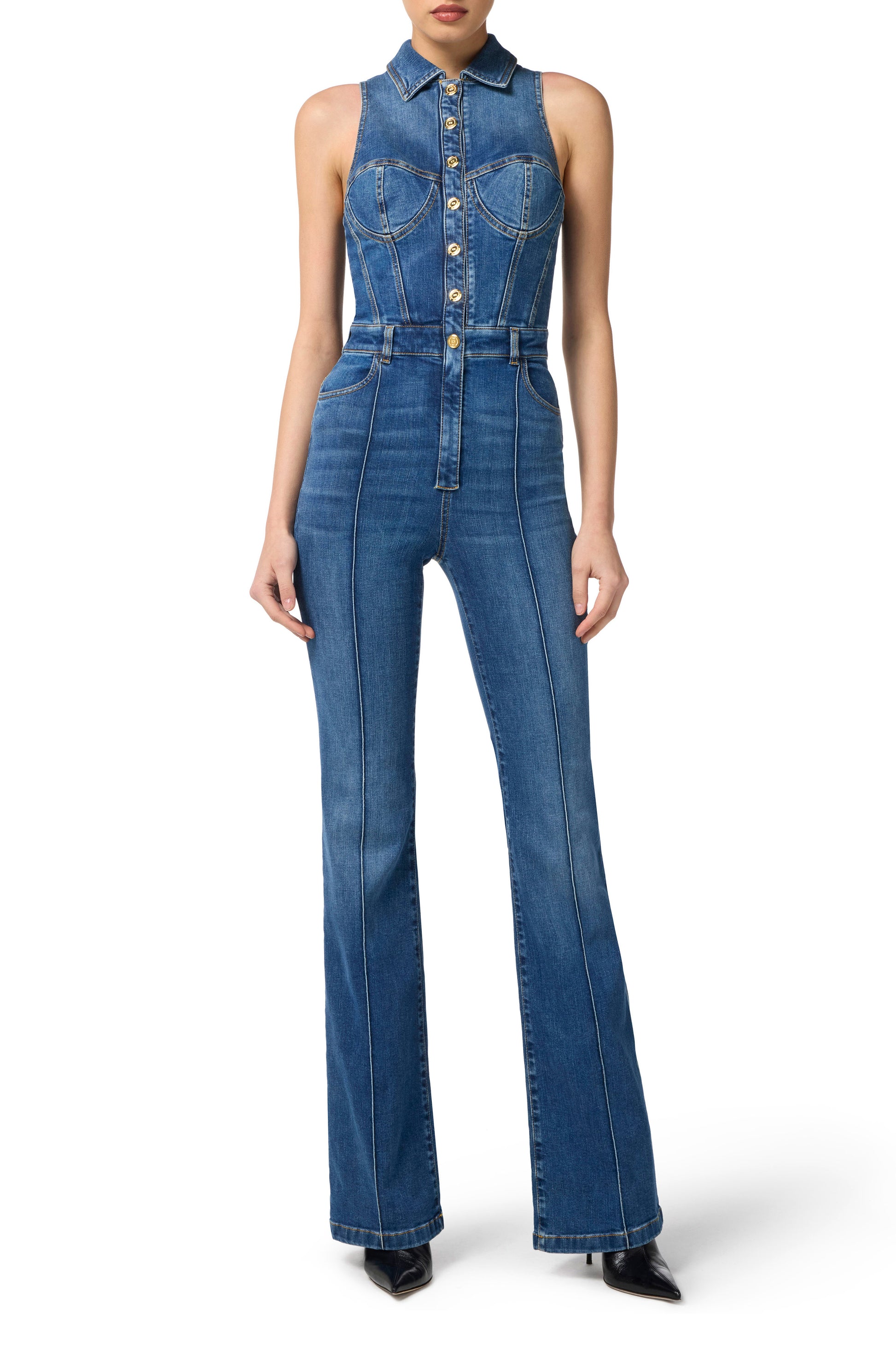 Denim jumpsuit with classic collar and halter neck. It stands out for its mix of inspirations: the double topstitching typical of denim defines the bustier cuts that design cups and hips, giving character and femininity. Boot cut trousers with central ribbing and slim fit.