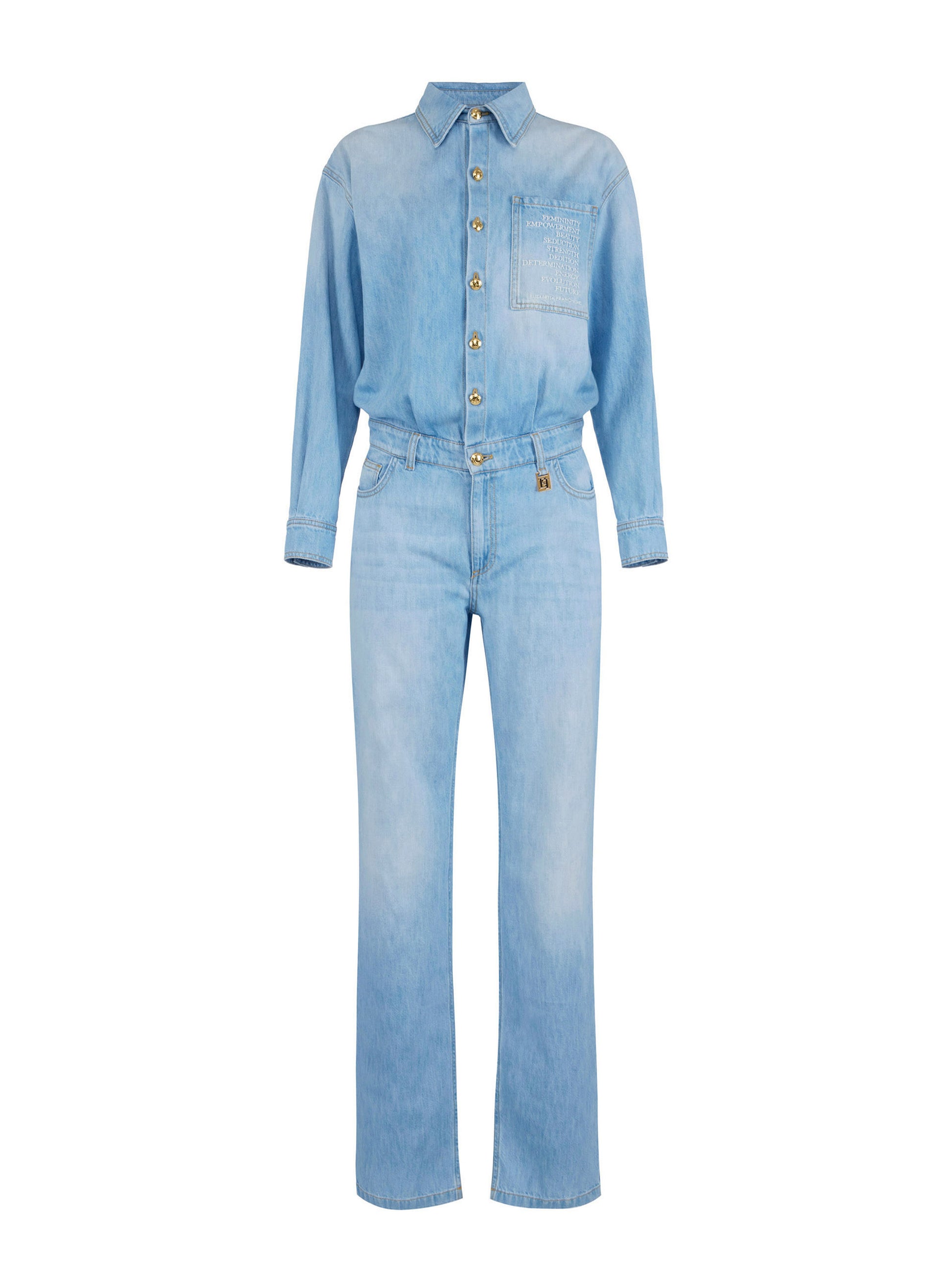 Denim jumpsuit with long sleeves, shirt collar and five-pocket trousers. It is embellished with lettering on the bust and a golden metal logo detail on a belt loop. Back pockets, one of which is decorated with a diagonal ribbon featuring the logo. Oversized fit.