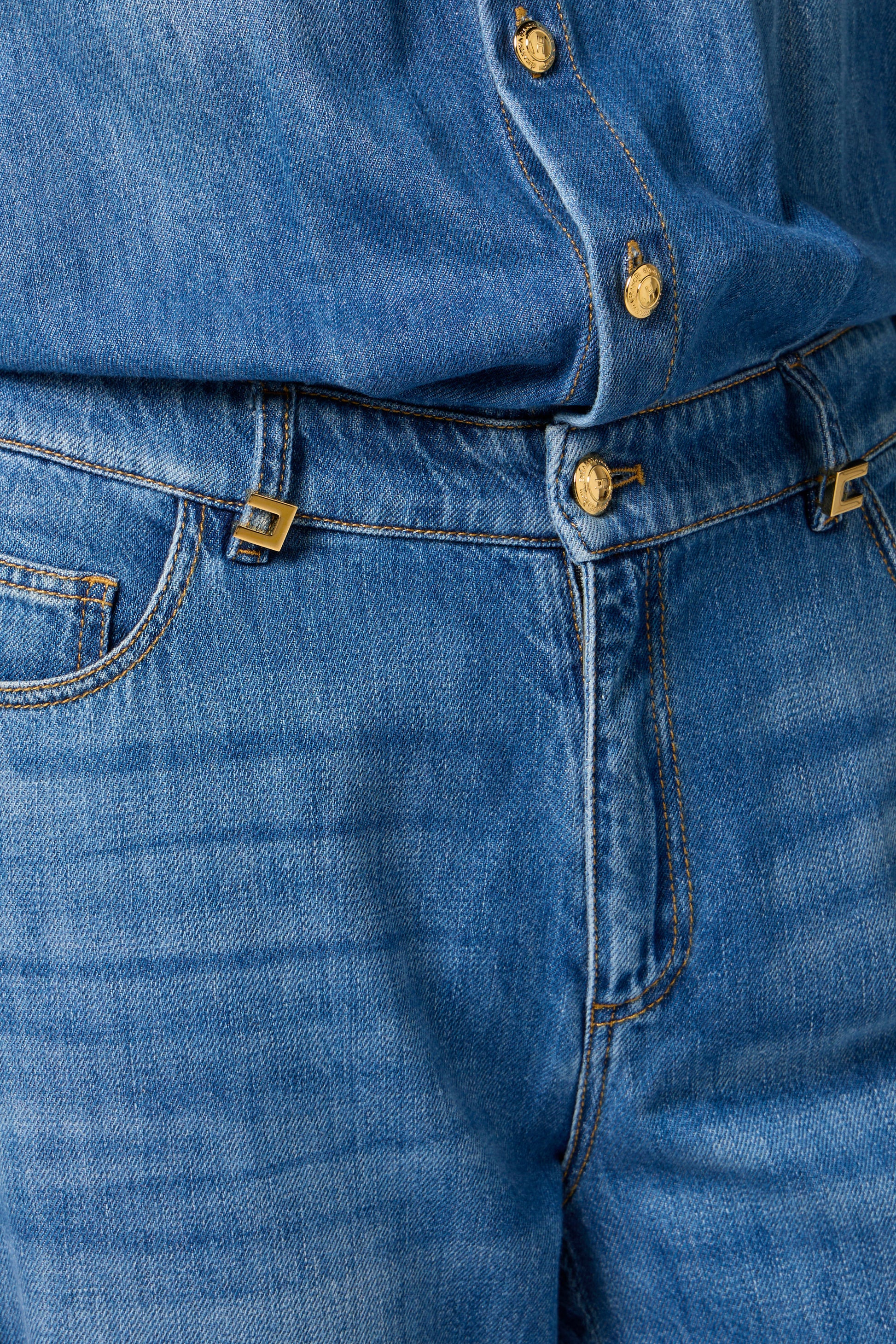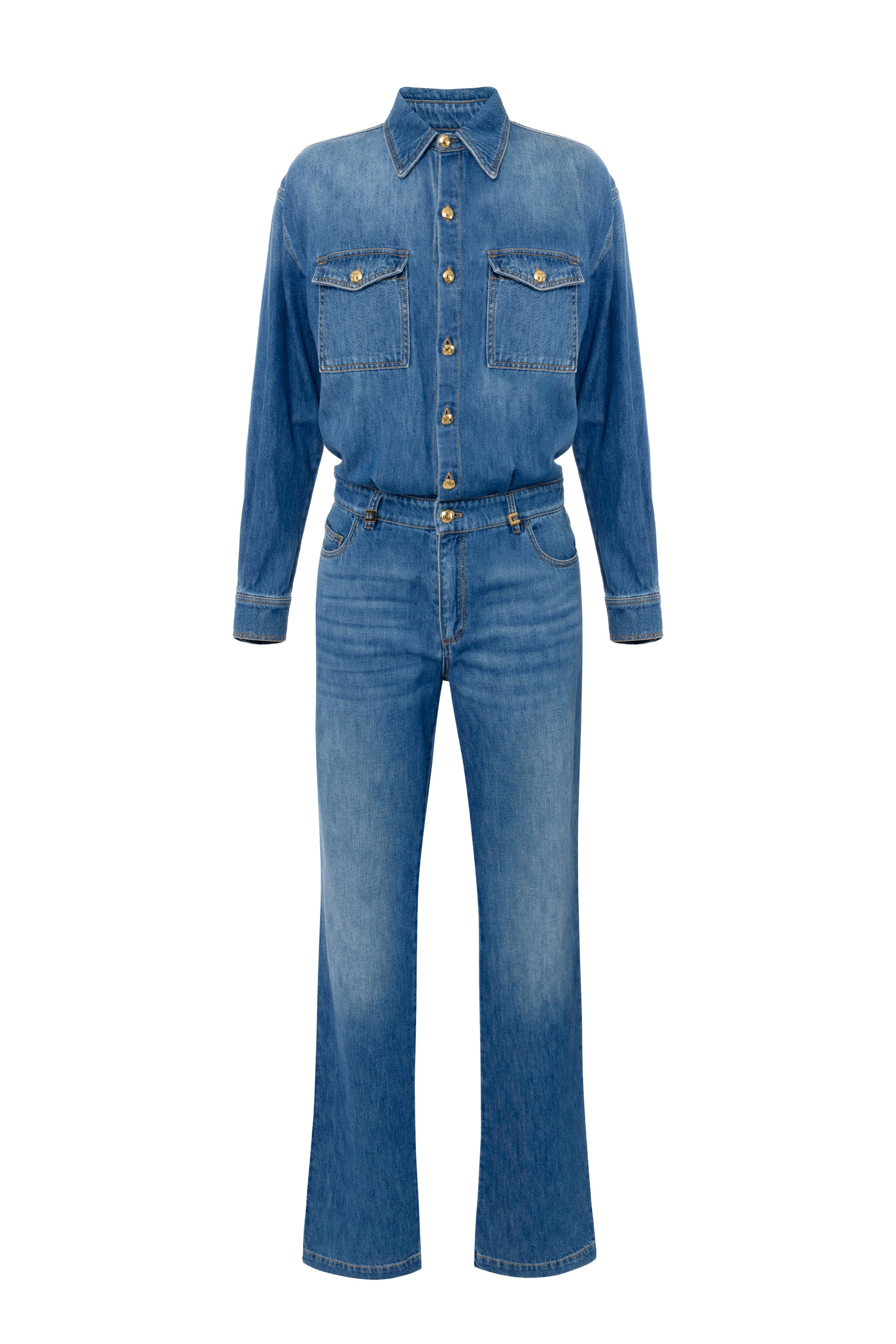 Denim jumpsuit with shirt top and palazzo trousers with low waist. The garment has a collar, long sleeves, flap breast pockets and logoed buttons. Pockets on the front and back. The jewelled details on the loops and logo label complete the garment.
