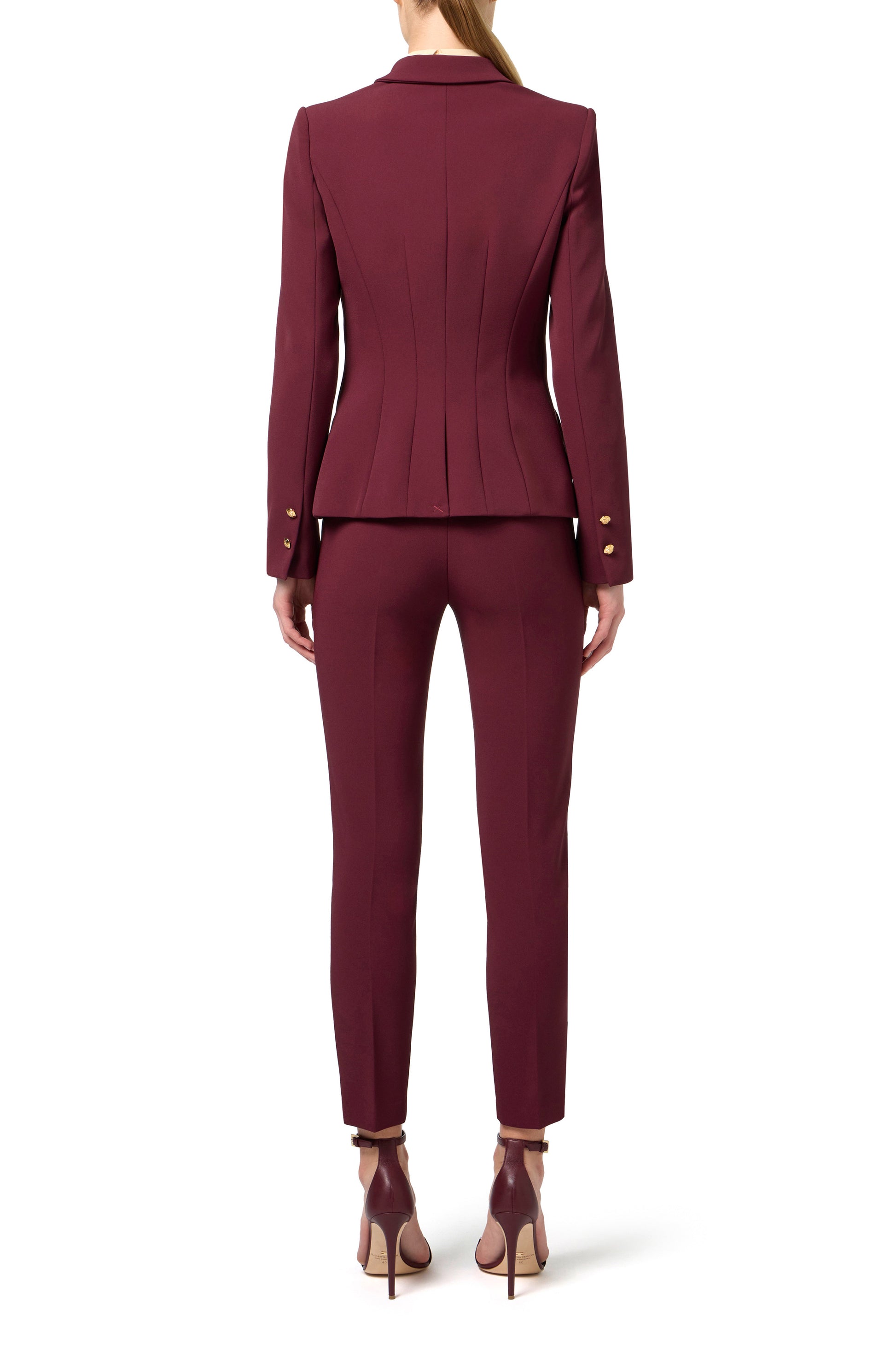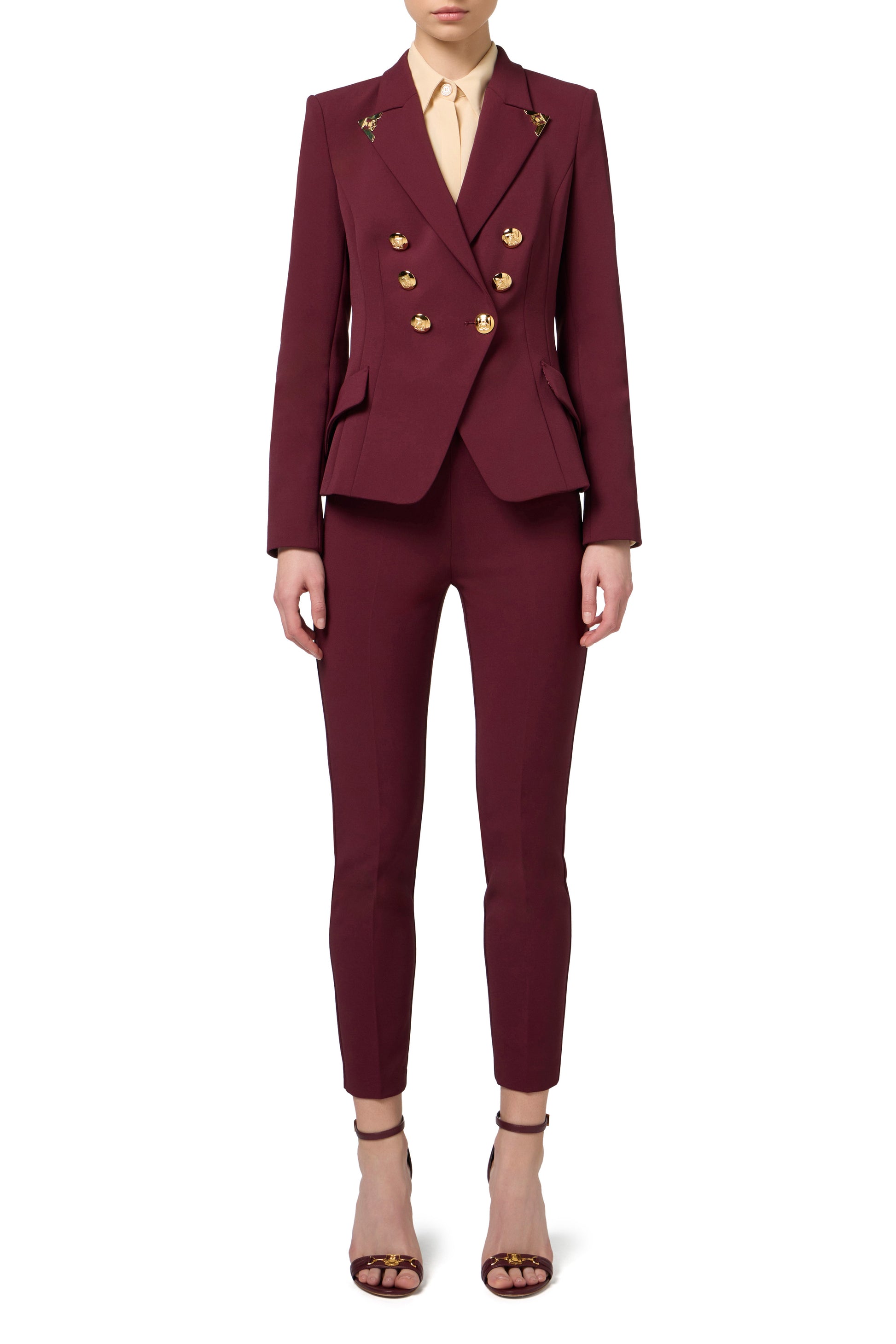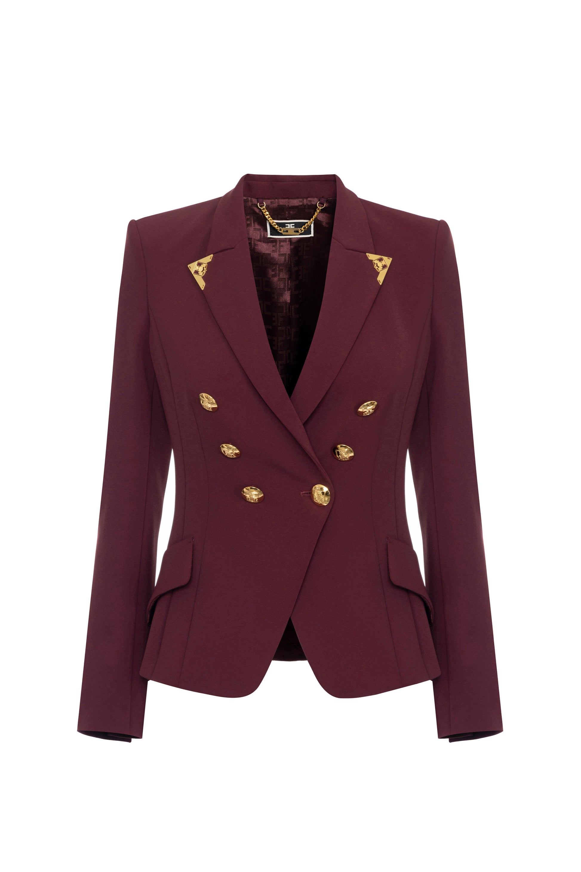 Double-breasted jacket in stretch crêpe with front flap pockets. It is characterised by golden metal buttons and perforated lapel tips decorating the peak lapels.