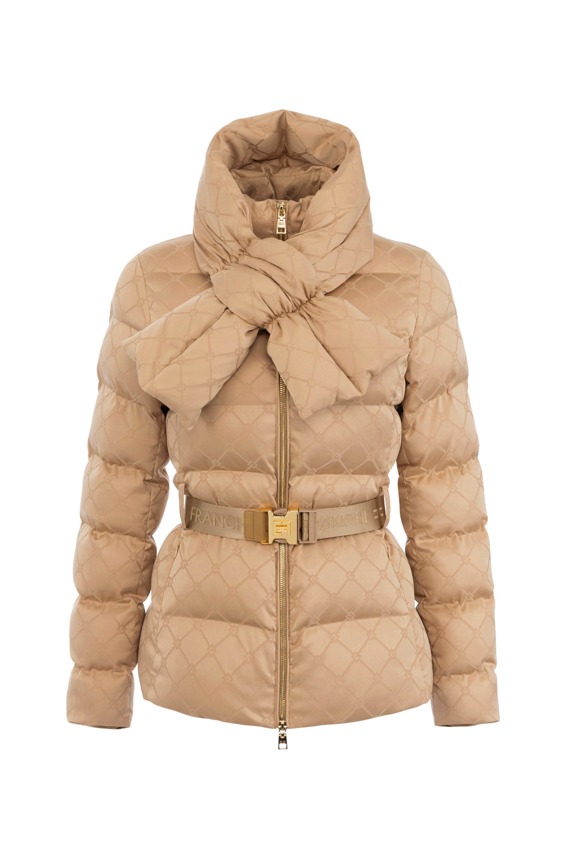 Down jacket in jacquard voile fabric with belt
