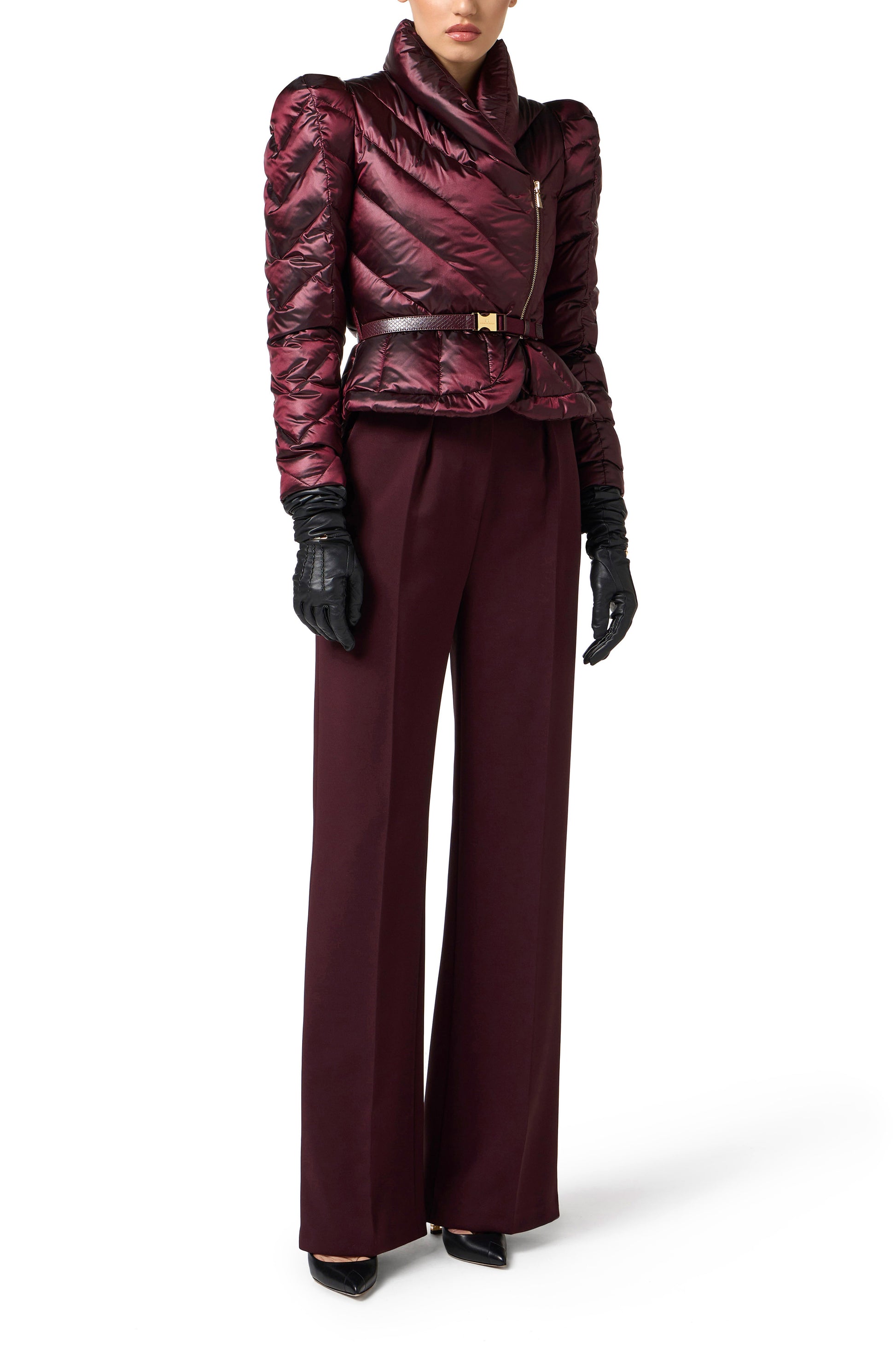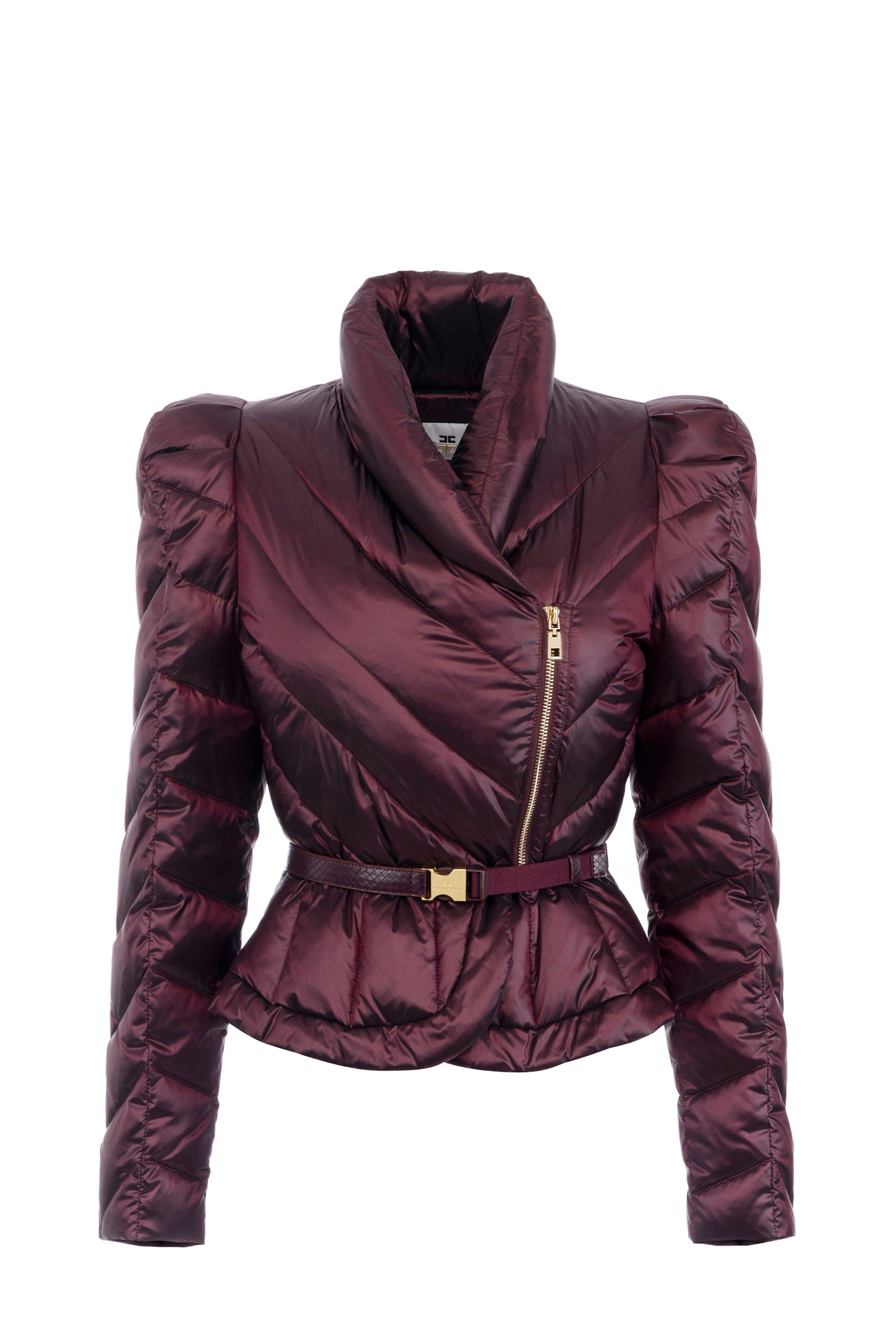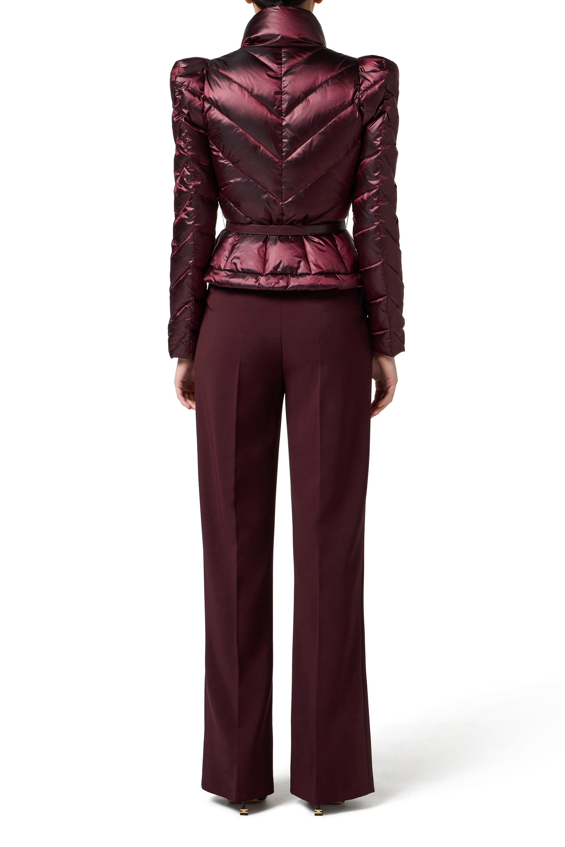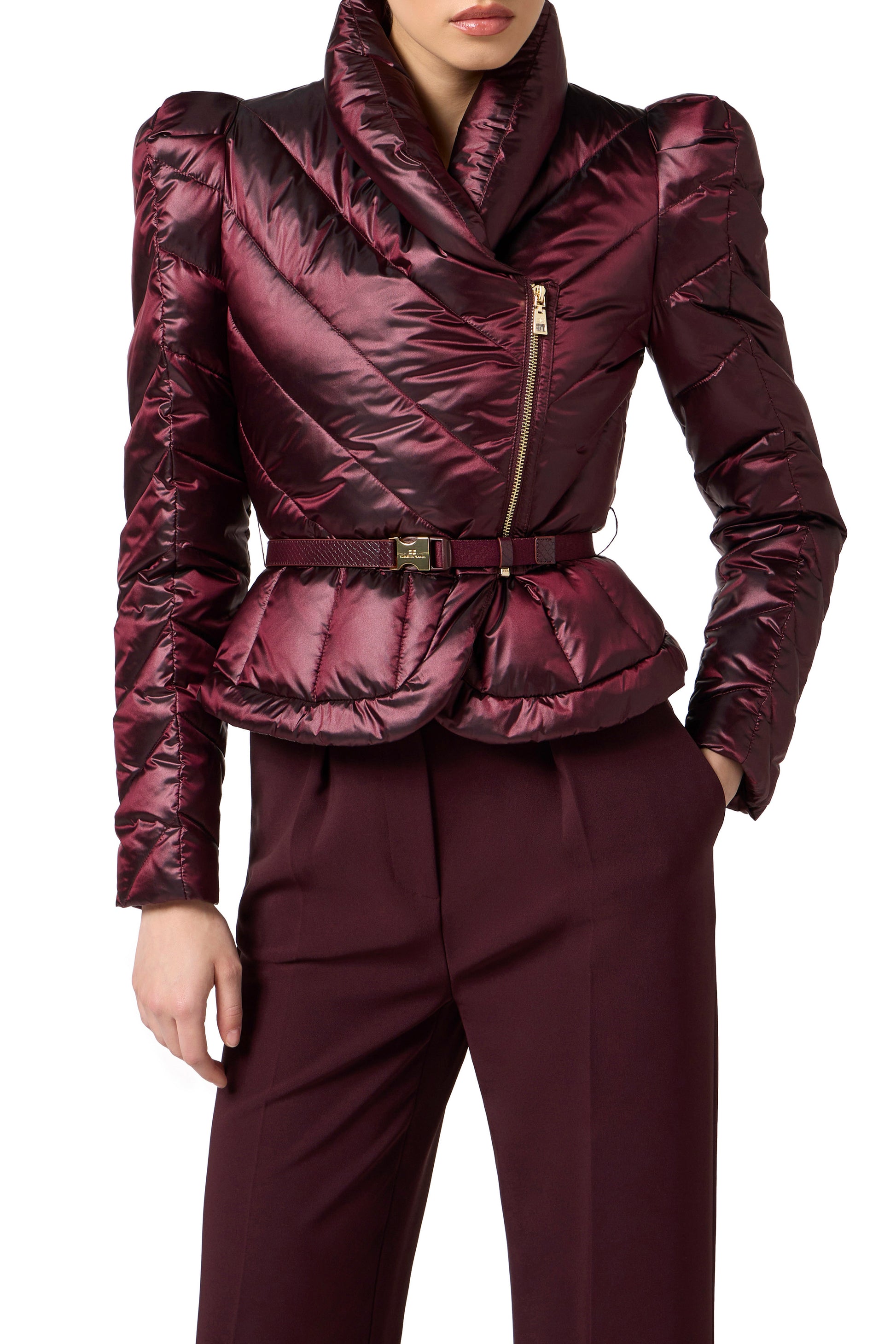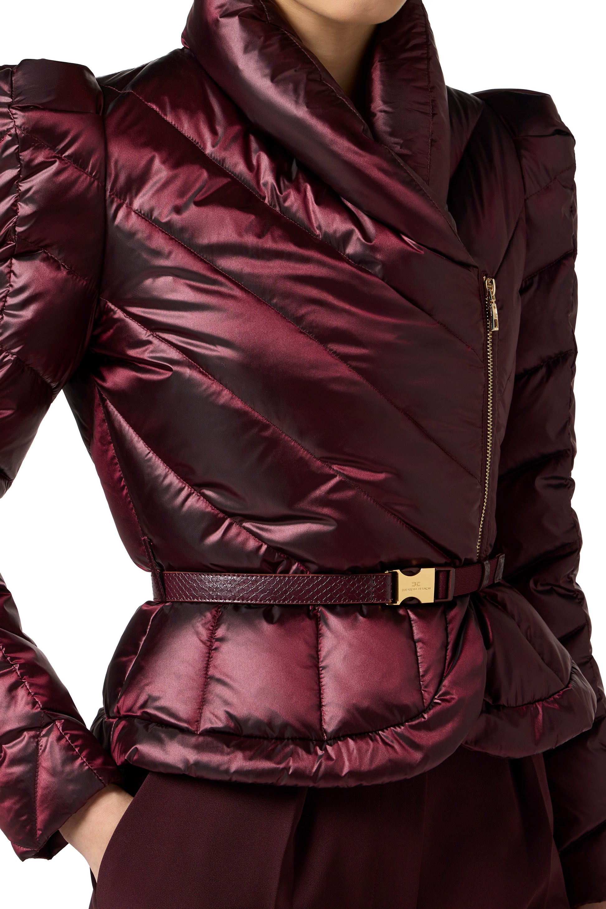 Short down jacket in voile fabric with a luminous iridescent texture. Padded and quilted with chevron patterns, it is characterised by a high overlapping collar and sleeves with rounded shoulders with delicate gathers. The peplum defined by the belt with buckle enhances the feminine line of the garment. Slim fit.